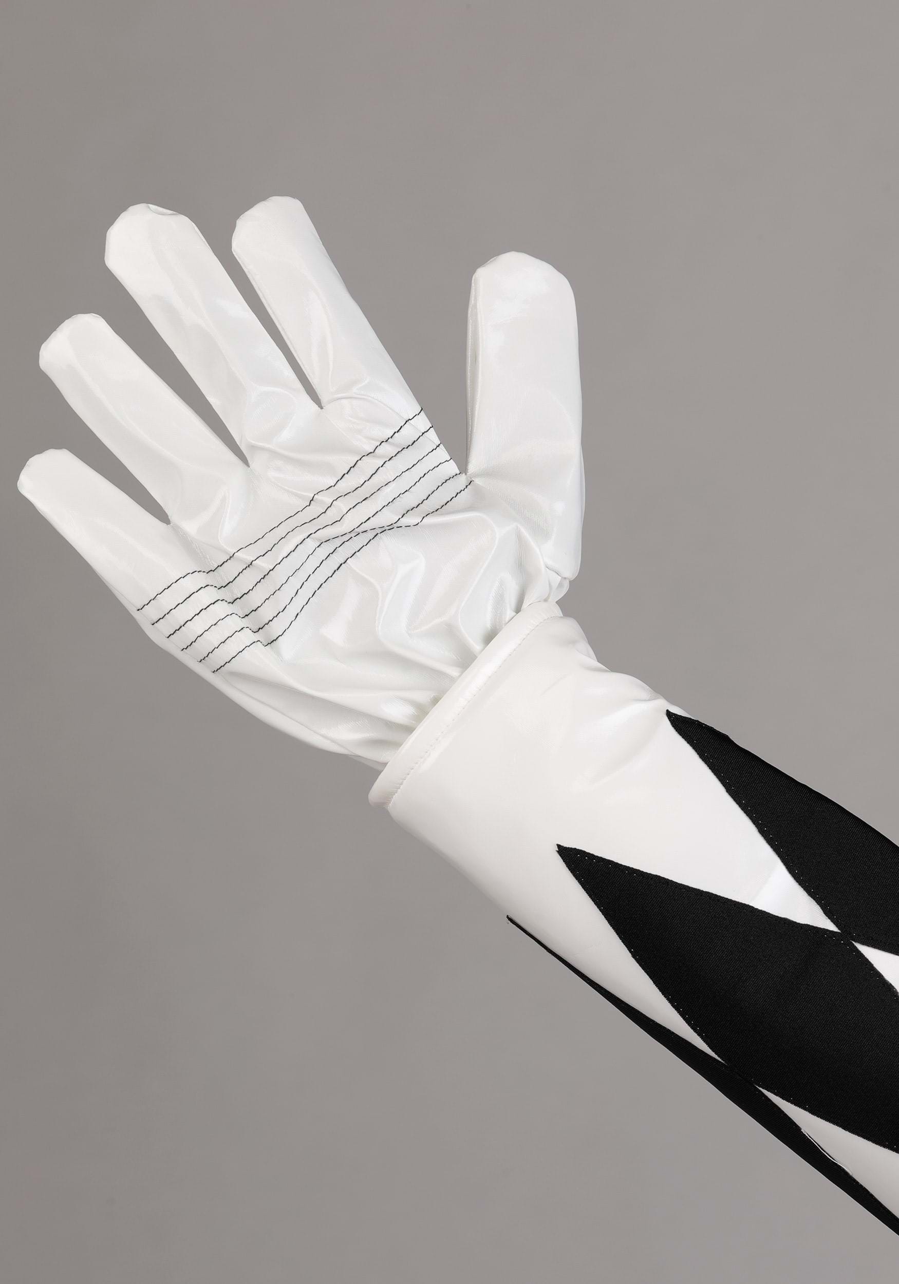 The centerpiece is a sleek, spandex jumpsuit with a back zipper and that iconic black and white diamond design. It’s made to stretch and move as easily as you do—even mid-high kick. The faux leather wrist guards and boot covers are foam-backed for structure and comfort, and they secure easily with elastic bands and hook-and-loop fasteners.