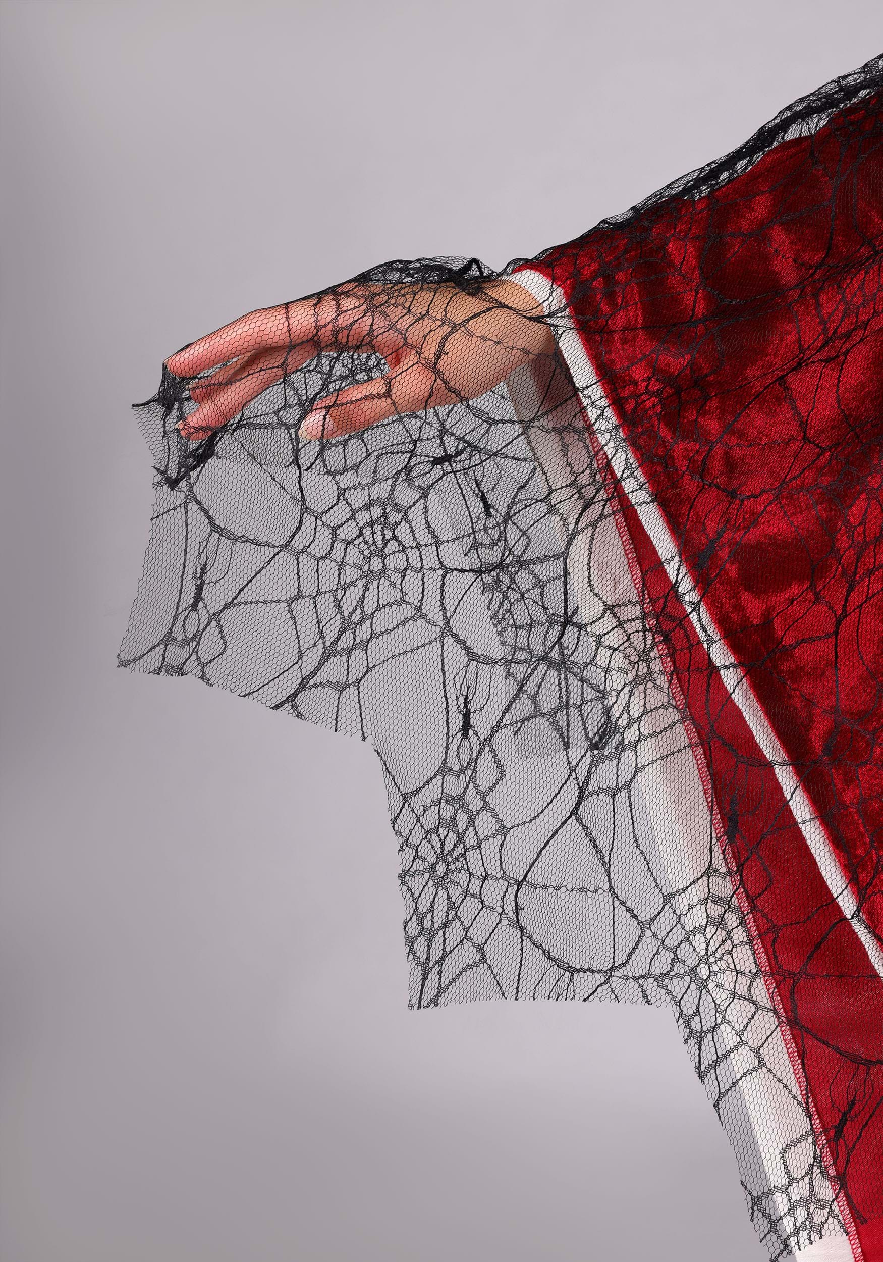 This is an exclusive Adult Black Sheer Cobweb Costume Cape.