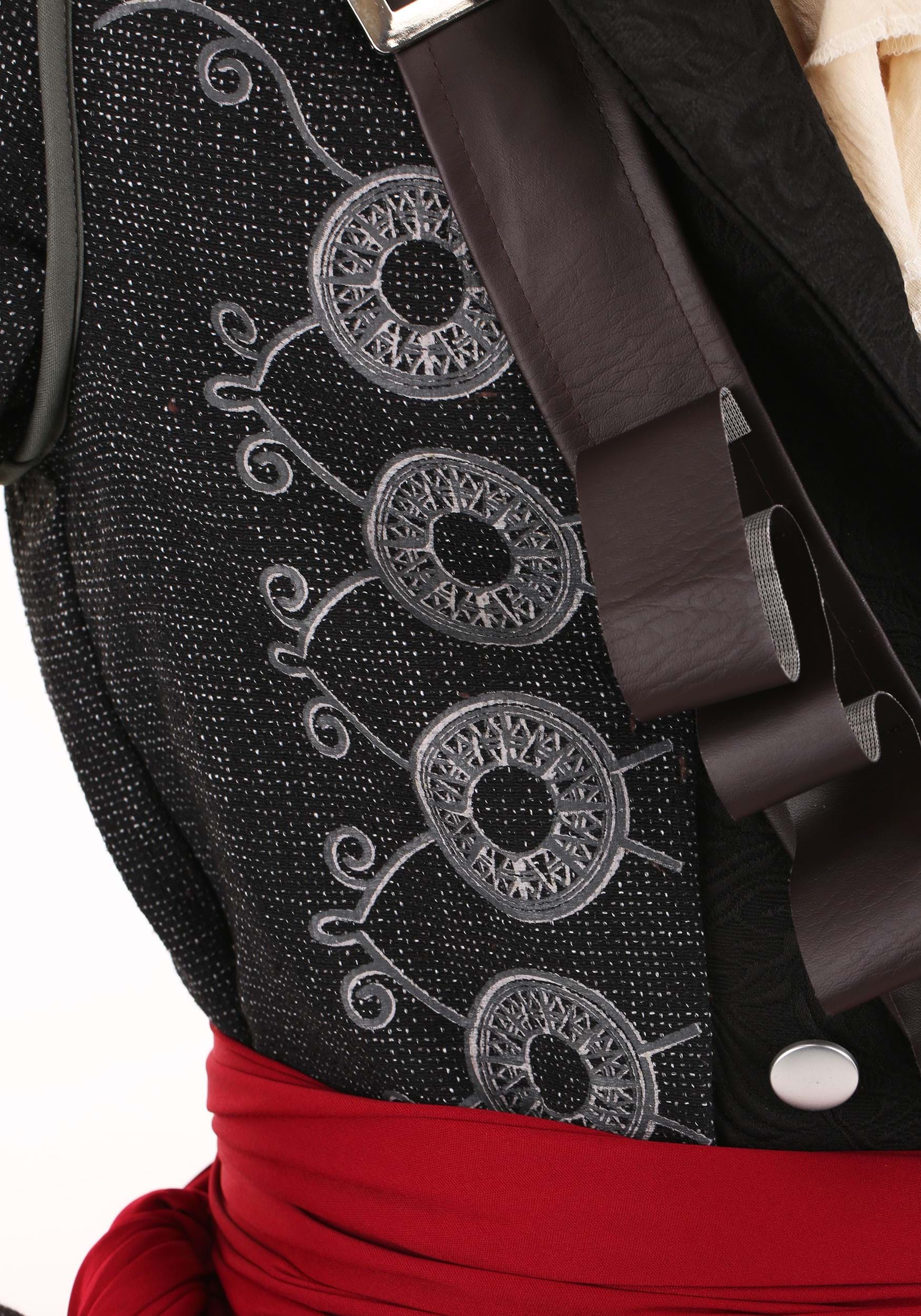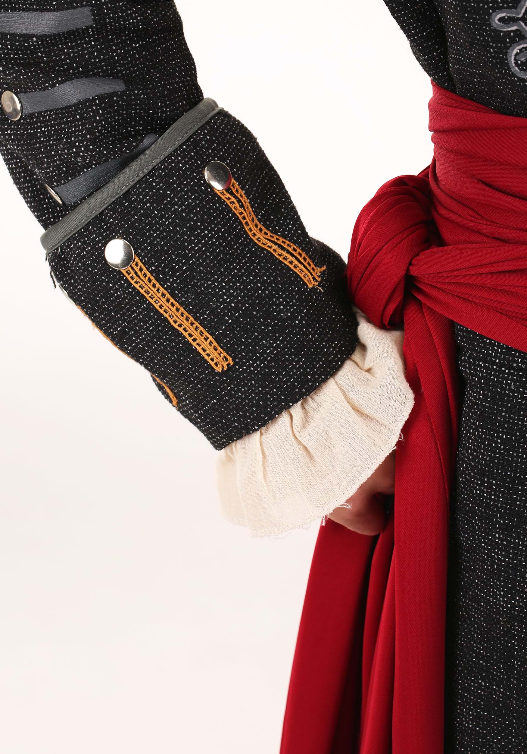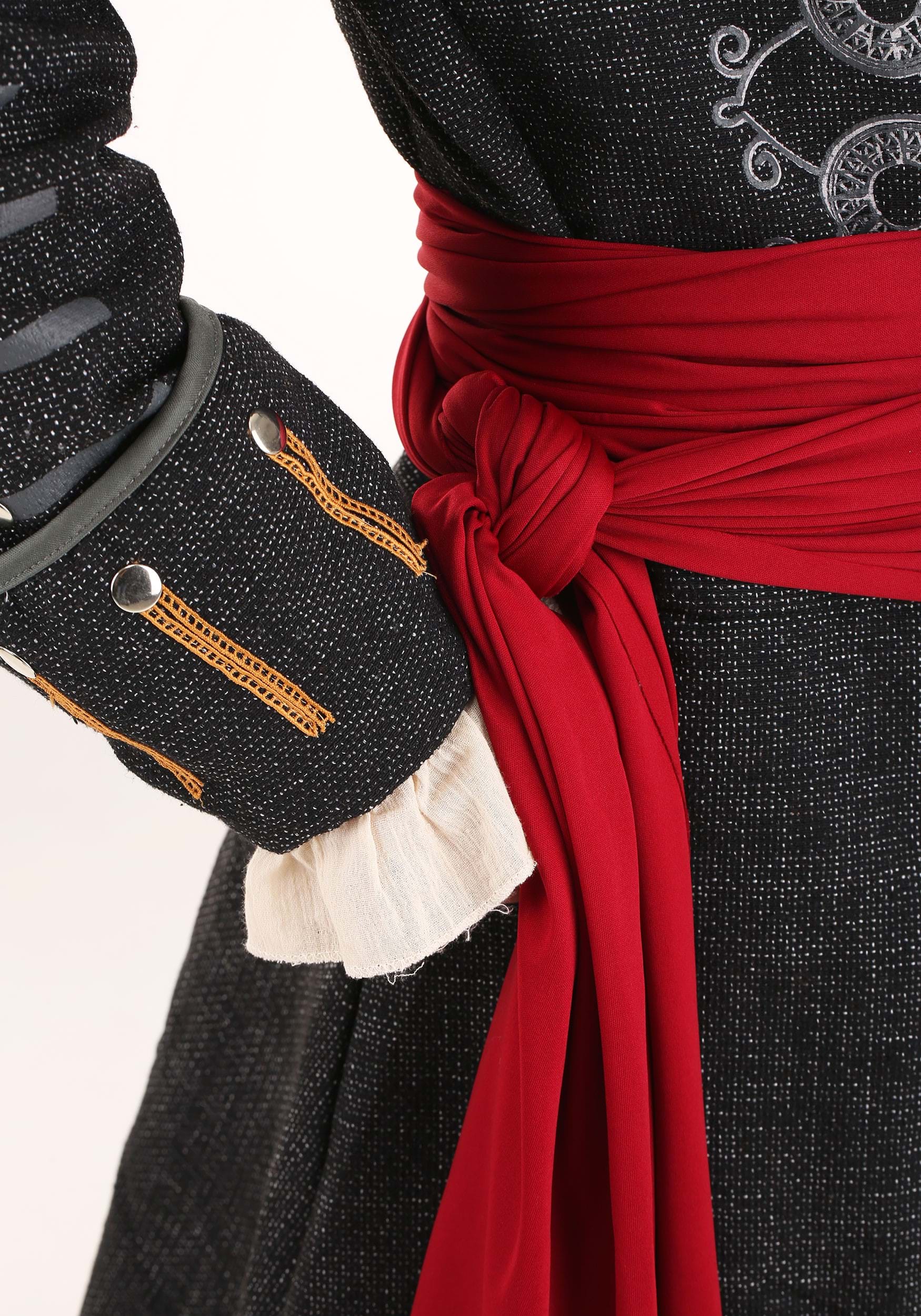 The centerpiece of this costume is the long black jacket, richly detailed with silver-tone accents and faux-leather trim at the cuffs. It’s structured enough to feel tailored but loose enough to wear over whatever treasure-hunting ensemble you’ve got underneath. The included jabot fastens around the neck for that essential 18th-century flair, while the wide red sash ties around the waist to break up the dark tones with a pop of color (and concealed knife energy).