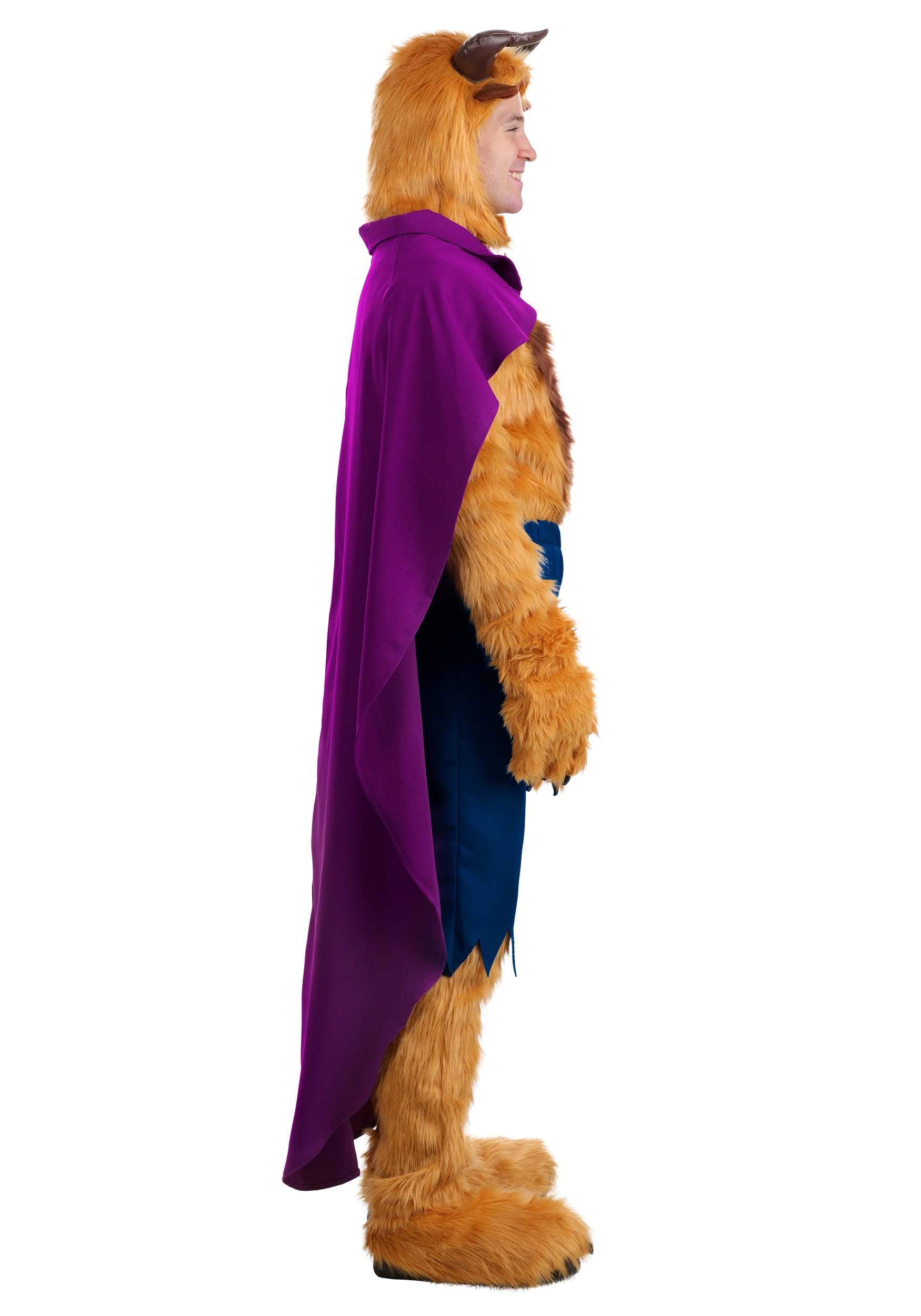This Deluxe Beast Costume features a faux fur shirt and pullover headpiece with plush fabric and fiberfill stuffed horns. The blue woven pants include furry lower legs for an authentic look, while the flowing purple cape secures with a molded clasp. Faux fur gloves and shoe covers round out this Disney-licensed outfit.