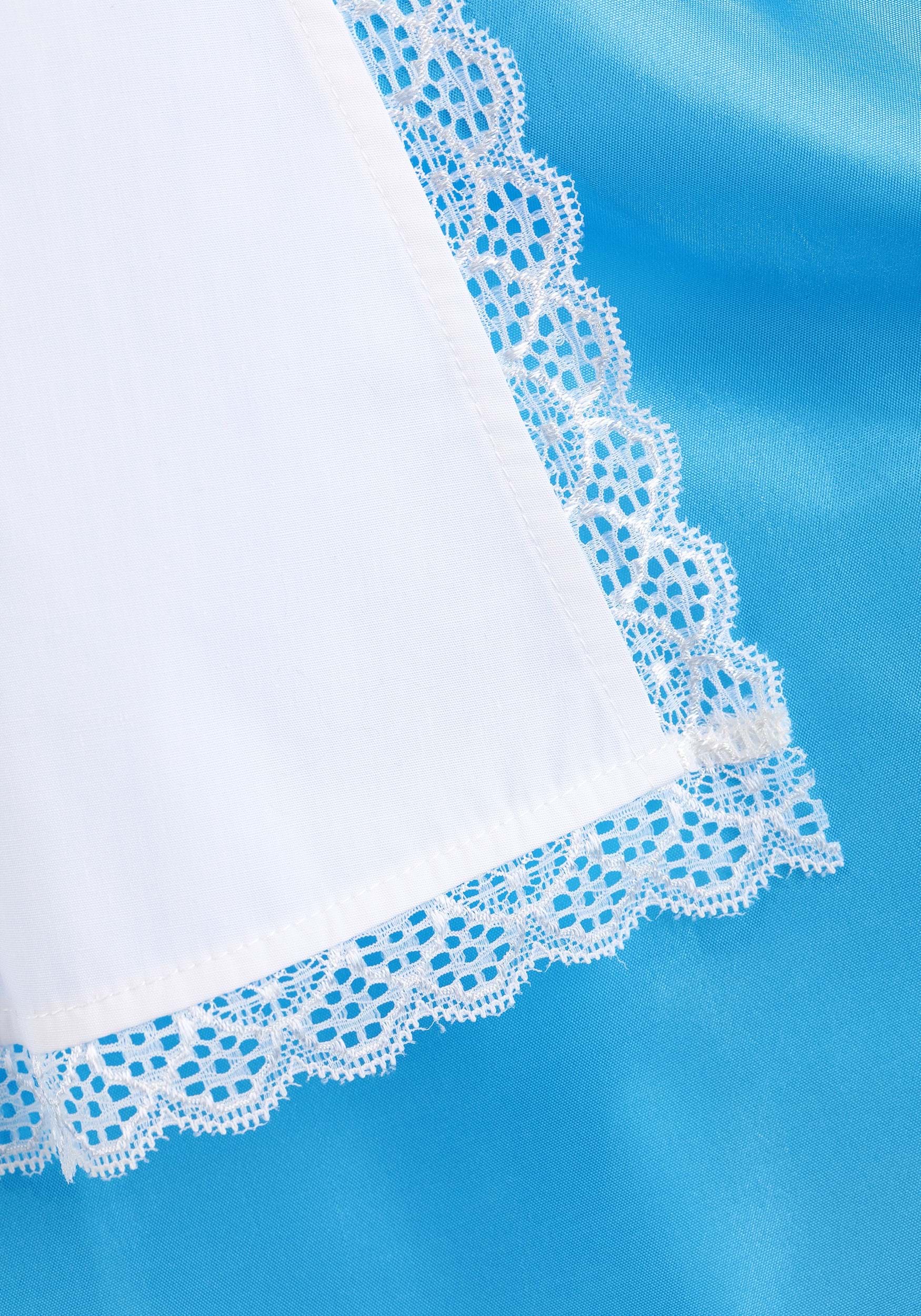 The light blue satin dress has a smooth, elegant finish, and the attached white apron ties with a soft ribbon in the back for a polished touch. A small white collar adds a prim detail that perfectly captures Alice's timeless style. The costume is topped off with Alice's black headband, complete with a neatly tied bow.