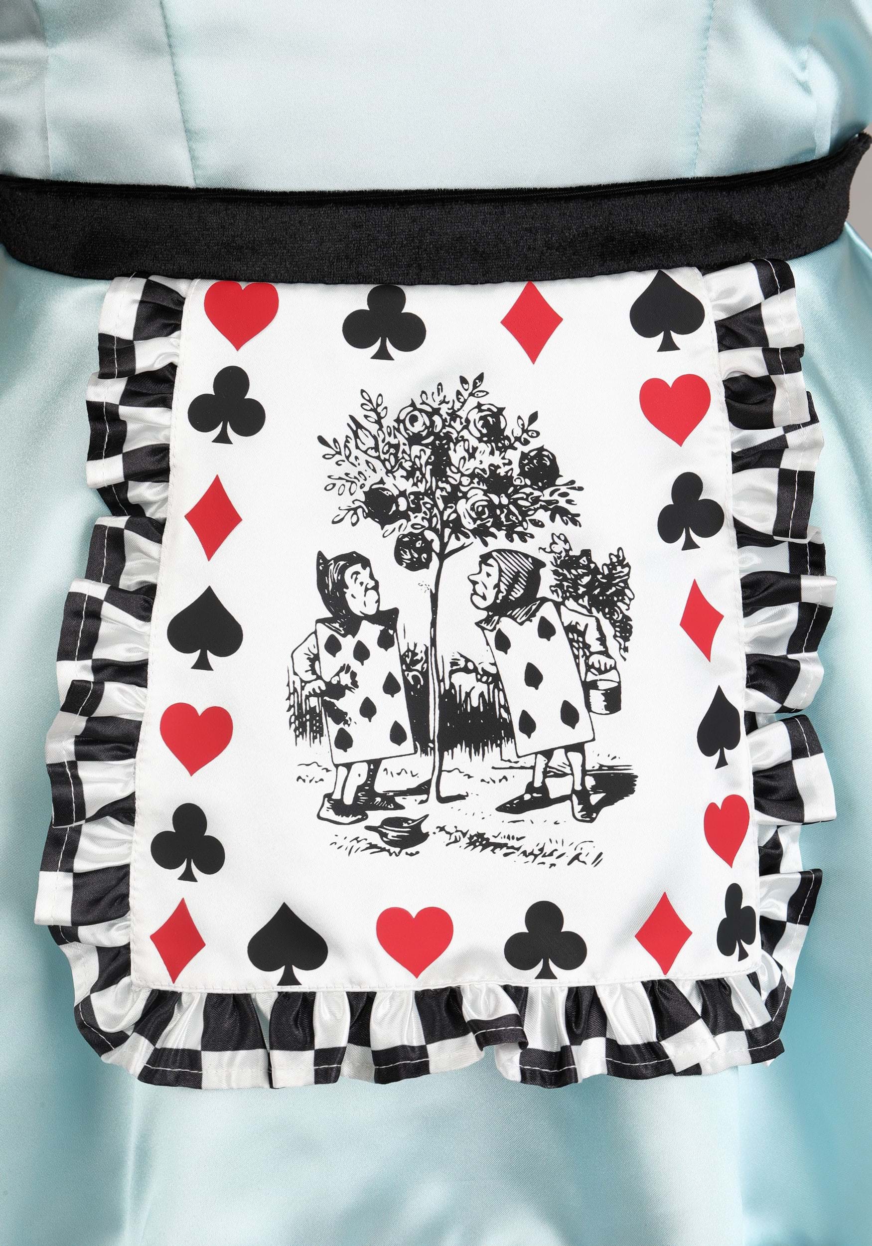 This three-piece costume set includes a dress, headband, and stockings. The dress is made from heavyweight satin with a soft blue sheen and a fitted bodice accented by a black bow on the bust. The skirt features a bold black-and-white diamond check trim around the hem for a Wonderland-worthy flair. Attached to the front is a white apron printed with red card suits and two card soldiers standing at attention.