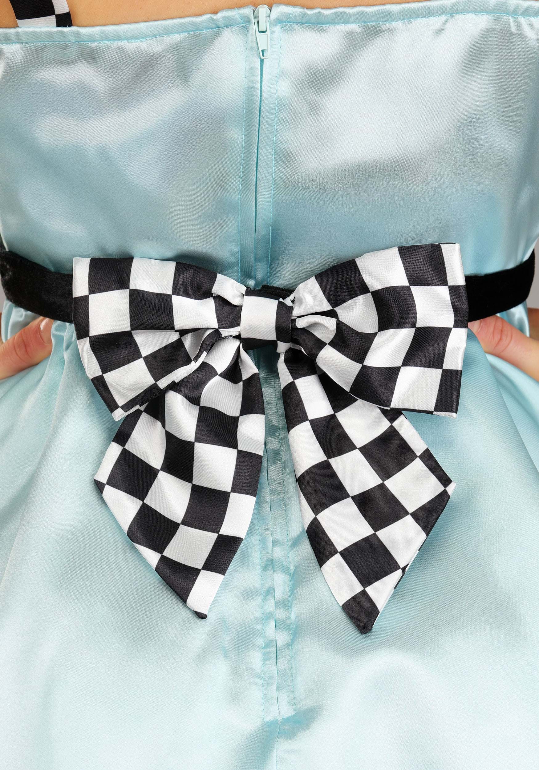 The matching headband features a light blue satin bow that sits comfortably and keeps your look in place, even if you're tumbling through mirror portals or arguing with hatters. The included white stockings come with sewn-on black bows for extra polish and a touch of mischief.