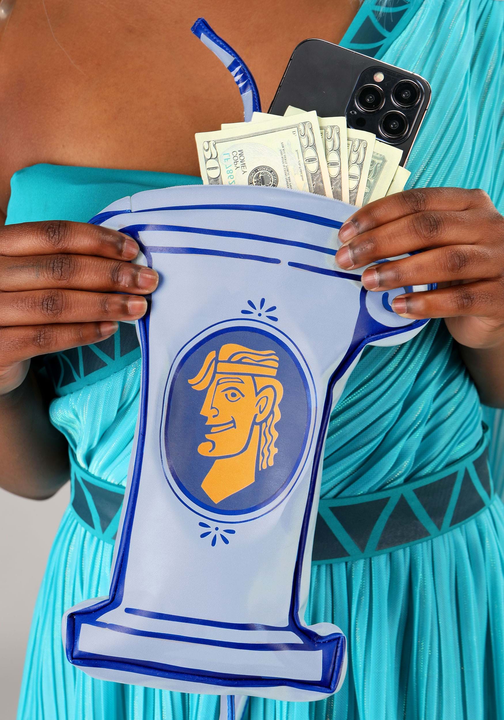 The costume starts with a jersey knit dress with a zipper down the center back for comfortable and easy wearing. A chiffon overlay, sewn-in belt, and decorative shoulder clasp give the dress a toga style. An attached tail, wings, and horns headband made from metallic fabric add essential character details, while a Herculade-styled purse completes the look with a bit of humor.