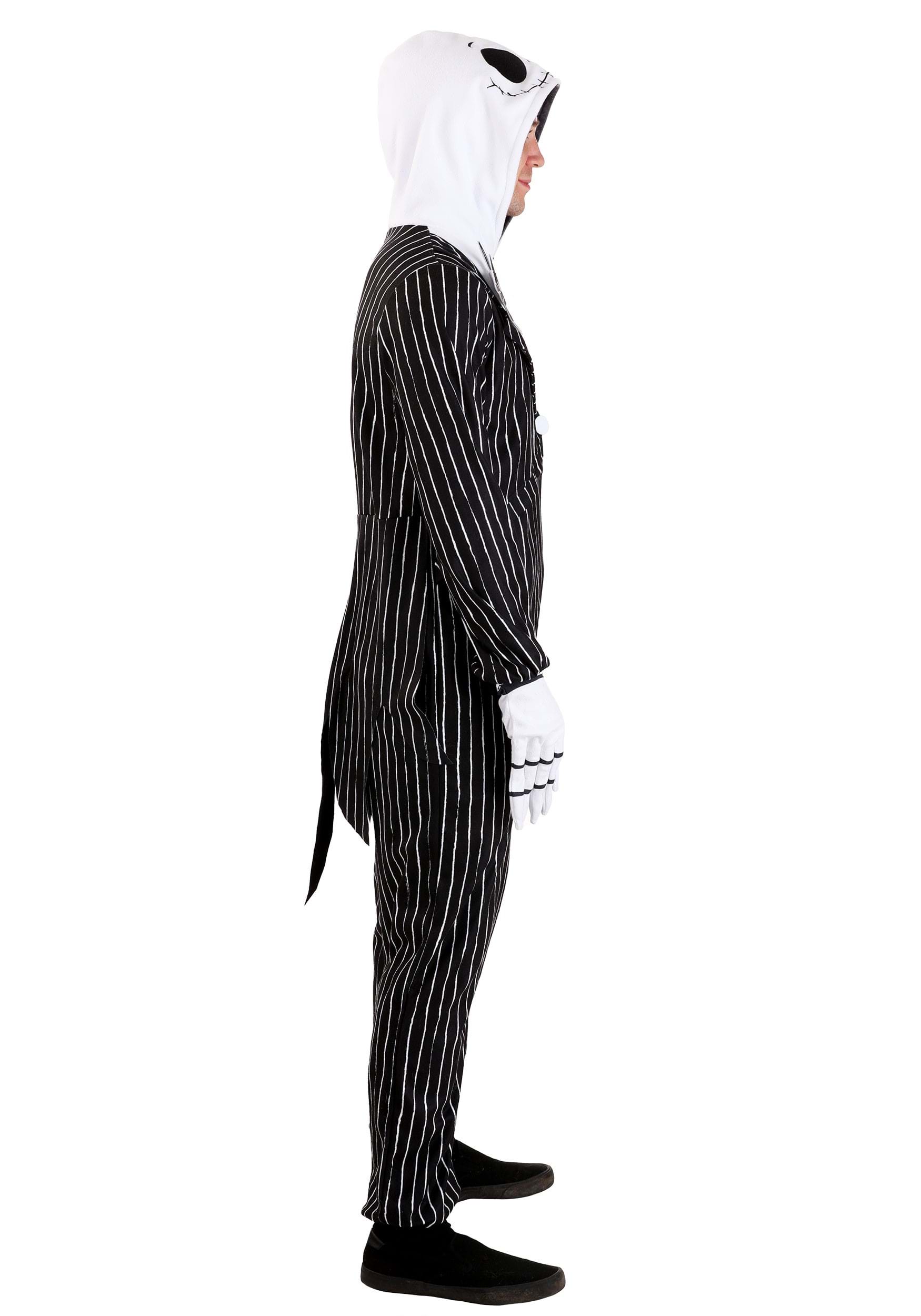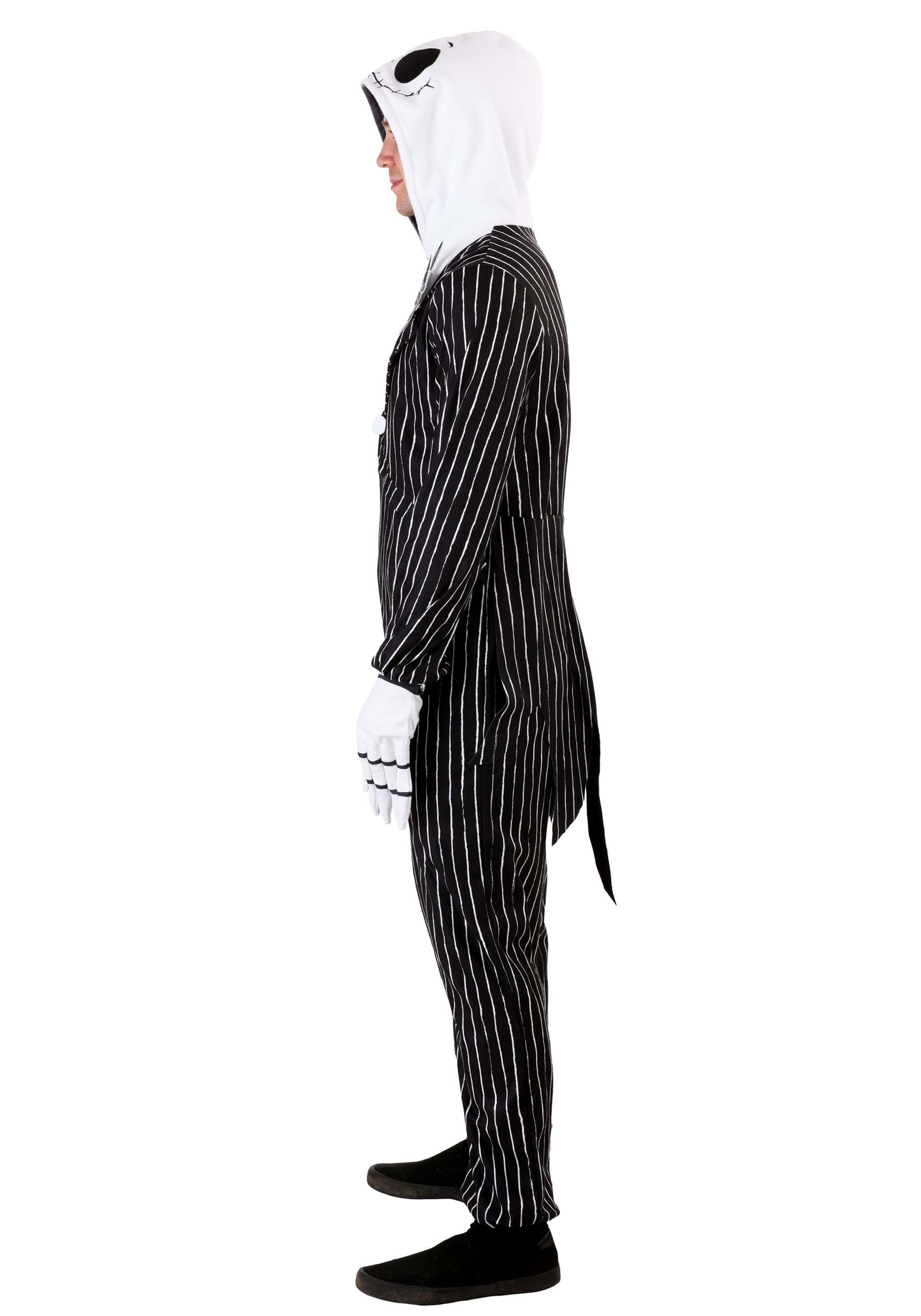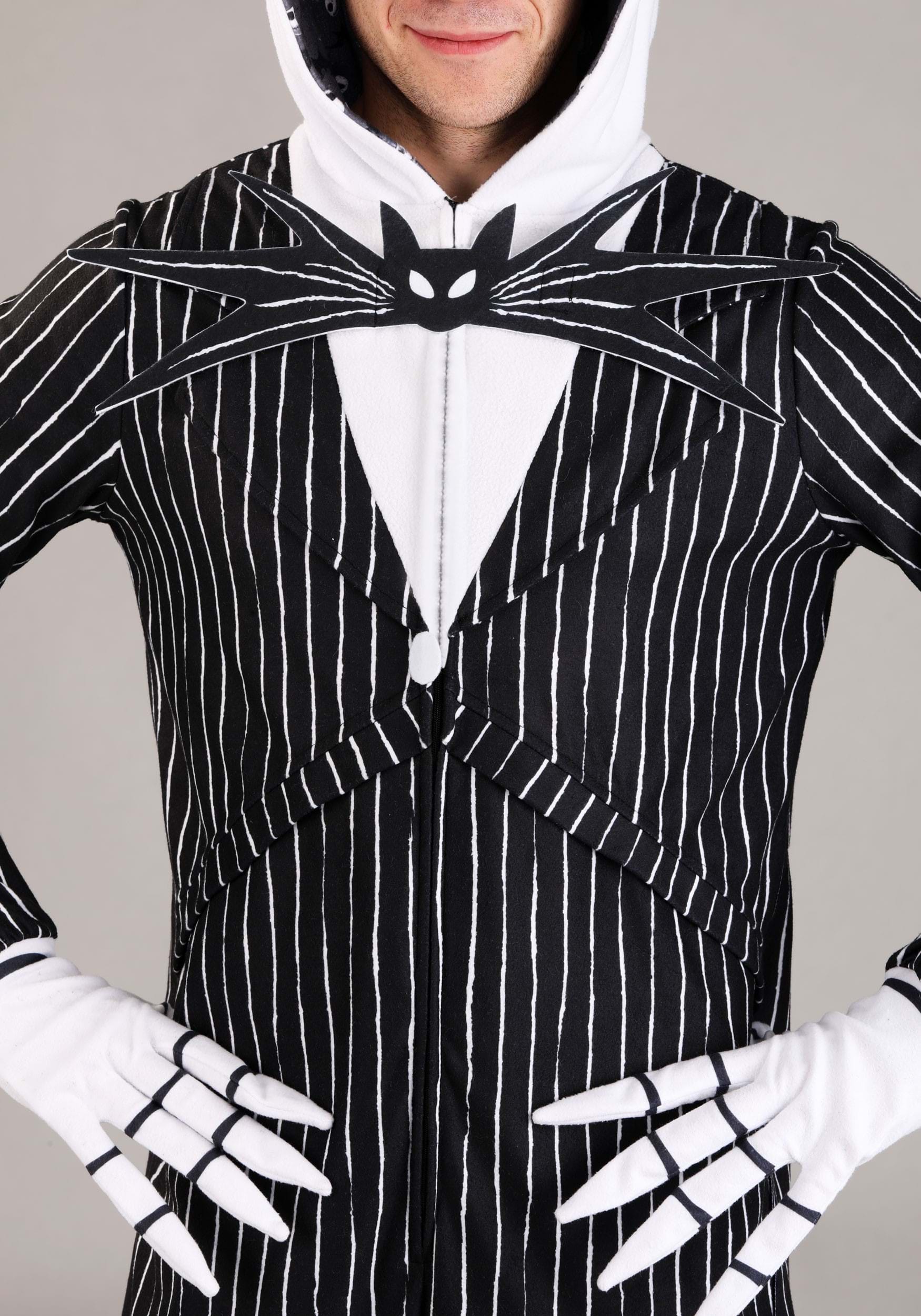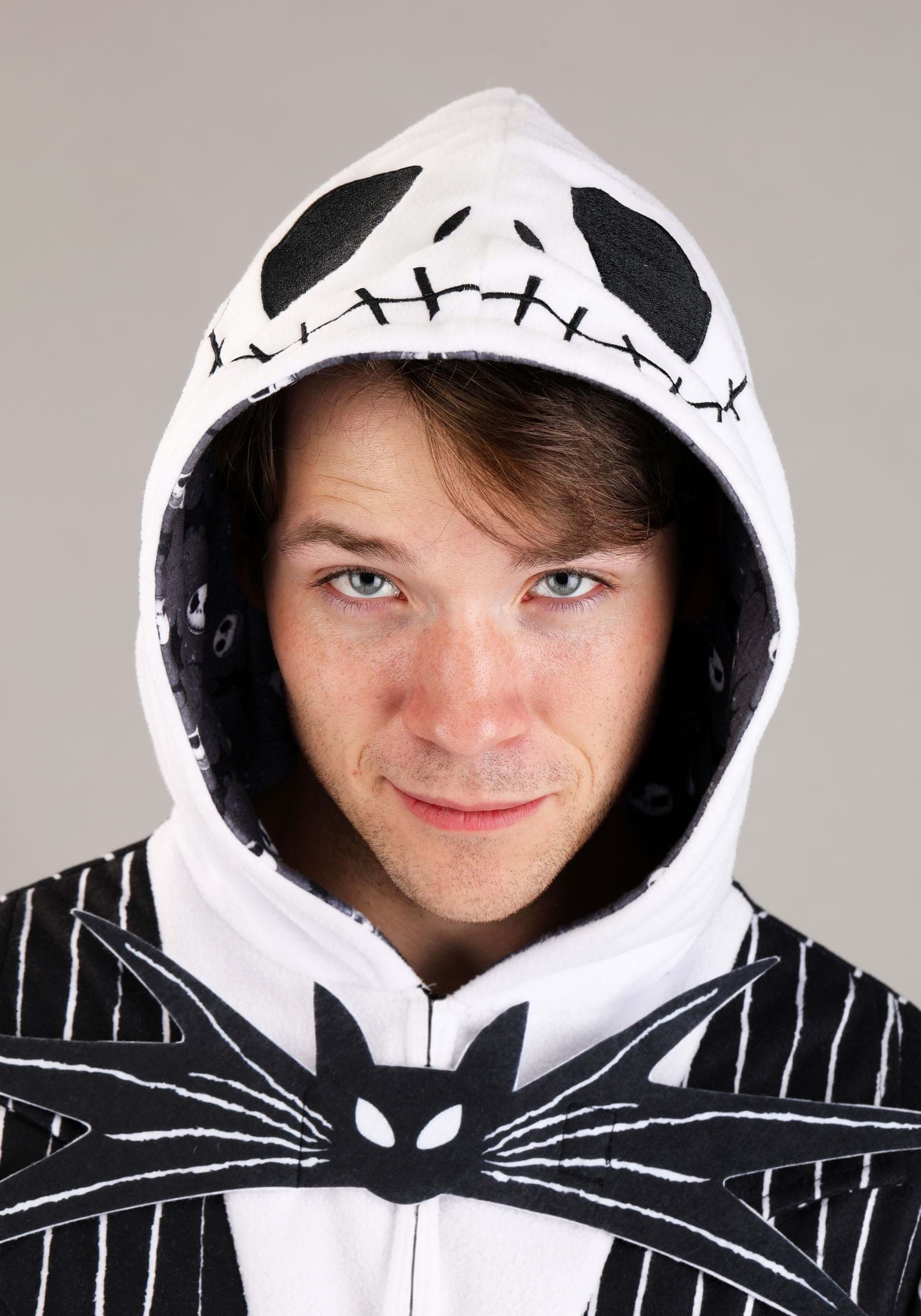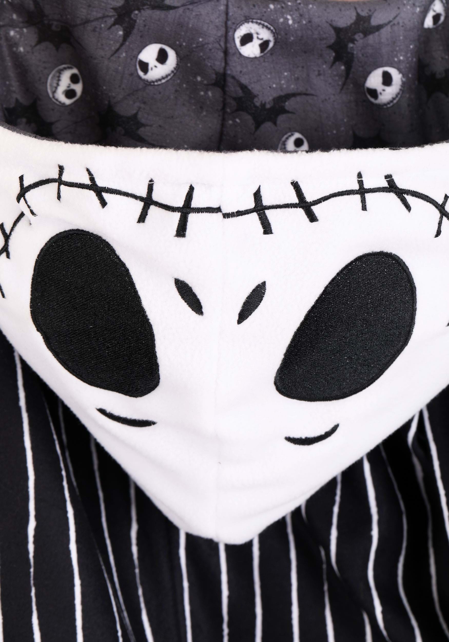 Jack Skellington's signature pinstriped "suit" covers the onesie's body, complete with attached gloves at the sleeves. The hood features a sublimated Jack Skellington face that perfectly captures his famous grin, so you can relax with a touch of Halloween Town flair. Whether you're heading out to haunt the living room or snuggle up for a movie marathon, this Jack Skellington onesie is here for cozy character fun!