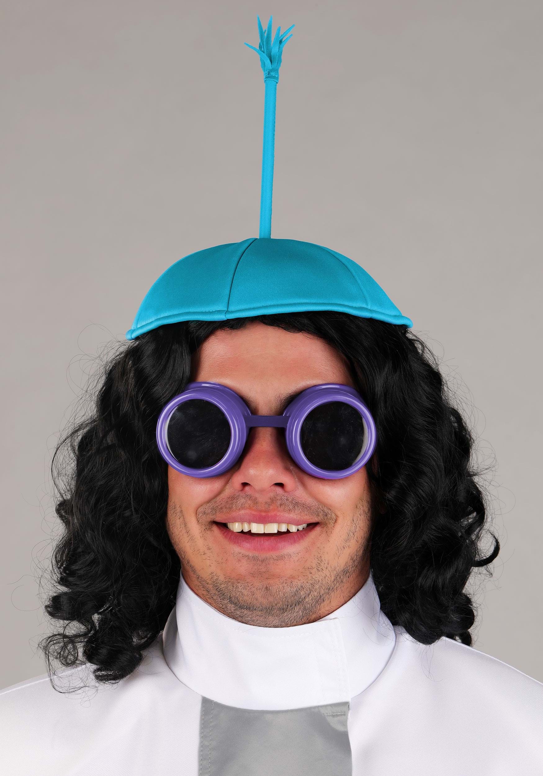 This knee-length white twill coat mirrors the lab-ready look of Kronk, complete with blocky silver trim. Polyfill shoulders build out his signature shape, while hook-and-loop fasteners at the front and collar keep things secure. Jersey-backed headwear with a structured tassel sits snugly in place and shimmering faux leather gloves extend over the sleeves. Tinted goggles with a head strap finish this eccentric experiment ensemble.