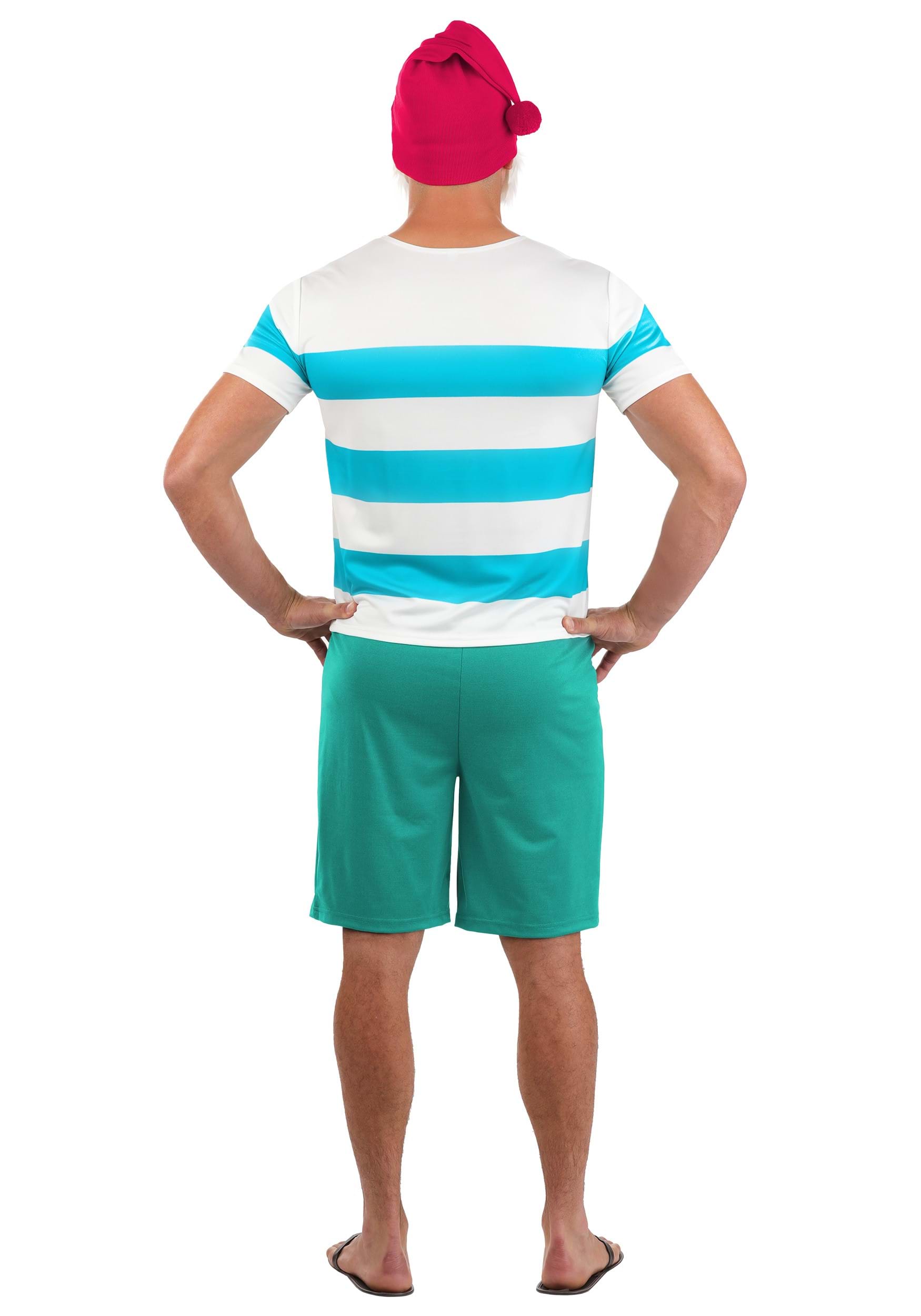 The pullover stretch jersey shirt features Mr. Smee's signature blue-and-white stripes, designed for all-day comfort. Coordinating jersey knit shorts with an elastic back waistband offer a flexible, easygoing fit. Completing the look, the rib knit red hat includes a plush pom and attached faux hair, secured with a hook-and-loop fastener for a stay-put fit. This outfit is all about comfortable, recognizable style from top to toe.