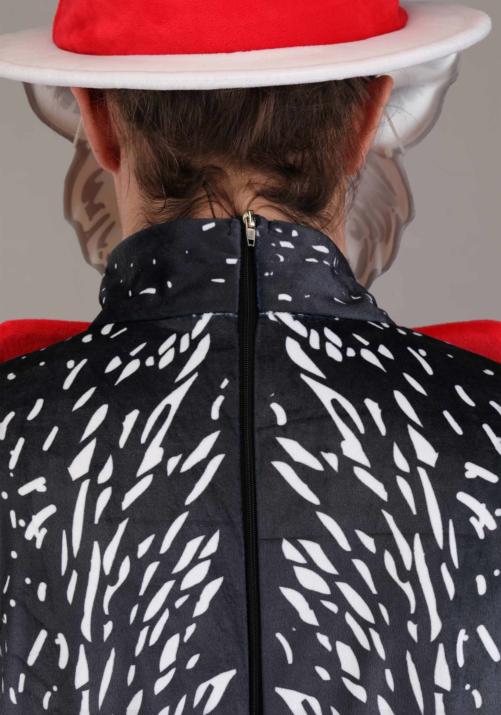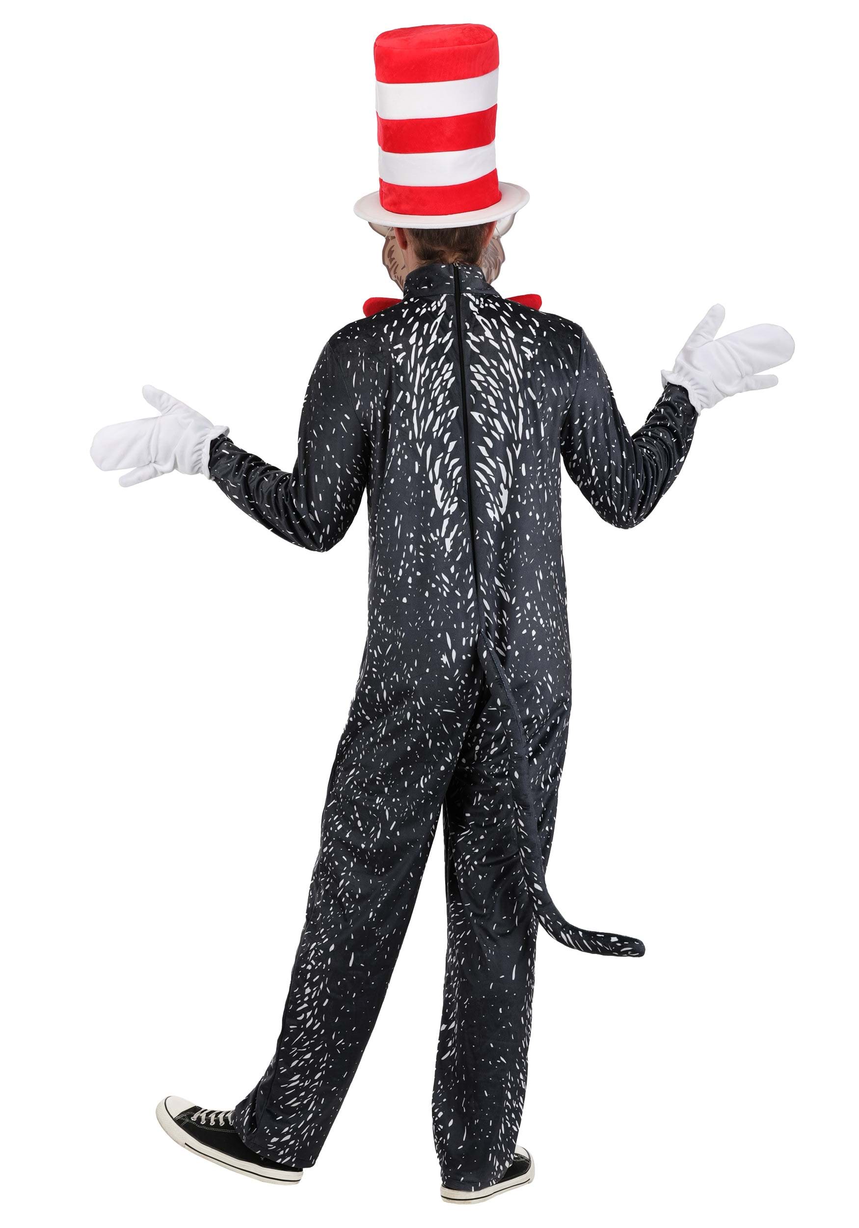 The costume features a full-length jumpsuit made entirely of polyester and covered in sublimated illustrations, capturing the sketchy charm of the original book art. From the fuzzy black fur to the white belly stripe, it’s like you leapt right off the page (without knocking over the goldfish—yet). A back zipper keeps things easy to slip on, in case you’re late for rhyming class.