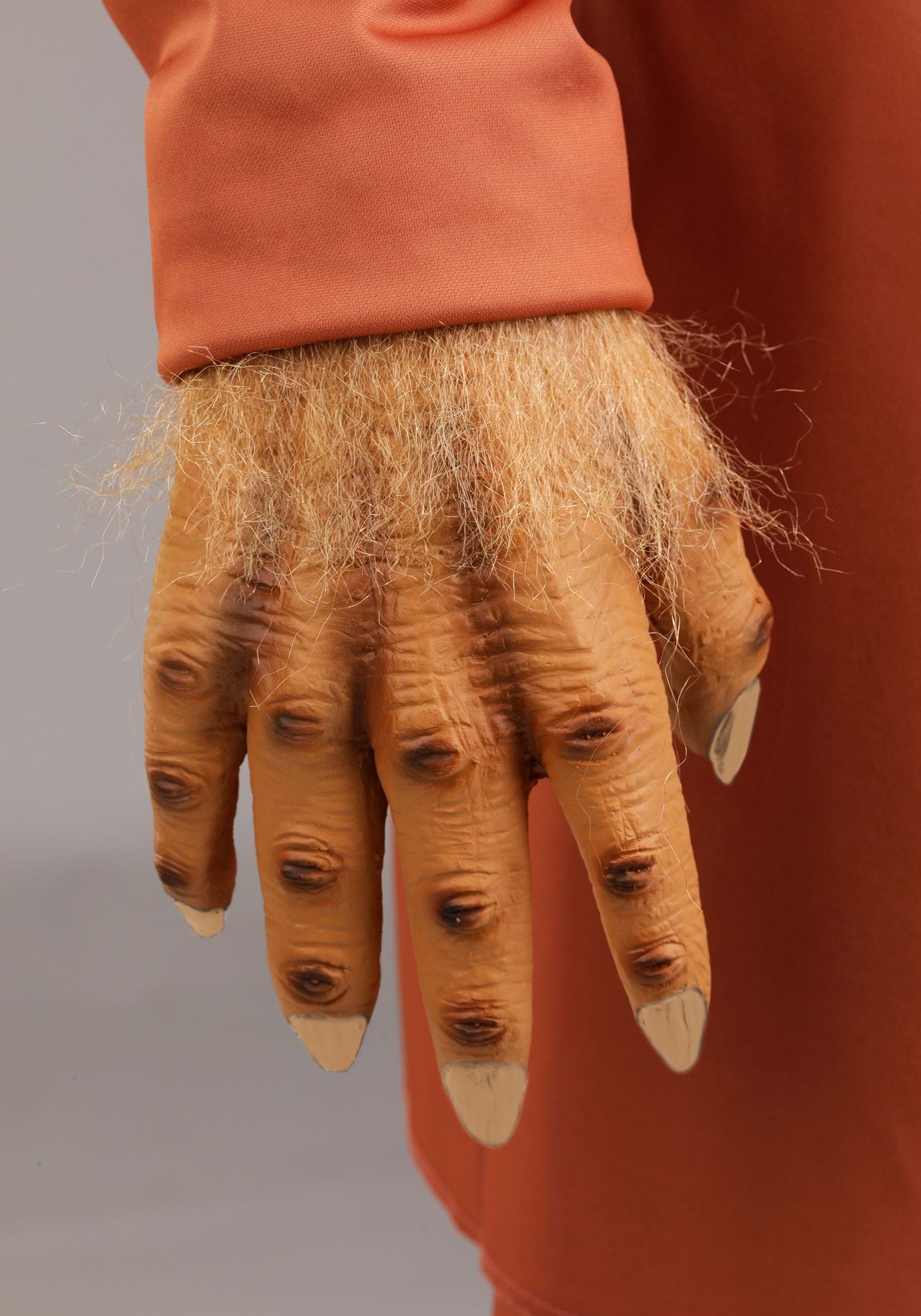 A molded latex mask with synthetic hair and a beard recreates Dr. Zaius' recognizable features, while molded latex gloves with faux fur wrists complete the transformation. Foam-backed jersey foot covers, secured with elastic straps, create the illusion of lifelike Ape feet for a head-to-toe immersive costume.