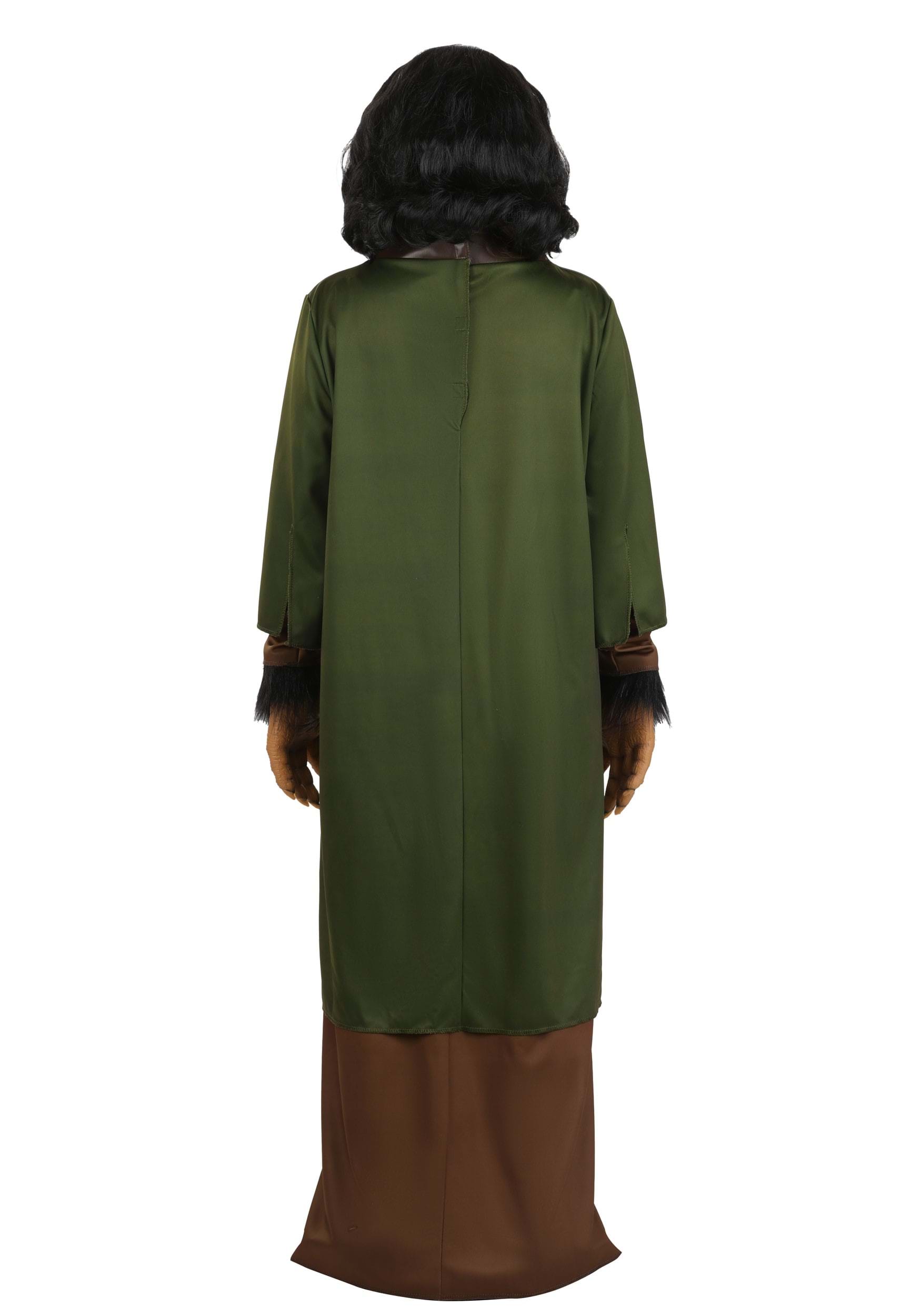 This Dr. Zira costume features a striking two-layer broadcloth robe, with a brown inner lining and green outer layer that fastens securely with hook-and-loop closures at the back. The faux leather chest panel boasts an intricate quilted pattern, lending authenticity to the design. A full-head molded latex mask, complete with synthetic hair, brings Zira's look to life.