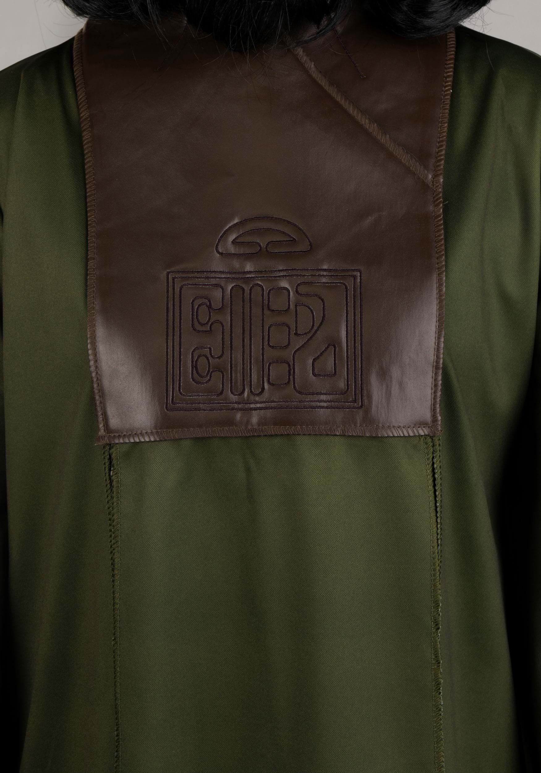 - Poly broadcloth outer green dress, brown poly broadcloth underskirt and sleeves, thin faux leather chest panel, hook and loop fastener on the back