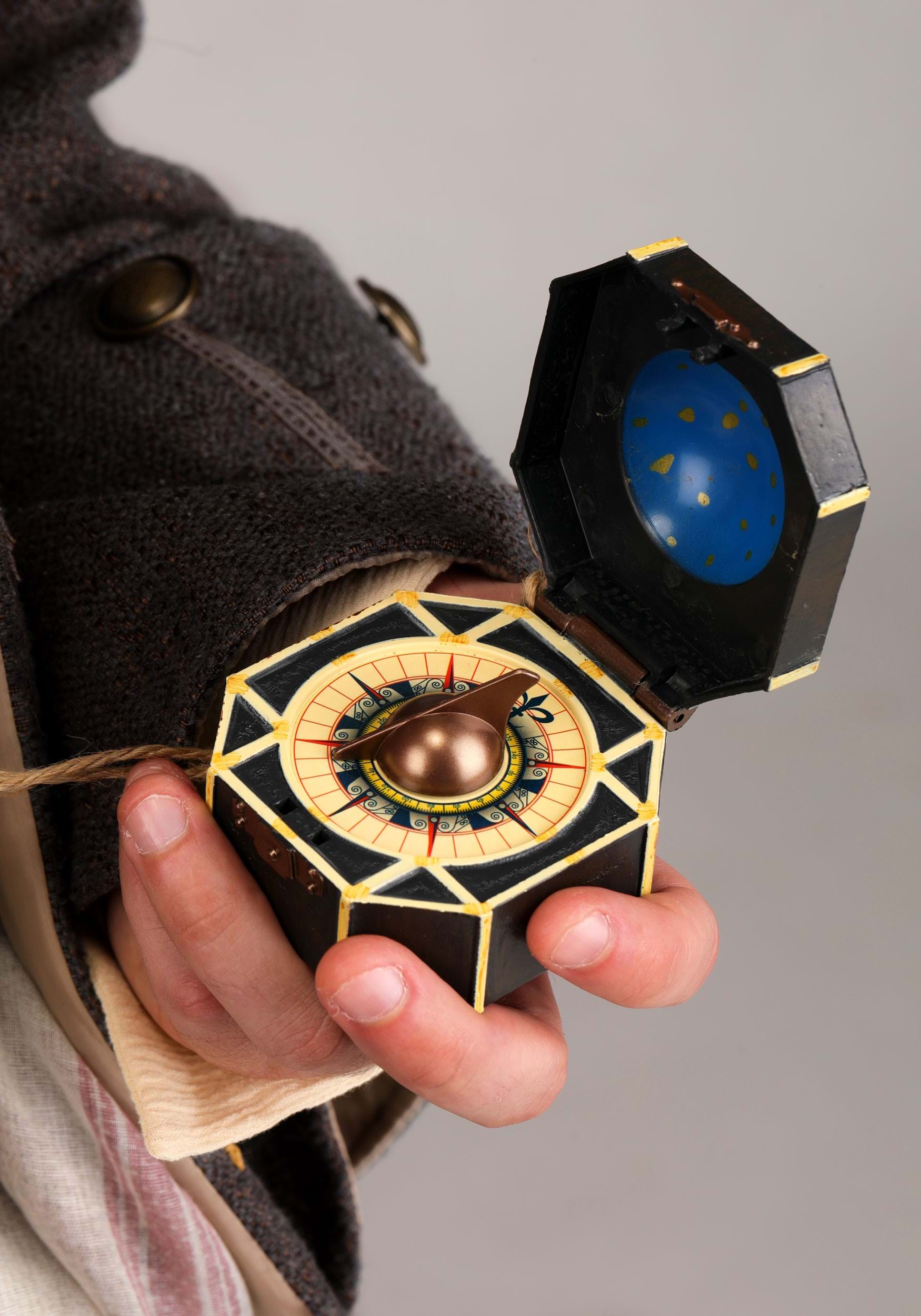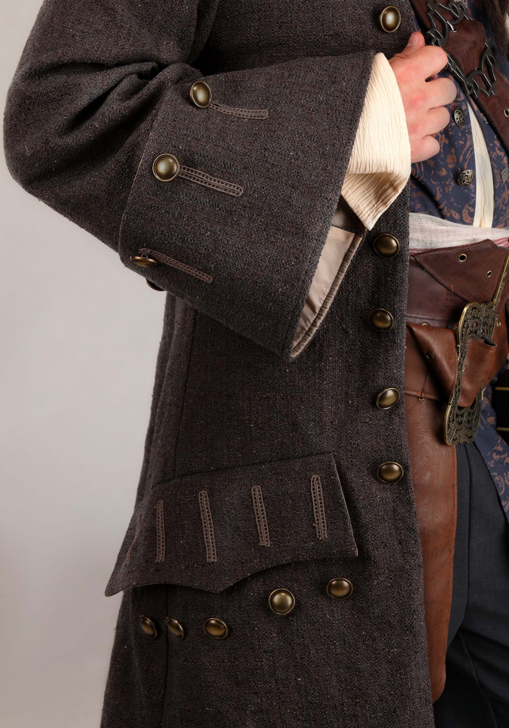 The linen-blend shirt boasts elastic cuffs for a comfortable fit, while the elastic-waist pants feature intricate embroidery and antiqued bronze buttons. A long, raw-edged sash is accompanied by four distinct faux leather belts with embossed patterns and unique buckles. Finish the look with the compass accessory and Jack's signature facial hair, including a mustache, patch, and braided beard.