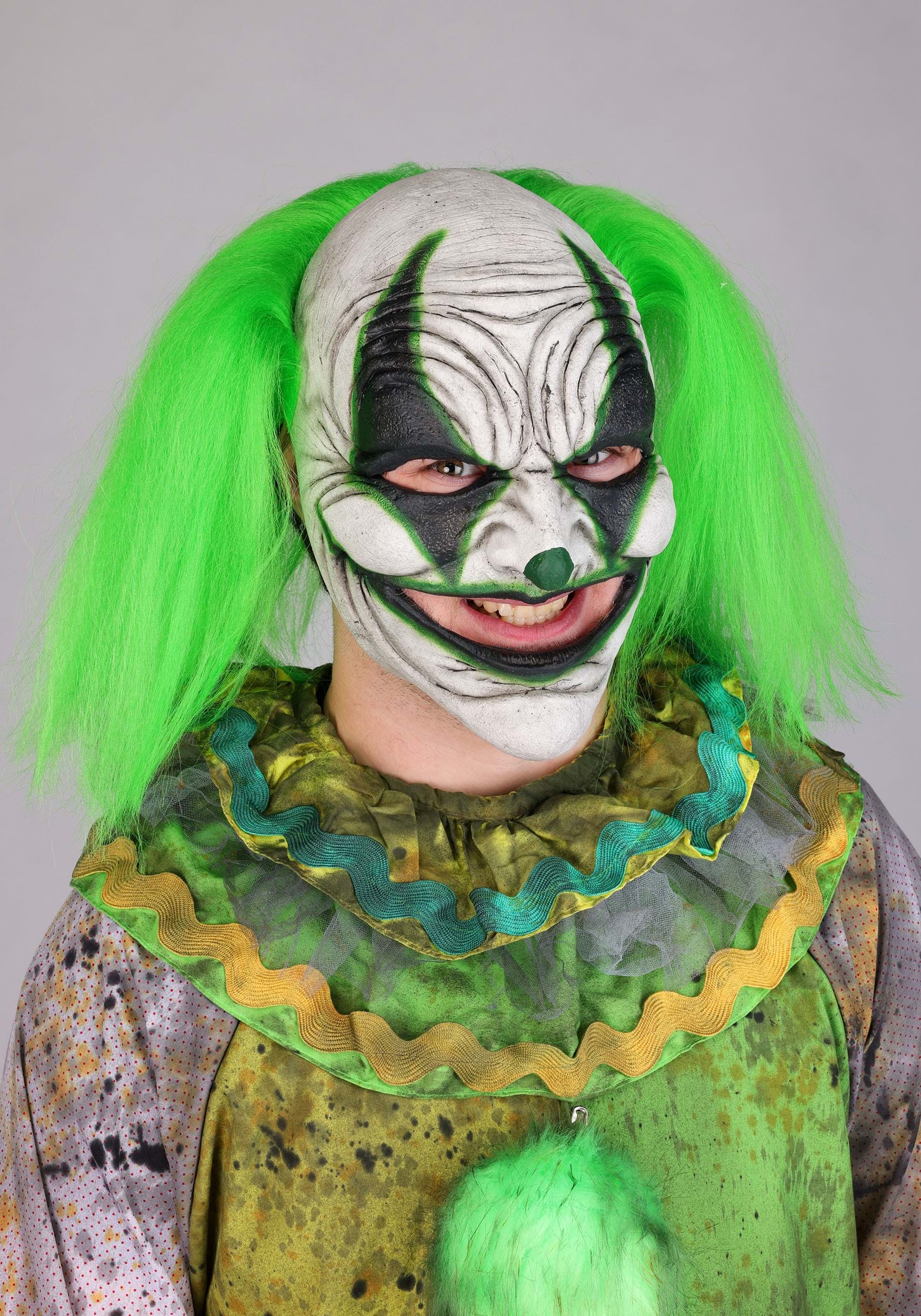 The mask is where this clown says, “Hello, I’m your sleep paralysis demon with a party license.” Made of molded plastic with a painted-on deranged expression and neon green hair tufts, it fully covers the face while still allowing for just enough comfort to chase someone in a foggy parking lot. Or, you know, hand out candy. Up to you!