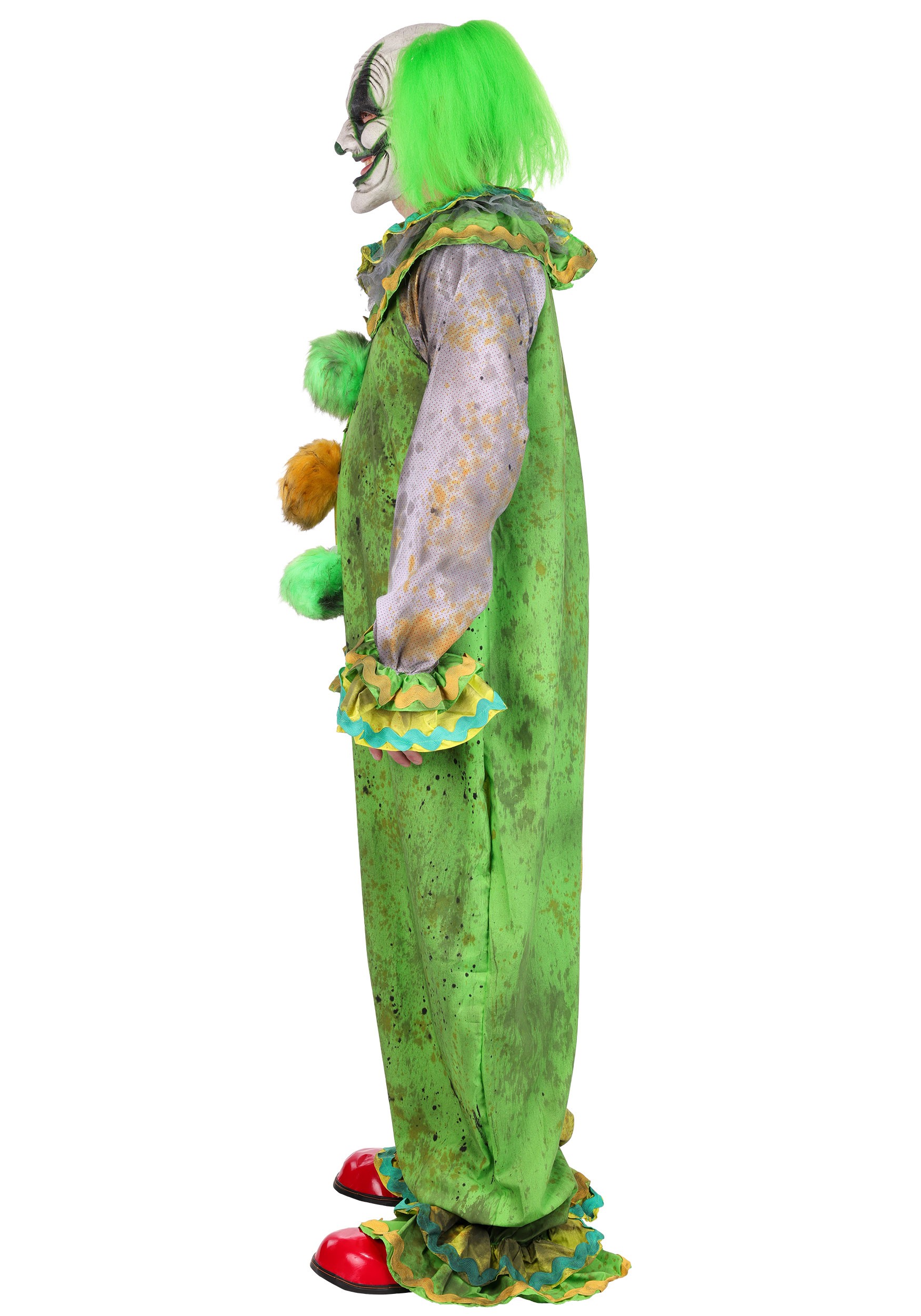 With wild chartreuse hair that practically vibrates with mischief and a painted grin that’s seen things—probably your browser history—this costume is committed. And those fuzzy pom-poms? They’re basically clown mood indicators.