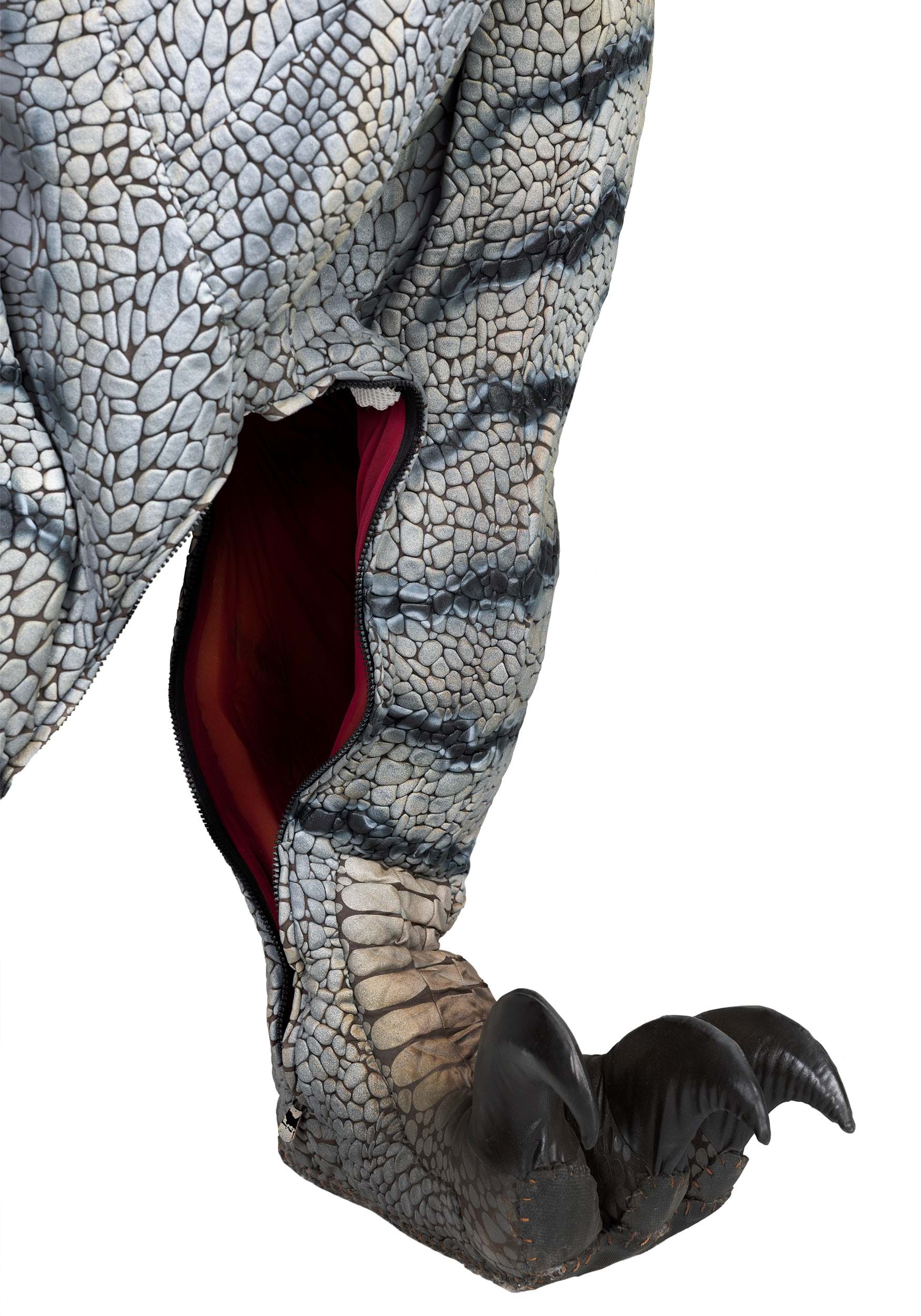 Standing 82 inches tall, this costume features a thick foam interior and a textured vinyl-like exterior for structure and realism... if any brave individual is willing to try to touch this living spectacle. The head includes thick plastic teeth, a foam tongue, and stretchy fabric interior cheeks, with blinking eyes that activate automatically. Vinyl foam talons cover the feet, while the claws are slightly posable.