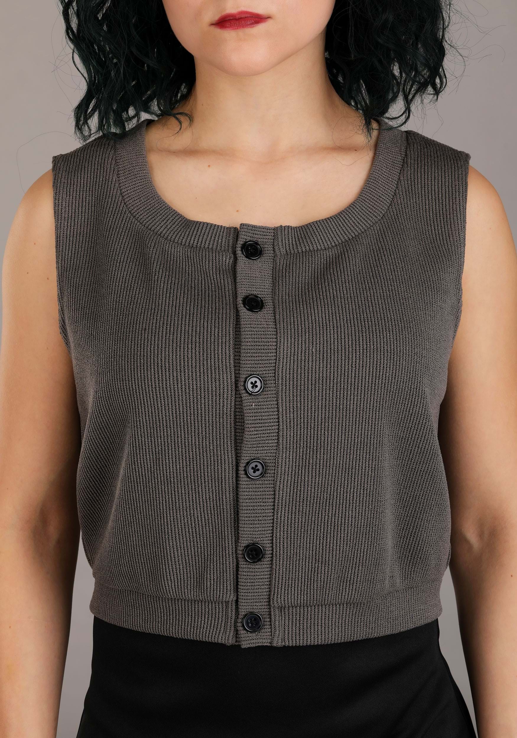 This look is pure Marla. Messy, mysterious, and weirdly fashionable despite looking like she threw her outfit together in a hurry. The black slip dress is effortlessly cool, perfect for nights spent lurking in dimly lit diners or saying things that make people question their entire existence. The button-up vest sweater adds just the right amount of 90s edge.