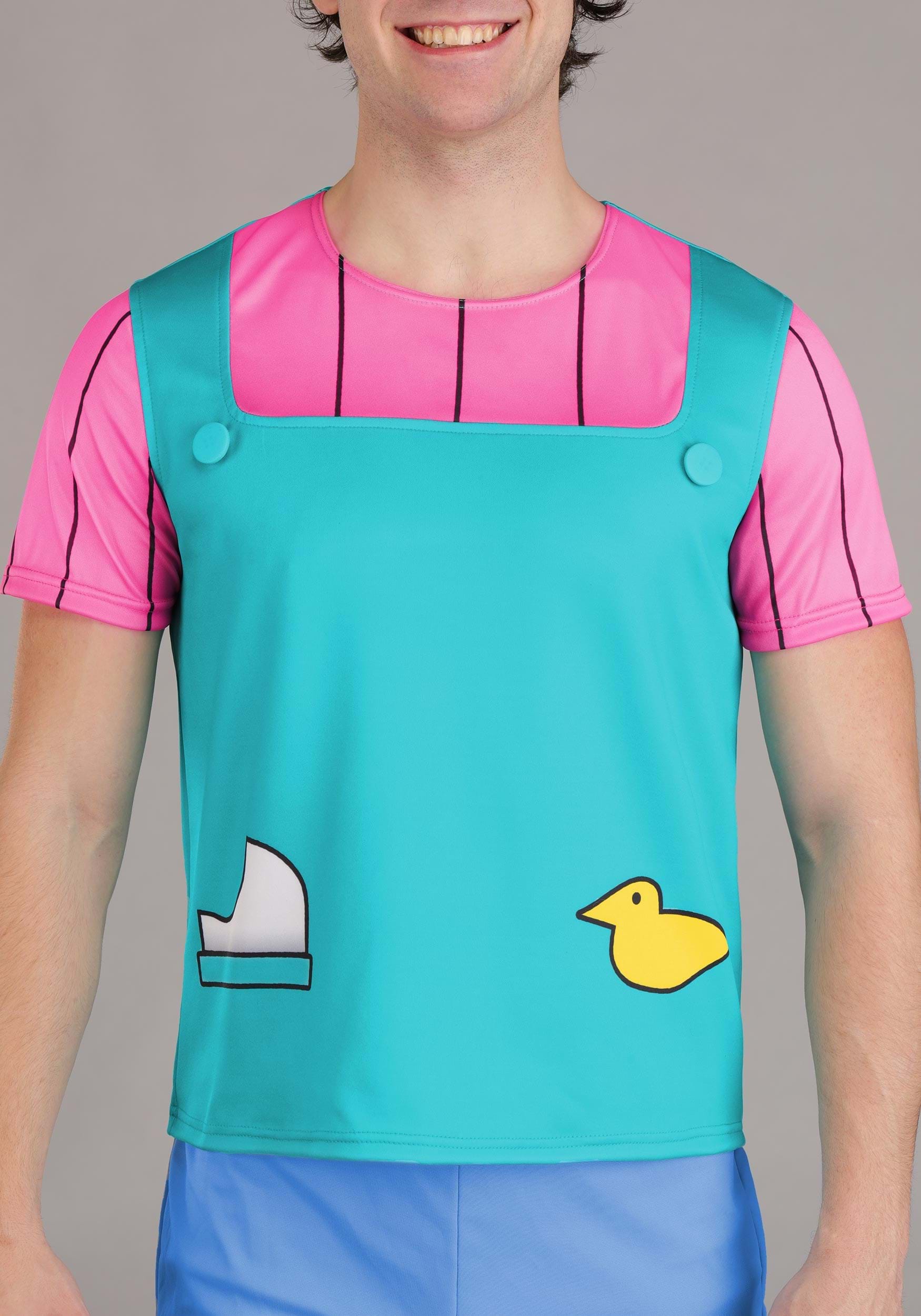 The costume includes a printed shirt with Phil’s unmistakable style: a pink-striped short-sleeve tee with an attached turquoise tank top over it. The tank top layer is made of soft knit fabric and features printed details like a cartoon duck and a faux pocket, just like the show.
