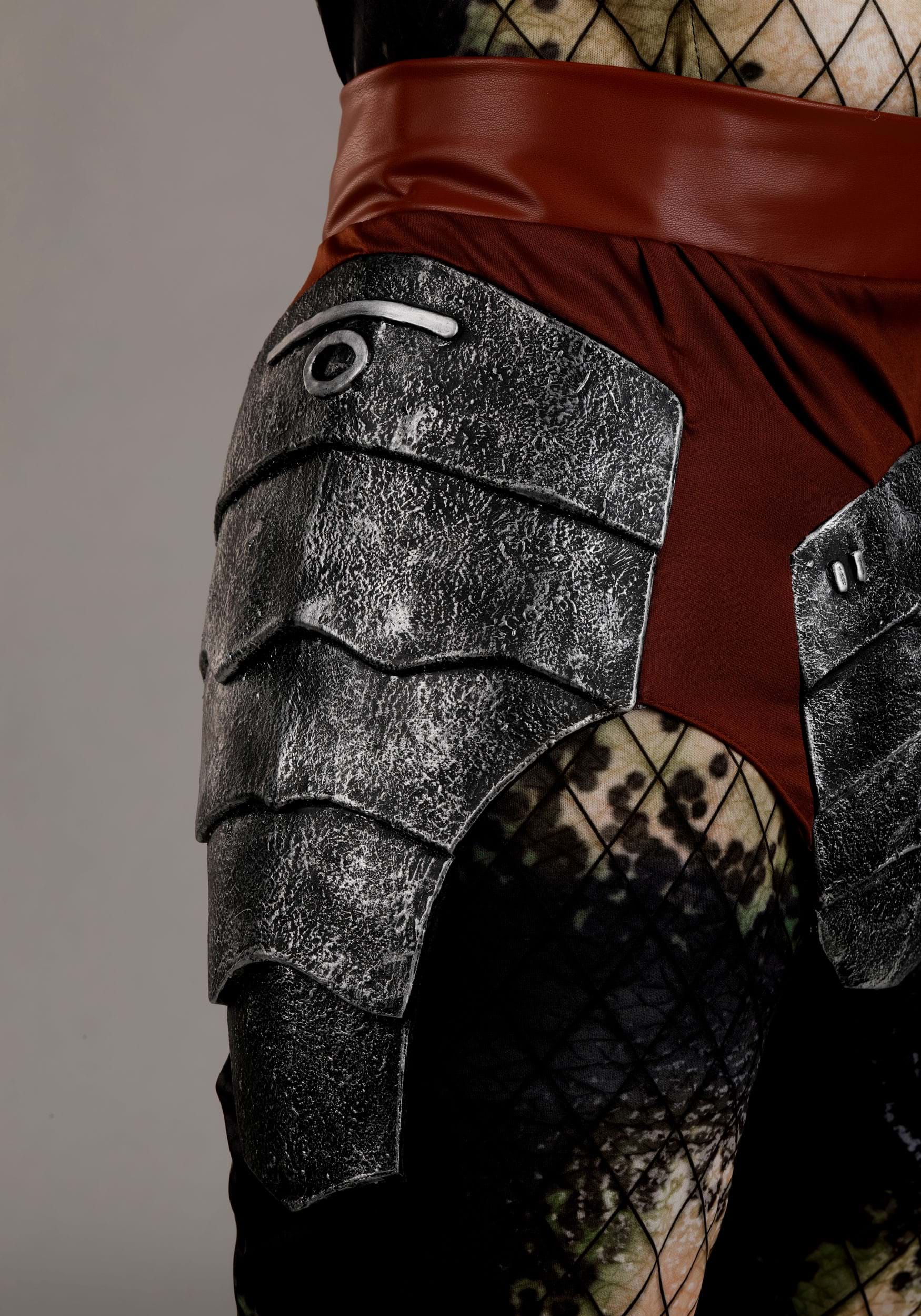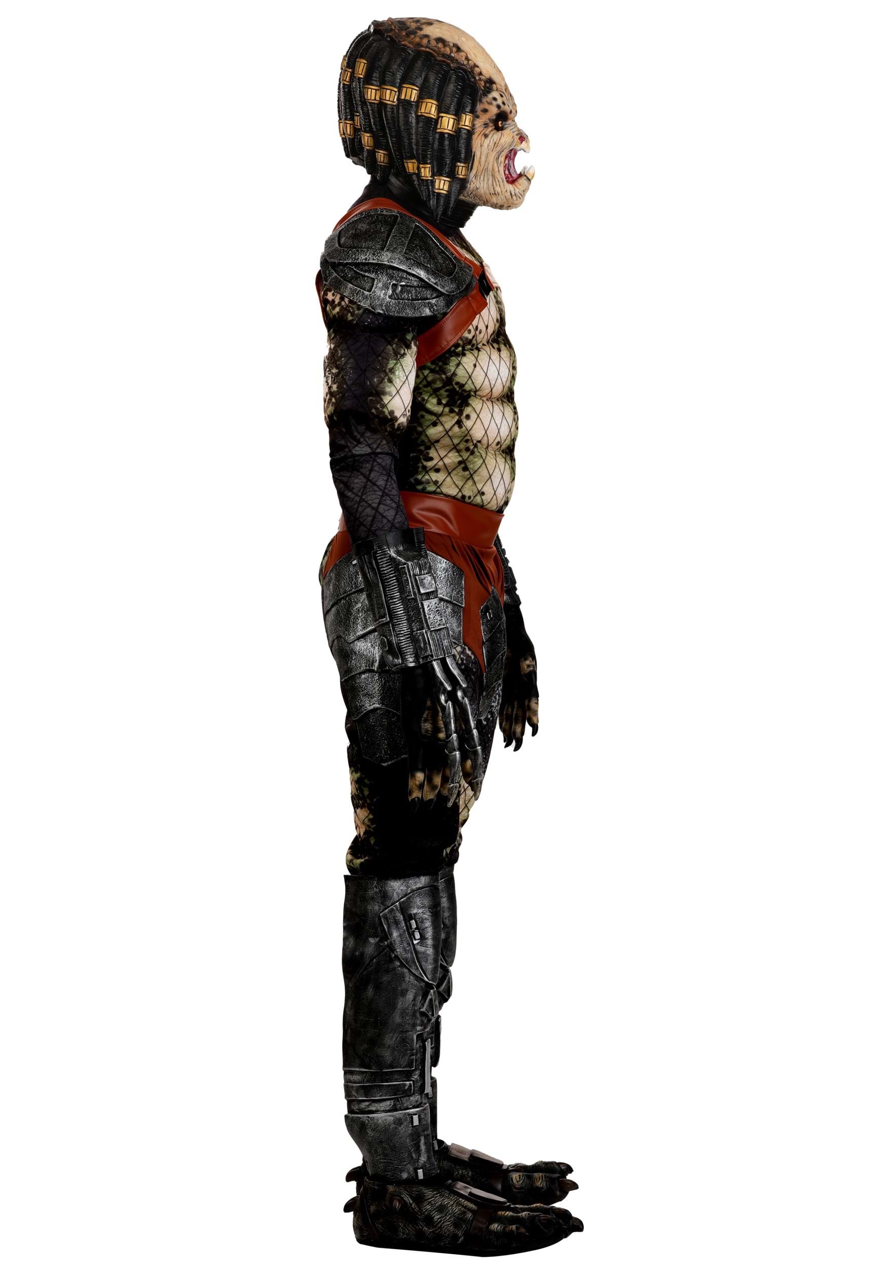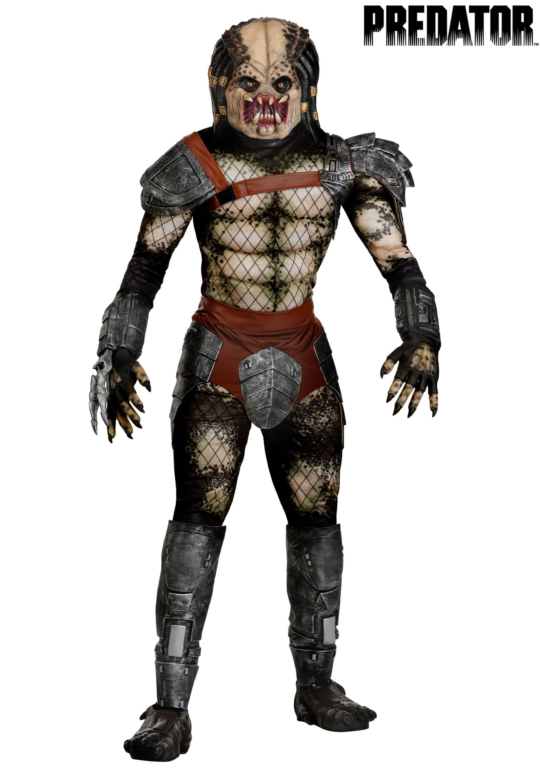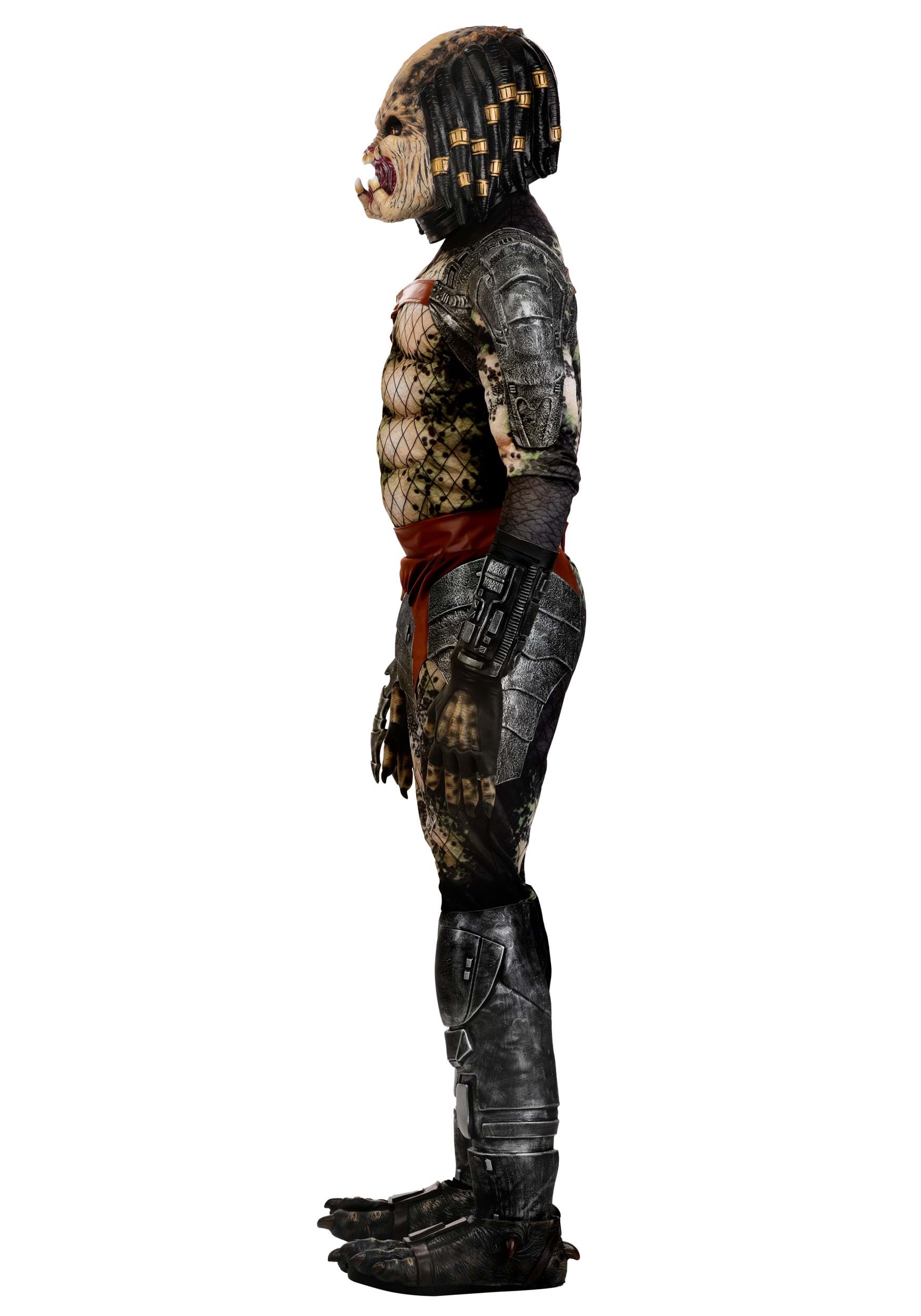 This premium costume is a full-body transformation into a battle-hardened intergalactic warrior. The fabric jumpsuit is built for intimidation, featuring muscle chest padding for that "spent-the-last-decade-at-the-gym" look. Printed details replicate the alien creature's reptilian skin, while the netting overlay completes the warrior appearance. It zips up easily, so you can suit up faster than the Predator can cloak itself.