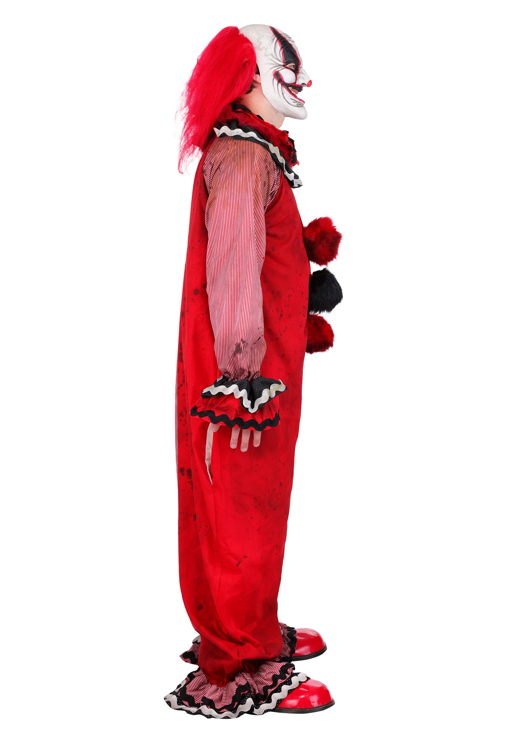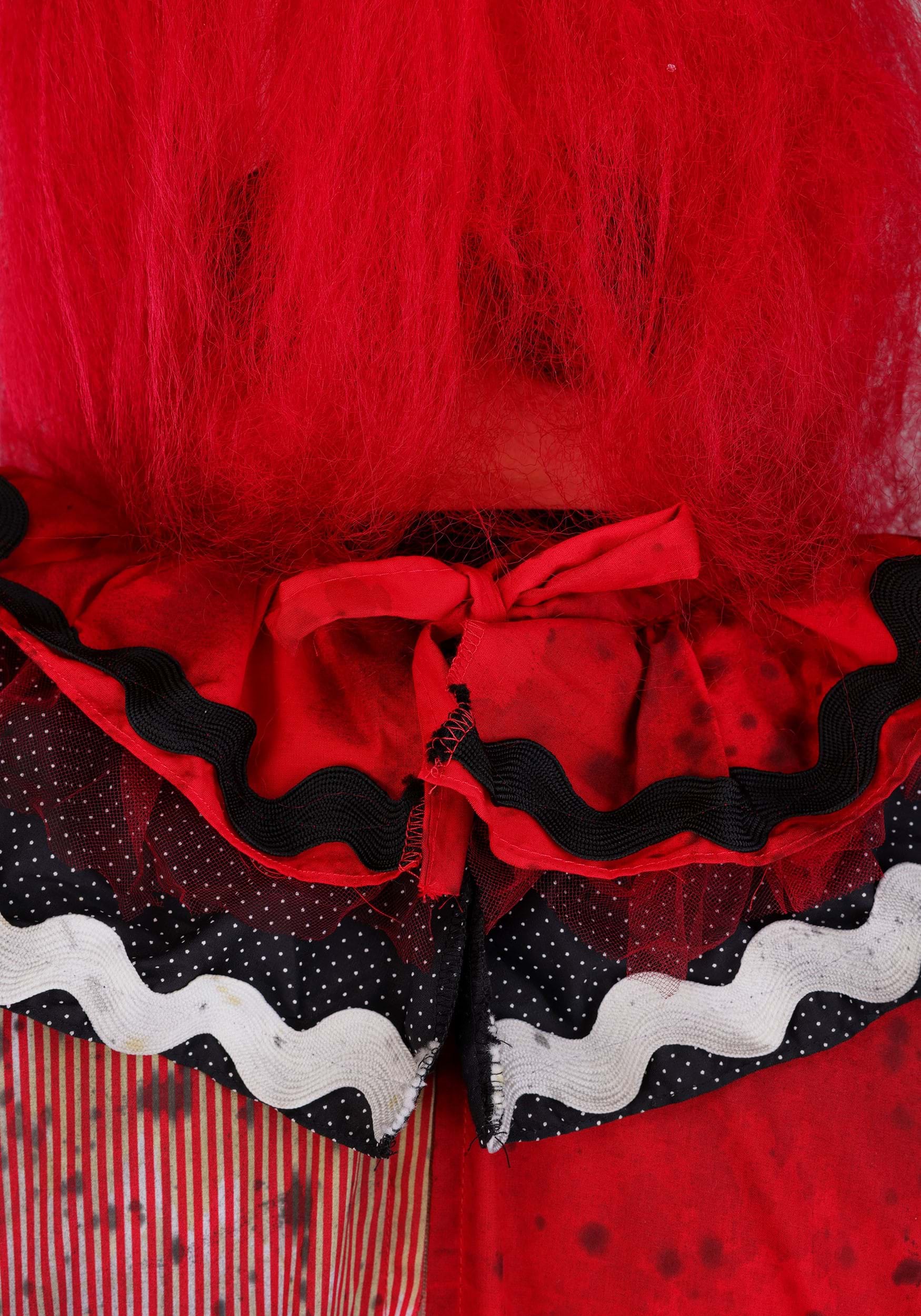 This one-piece clown suit features a jarring mix of candy-cane stripes and solid crimson, all generously splattered with grime and vague regrets. The oversized fuzzy pom-poms running down the front? They’re the only soft thing about this entire look. Frilled cuffs and a layered collar add that “once festive, now haunting” finish that screams vintage carnival energy, filtered through chaos.
