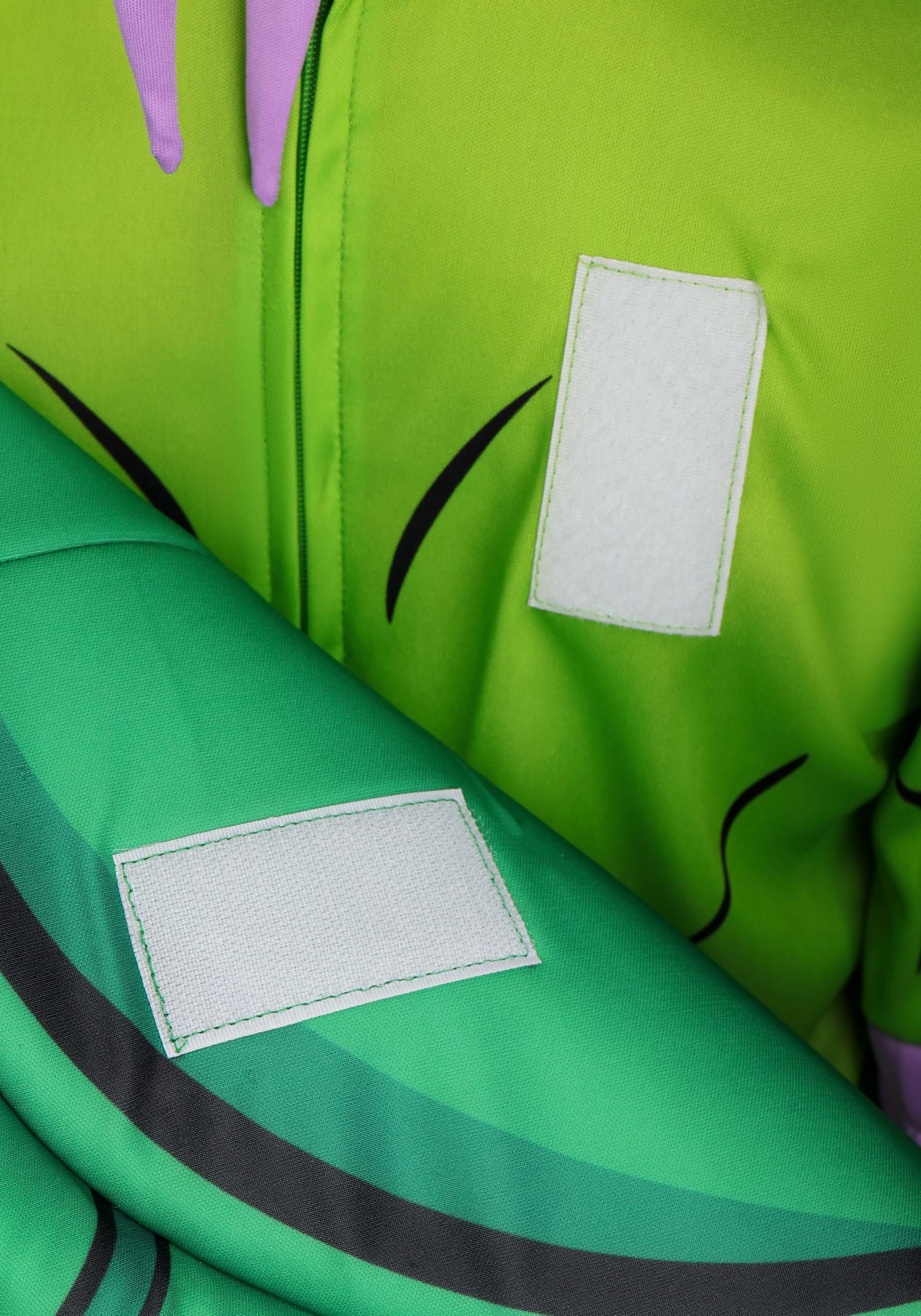 • Foam and sublimated, jersey knit shell has opening to add stuffing as desired, hook and loop fastener to secure on the back of the jumpsuit
