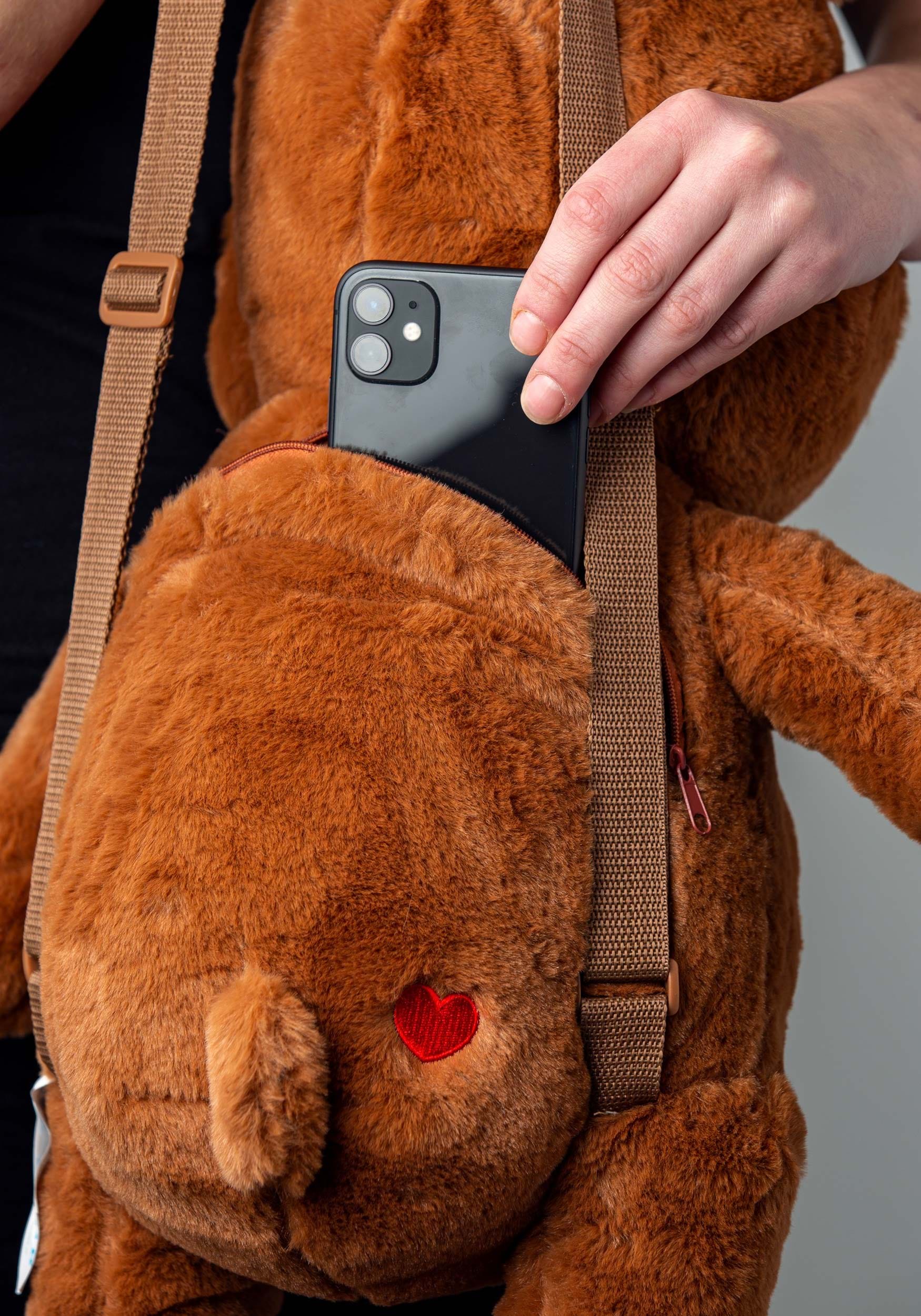 - Zipper pouch in bear's back measures 8"W x 8"H