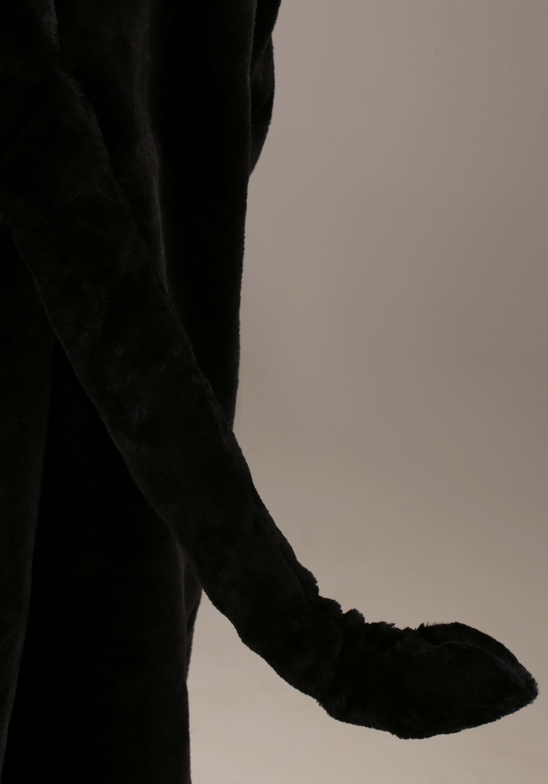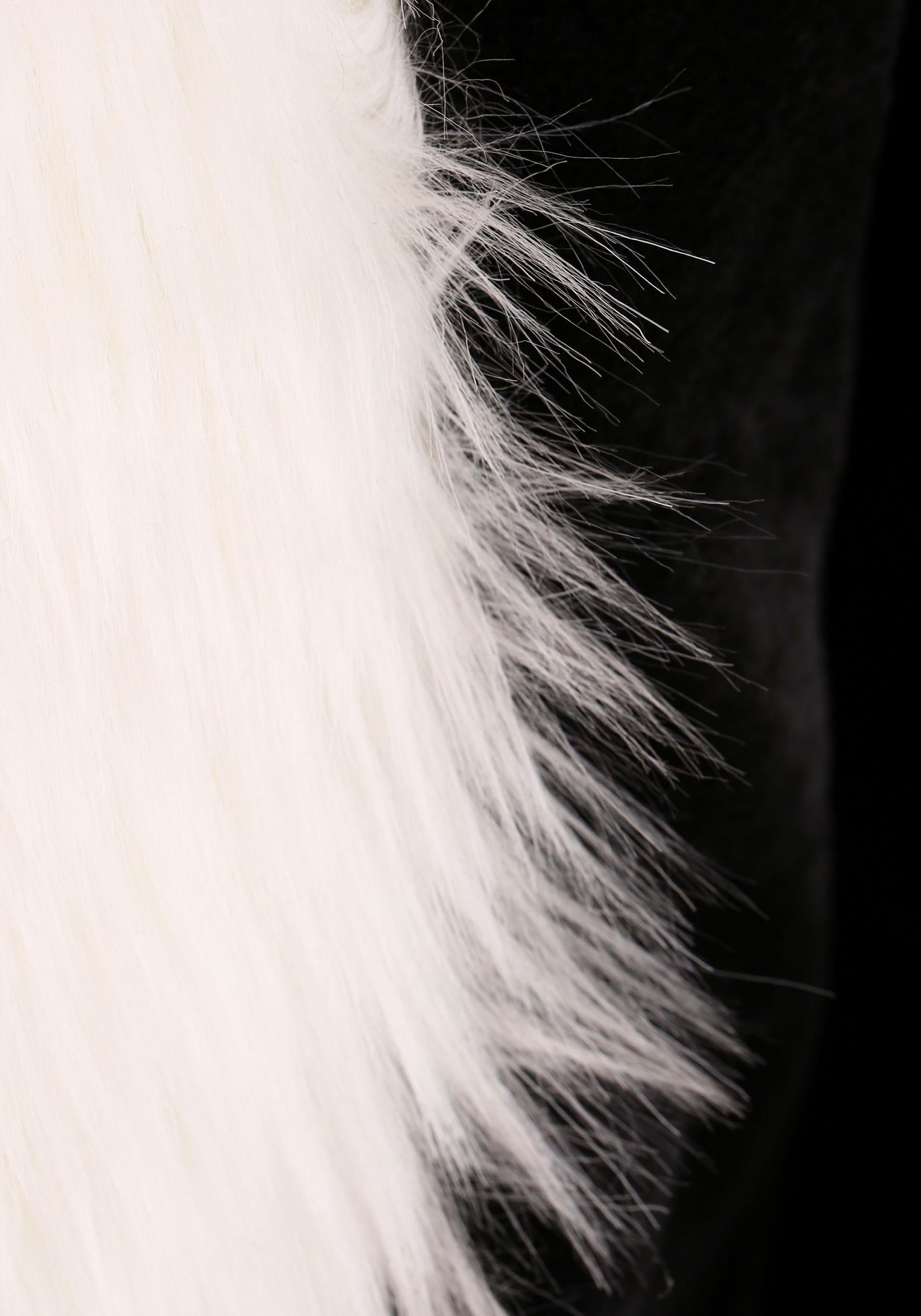 - Body of jumpsuit is plush fabric, with long pile faux fur belly inset panel