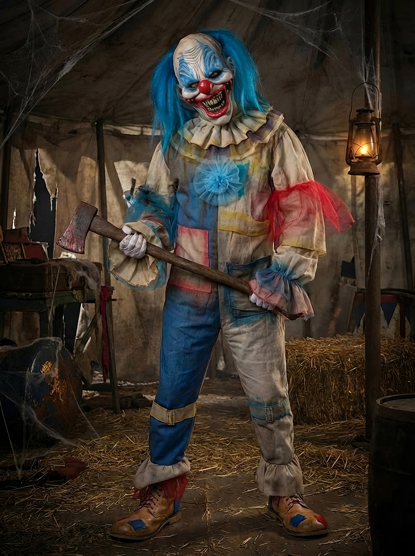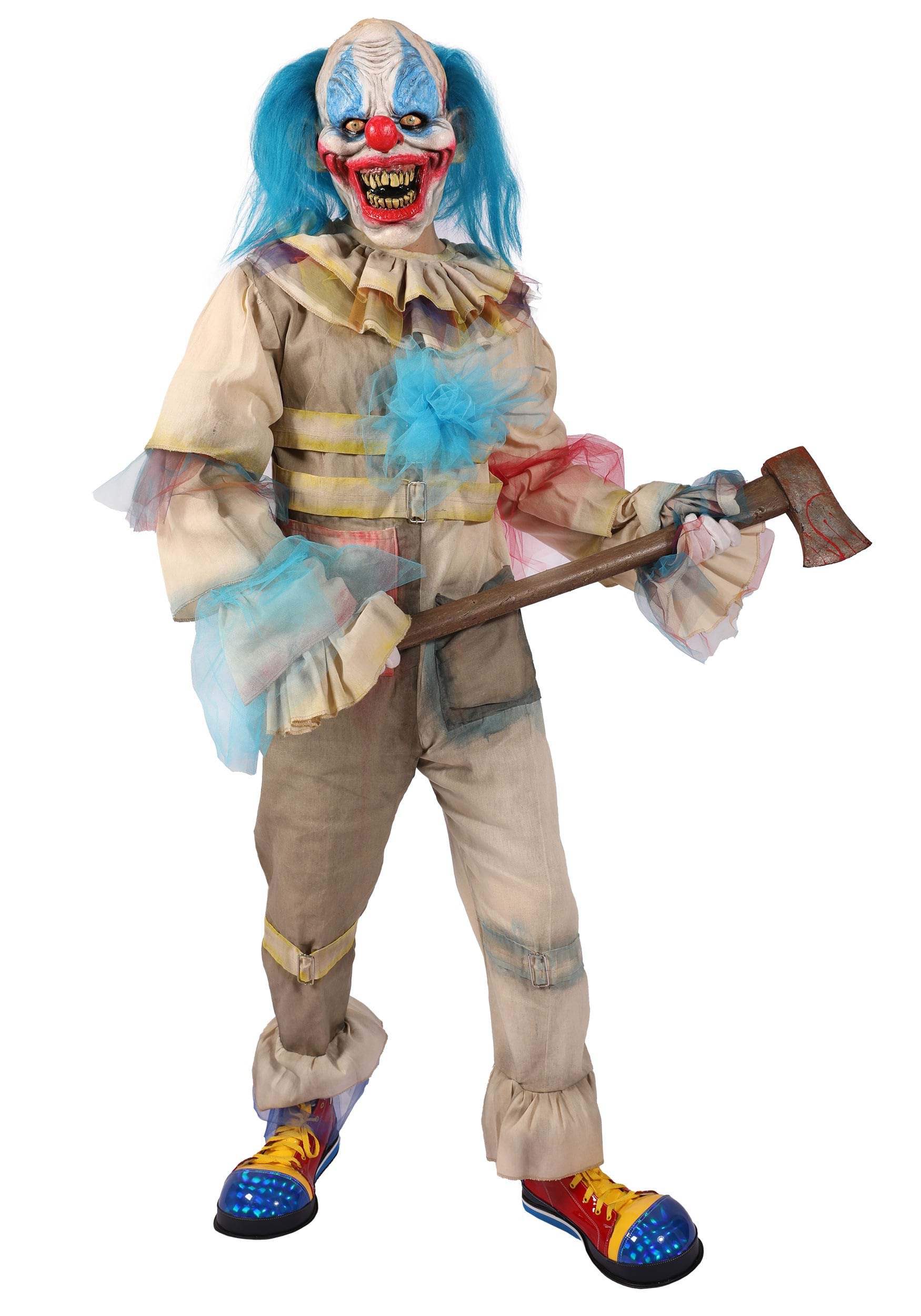 The star of the show is the Chuck the Clown mask: yellowed, cracked teeth in a perpetual snarl, exaggerated blue face paint, and tufts of wild blue hair on either side like a chaotic cotton candy explosion. The painted red nose and glassy stare really tie it all together, as in, you may want to tie your doors shut.