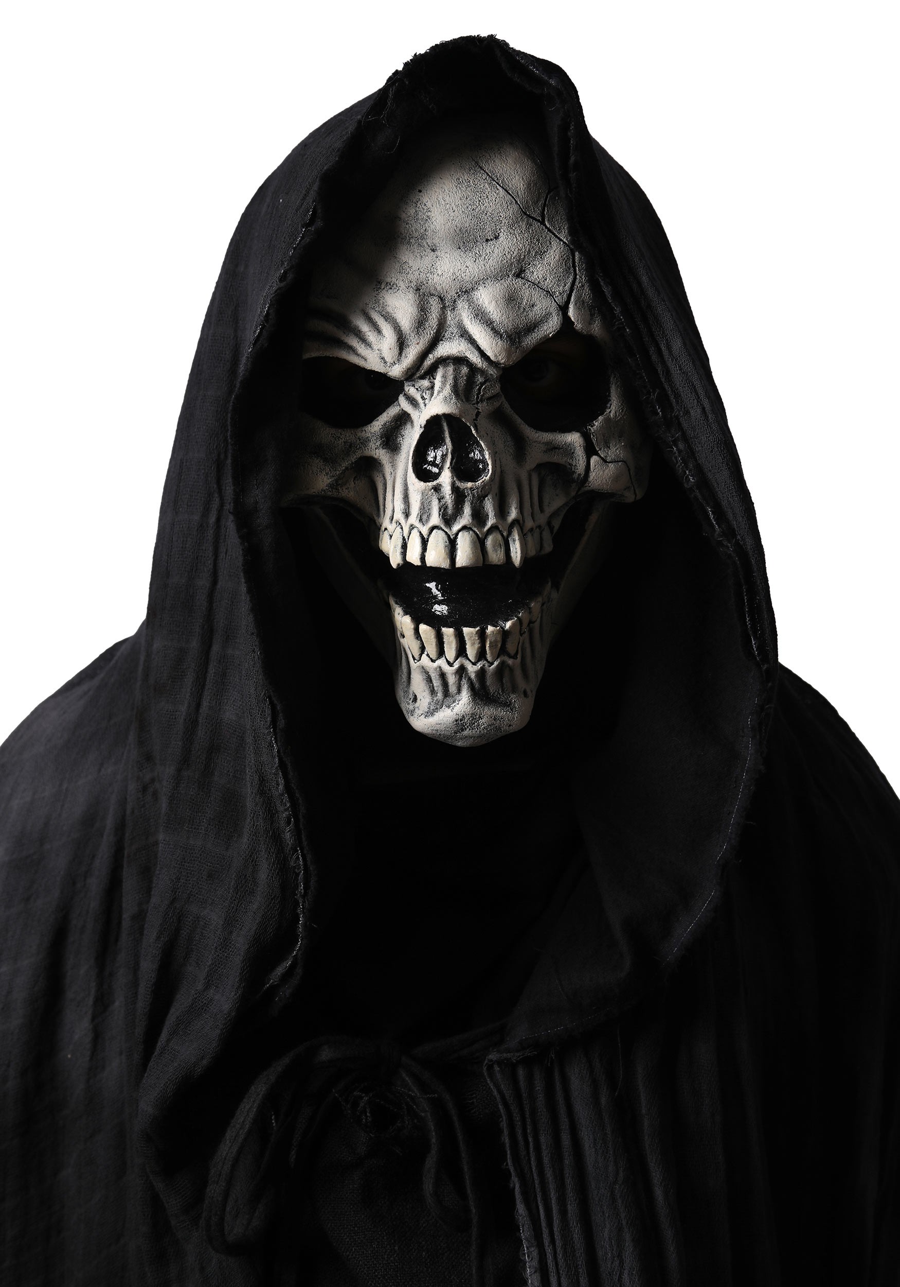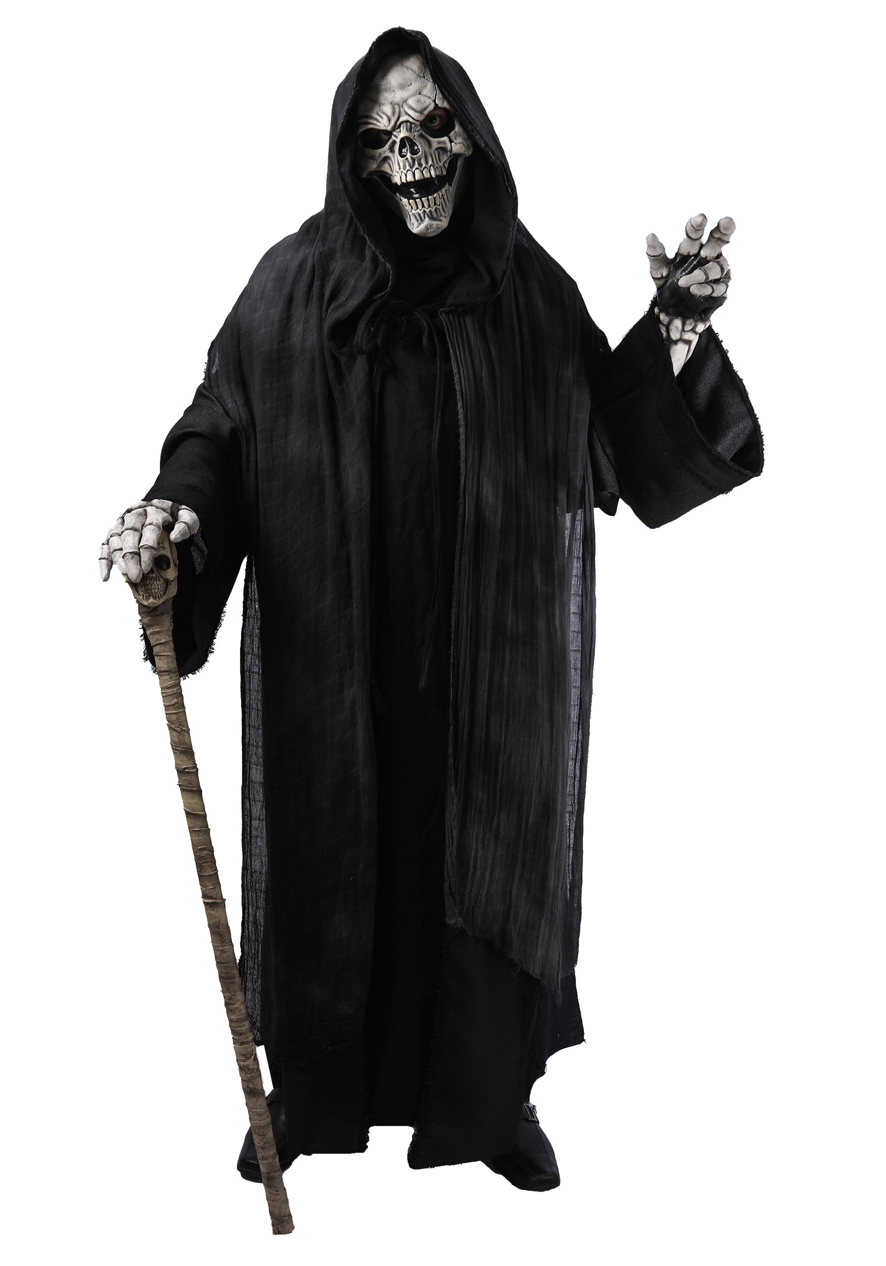 This three-piece costume includes a long, flowing black coat with shredded overlays that hang like the regrets of a thousand lost souls. The layers are textured, worn-looking, and drape over the arms and body like they’ve absorbed the cold from every haunted crypt this thing’s passed through. The hood is attached and deep enough to cast a shadow over most of your face, which is ideal—because the face underneath is not comforting.