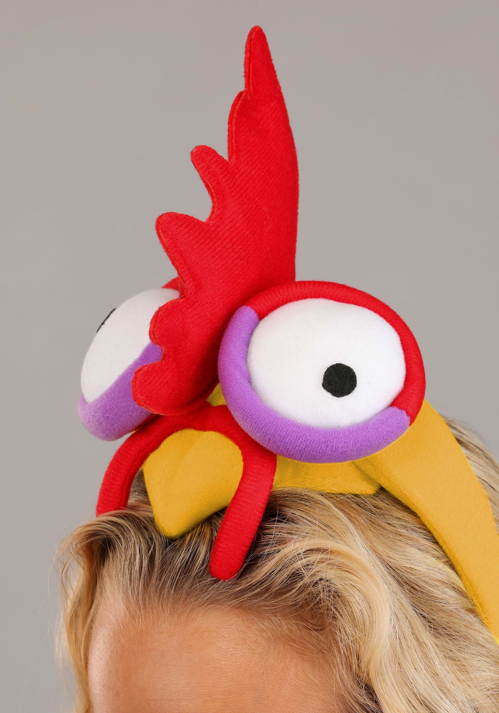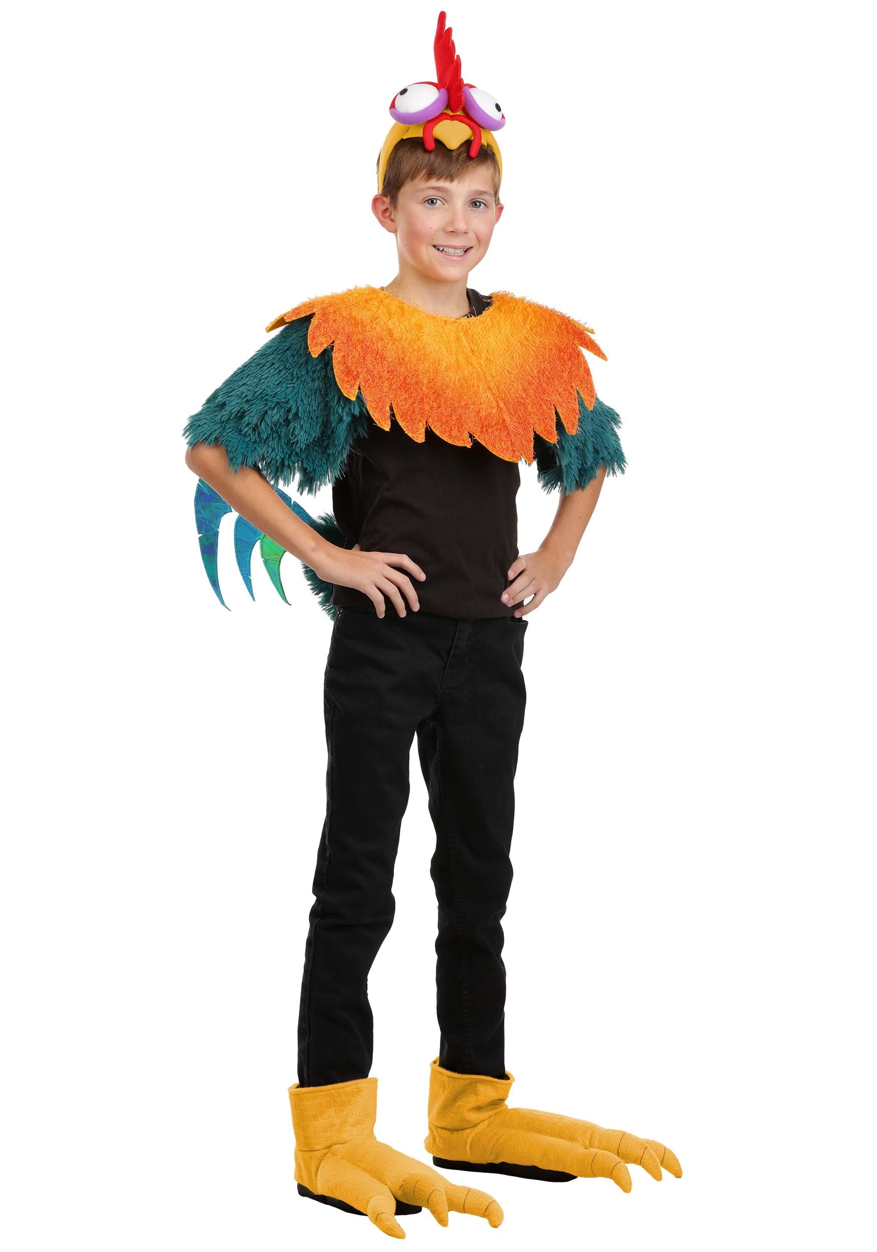 Bring Moana's quirky sidekick along for the fun with this costume kit! The four-piece set has a headband, collar with shoulder caps, tail, and shoe covers. Shaggy faux fur creates a feathery look for the headband, collar, and tail base, while shimmering lamé and glossy vinyl make the tail feathers, comb, and beak stand out. Large googly eyes ensure your impression is hilariously spot-on, and hook-and-loop fasteners keep everything in place.