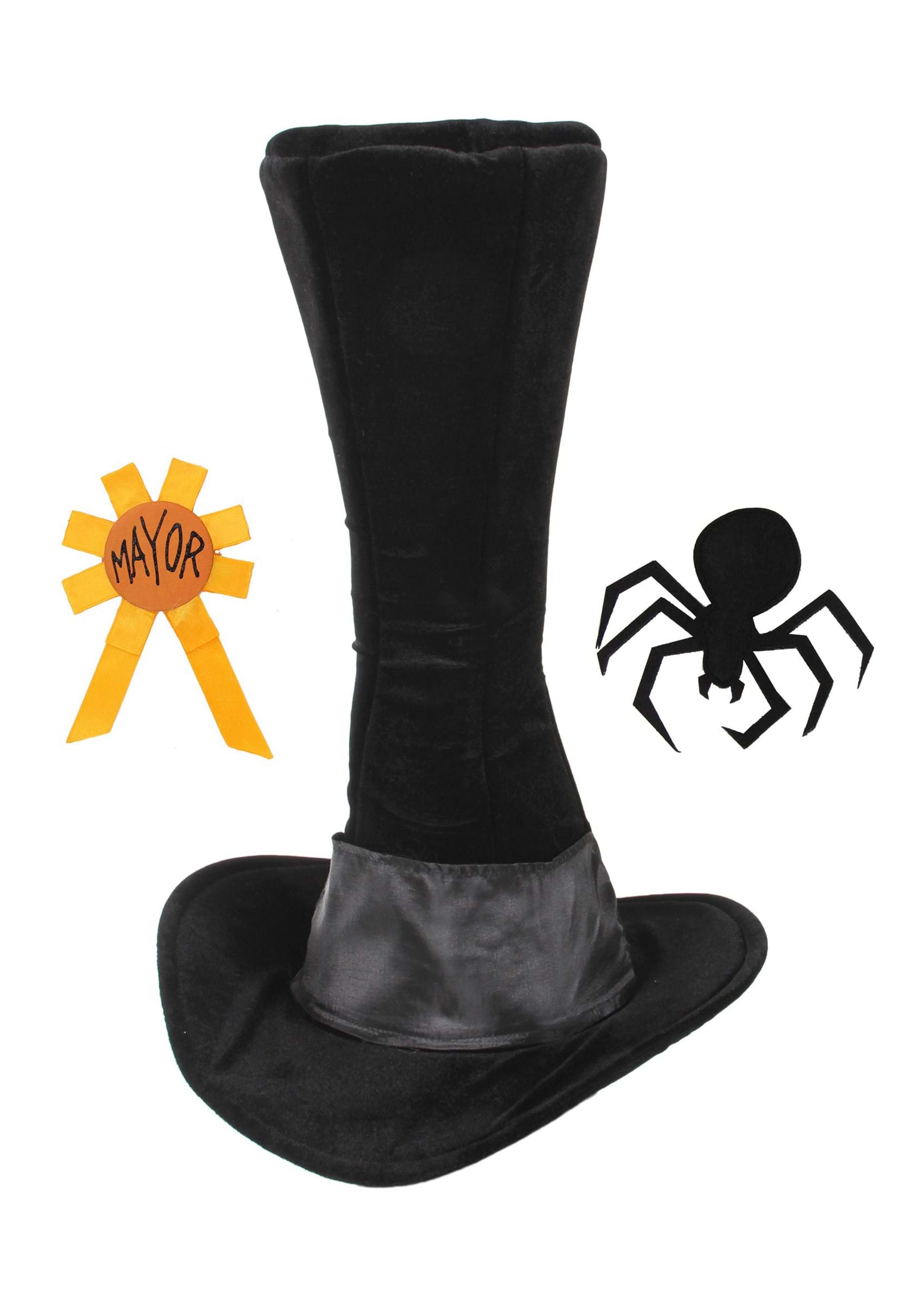 This officially licensed kit comes with the hat, spider bow tie, and badge. The stovepipe-type hat is soft to the touch and features wire in the brim, to maintain the larger-than-life appearance. The spider bow tie has an attached elastic band so it can stretch around the neck comfortably while the 'Mayor' badge fastens to clothing with a safety pin adhered in the back.