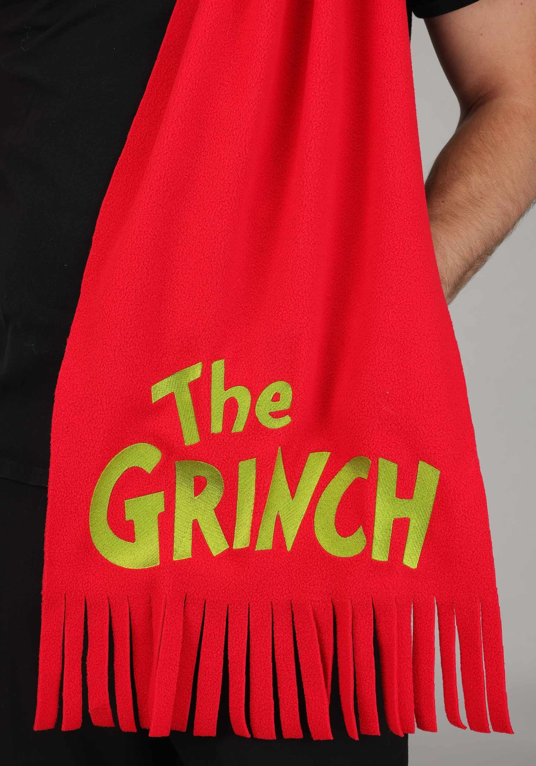 - Fleece scarf has embroidered The Grinch wording, fringe end