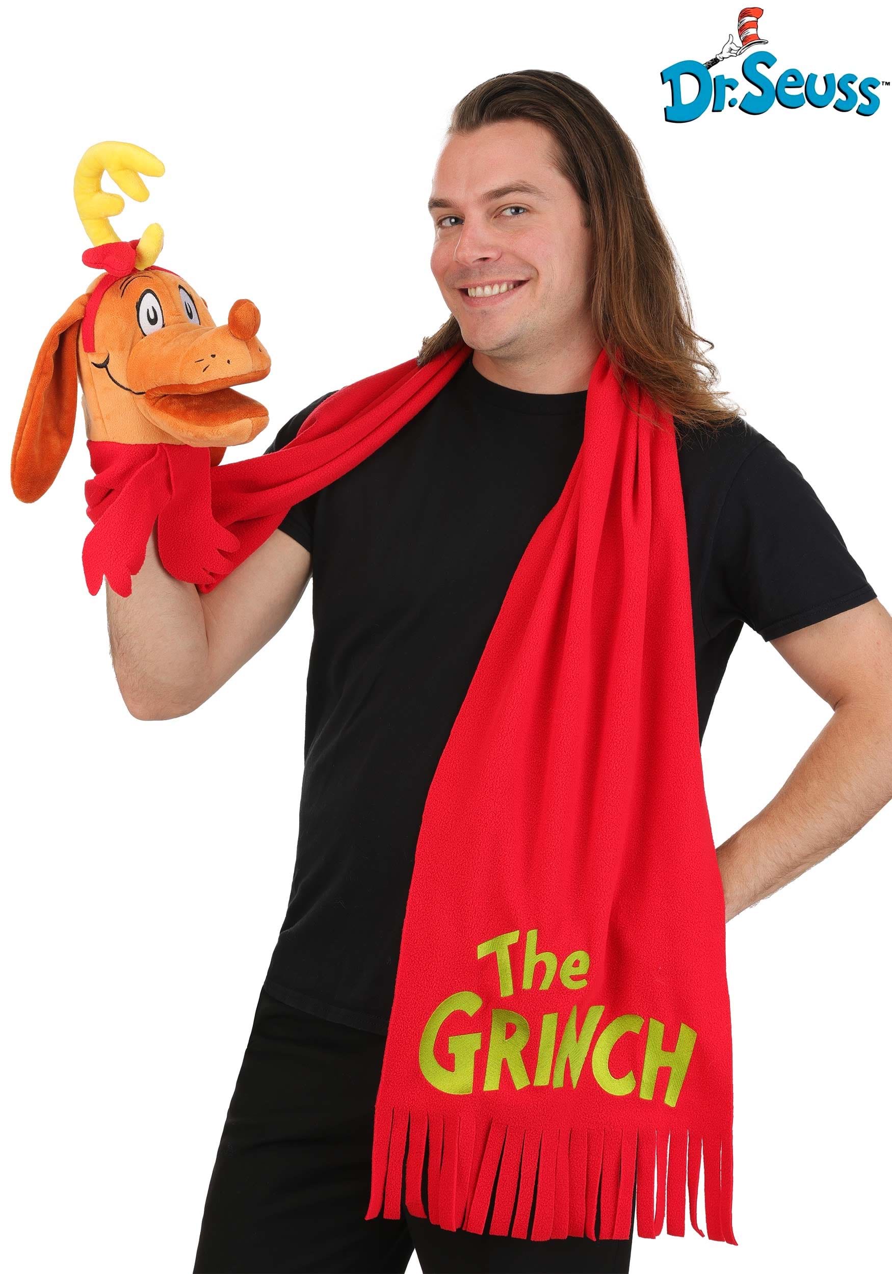 Crafted from soft, high-quality fleece, this scarf keeps you snug through every snowy outing or holiday party. One end features "The Grinch" logo embroidered in bold green lettering—instantly recognizable to any Dr. Seuss fan—while the other showcases a plush Max the Dog head made from a soft minky fabric. His stitched features and single antler capture all his on-screen charm.
