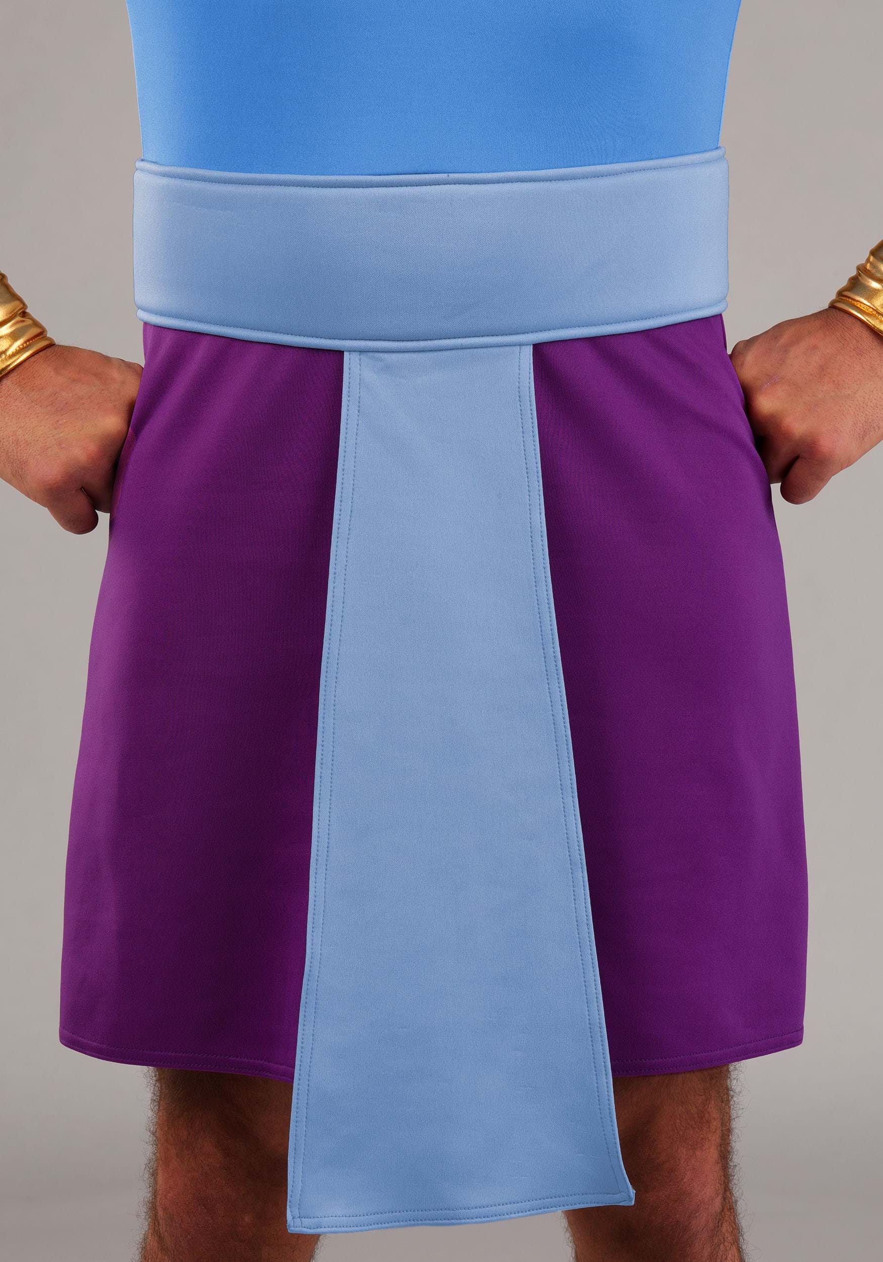 A long color-blocked tunic starts this officially licensed costume. The combo of purple skirt, blue bodice with light padding, and a metallic gold lamé inset ensure a look just like Kronk's. Meanwhile, its pullover design and hook-and-loop fastener in the back offer quick and comfortable dressing. A belt with a sash in the front secures with hook-and-loop tape. A metallic gold hat and coordinating hook-and-loop fastened cuffs for wrists and ankles complete the look.