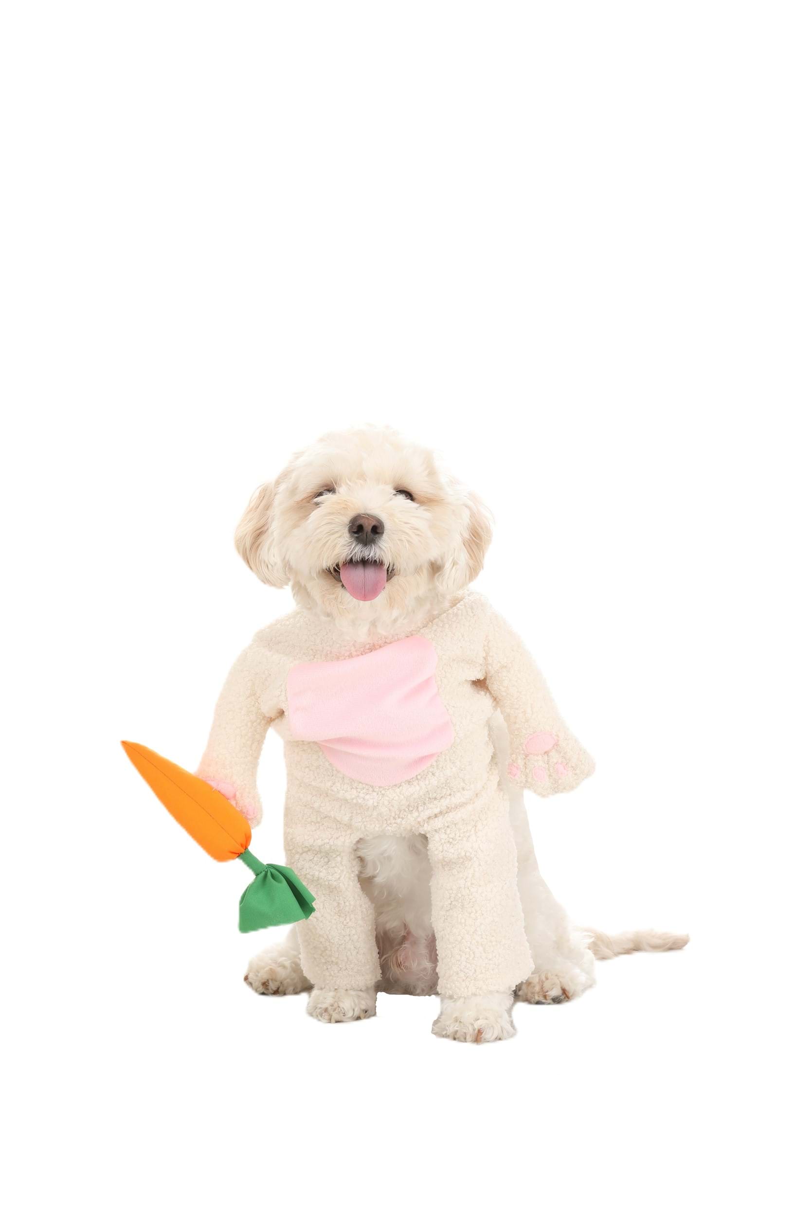 This costume for dogs comes with two main pieces: a bodysuit and a matching headpiece. It’s made from 100% polyester because, you know, if you’re going to dress your dog as a bunny, you might as well do it right. The bodysuit is a curly plush wonderland that fastens on the back with a hook and loop, so getting your dog into this thing is easier than getting him to sit still for a photo. There are two front leg holes because dogs, unlike actual bunnies, don’t hop—they walk.