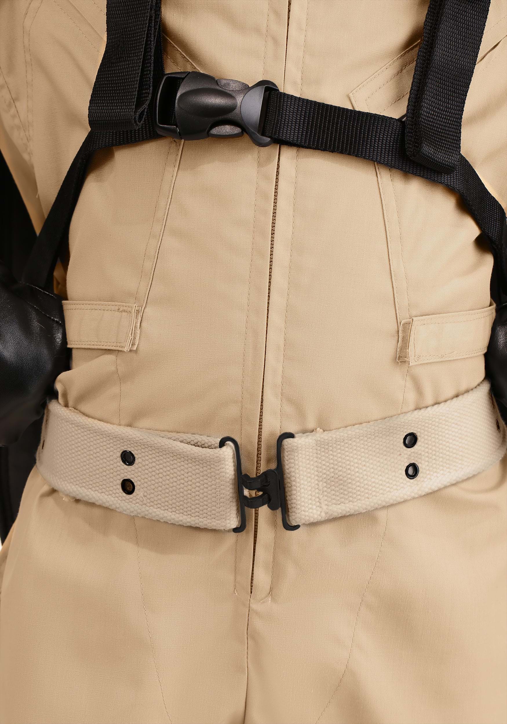 - Jumpsuit has front zipper closure and zippered pockets on front