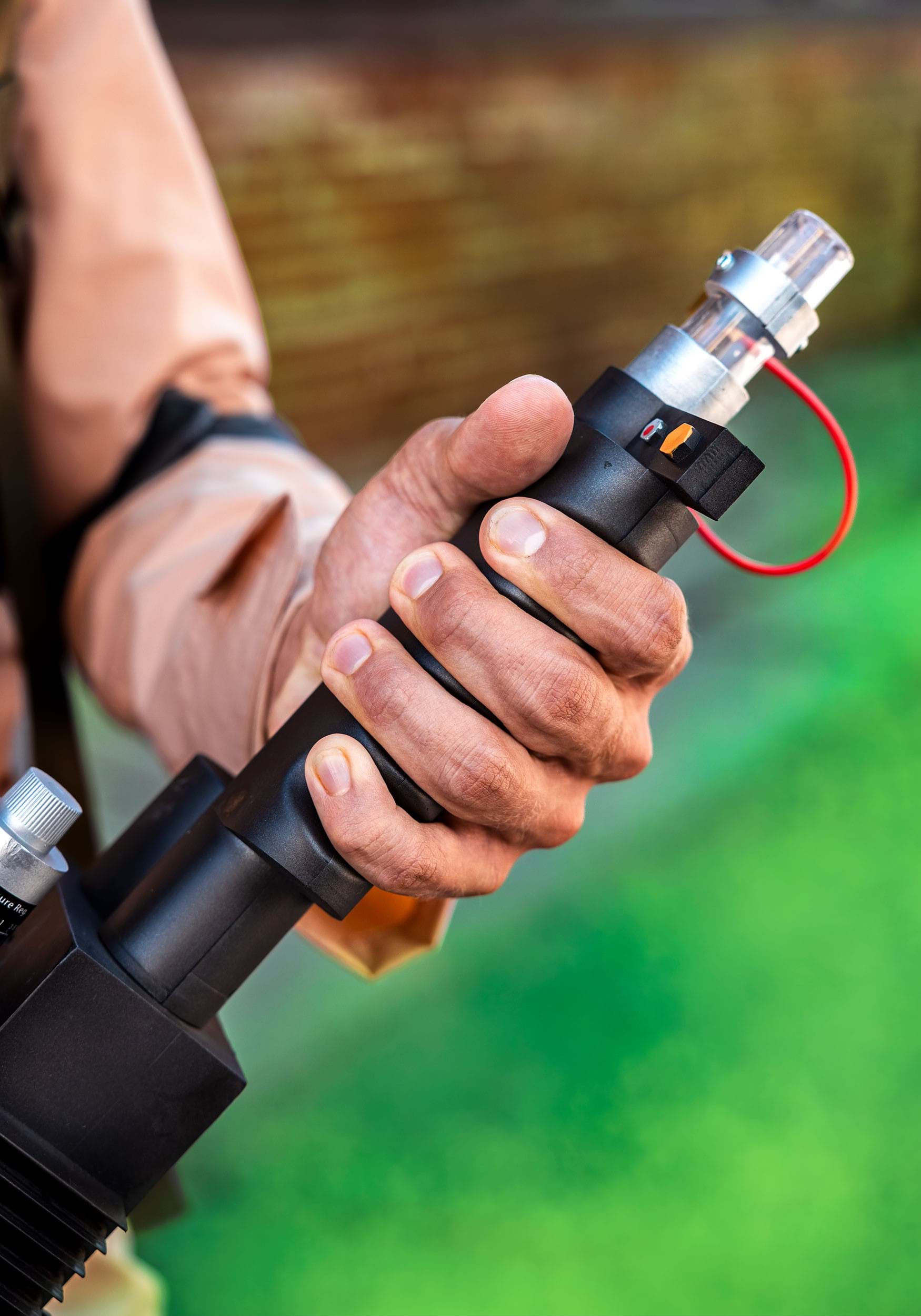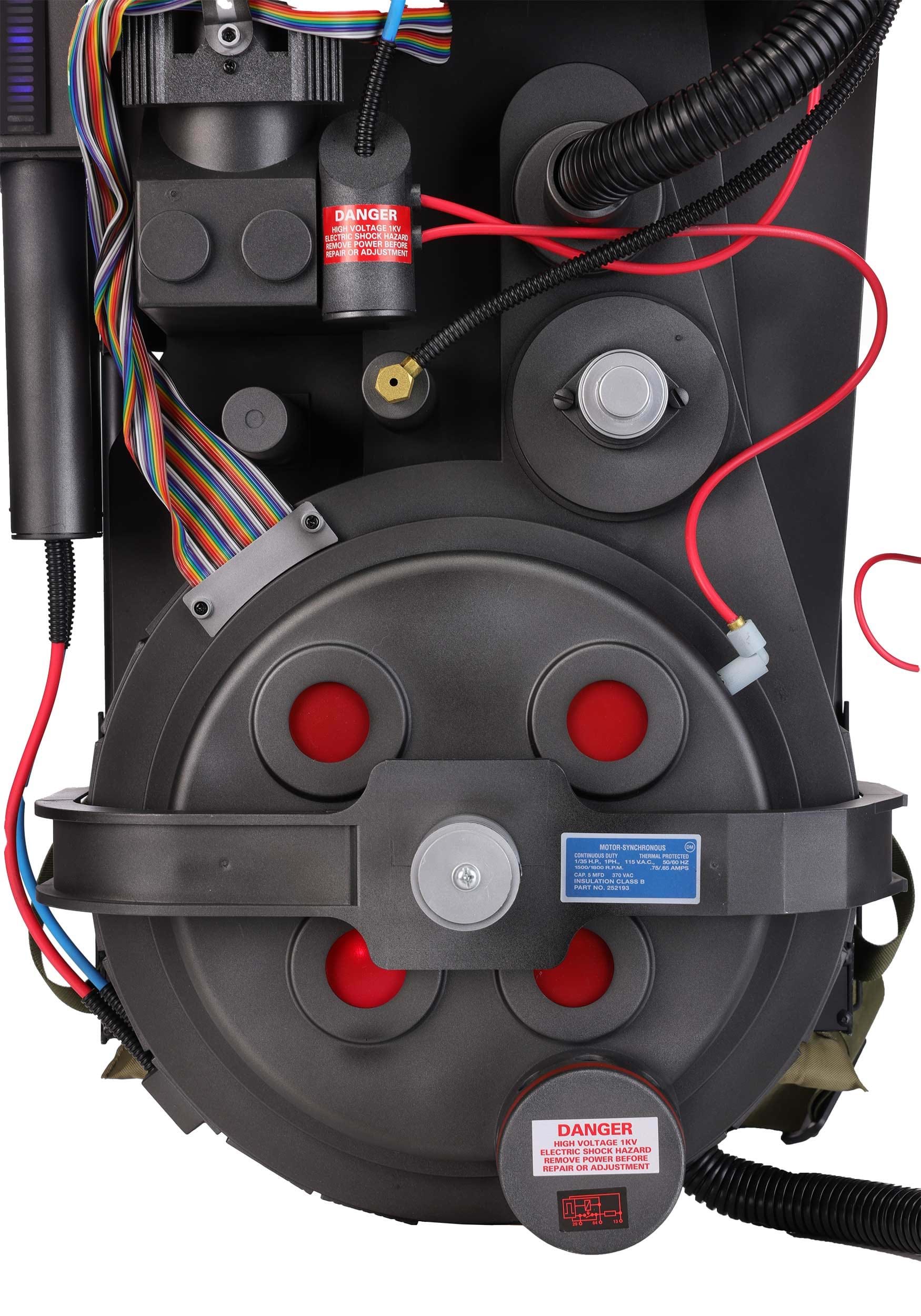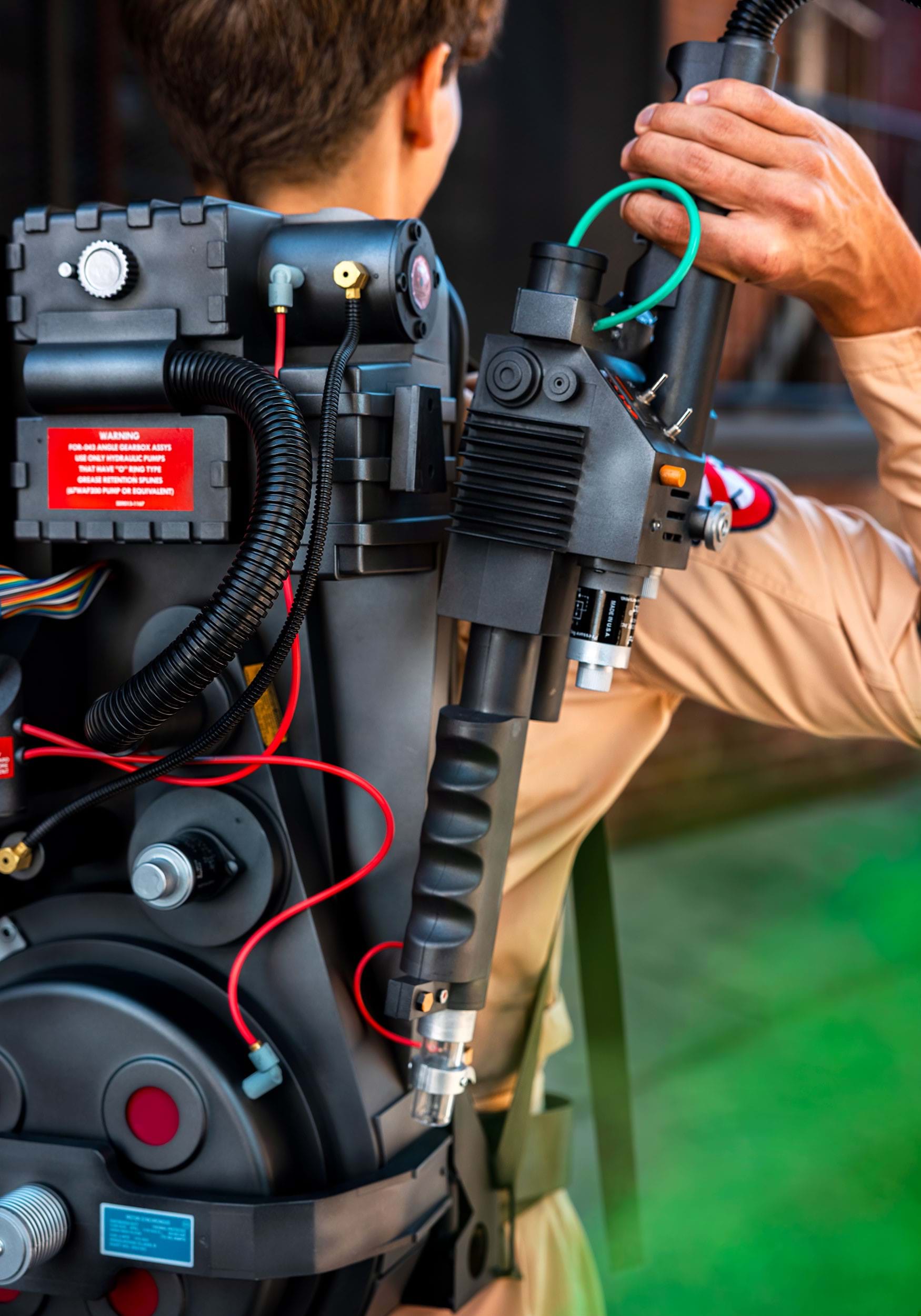 A push-button on the wand grip activates movie-style lights and sounds—yes, the hum is back, and it’s glorious. Just lflip the switches, and pull the trigger and the wand vibrates like it's ready to take down Slimer. Once it's powered on, it's like stepping into a scene with Venkman and the gang. Complete with a red light-up feature at the end and further lighting effects on the pack. Of course, Slime sold separately.