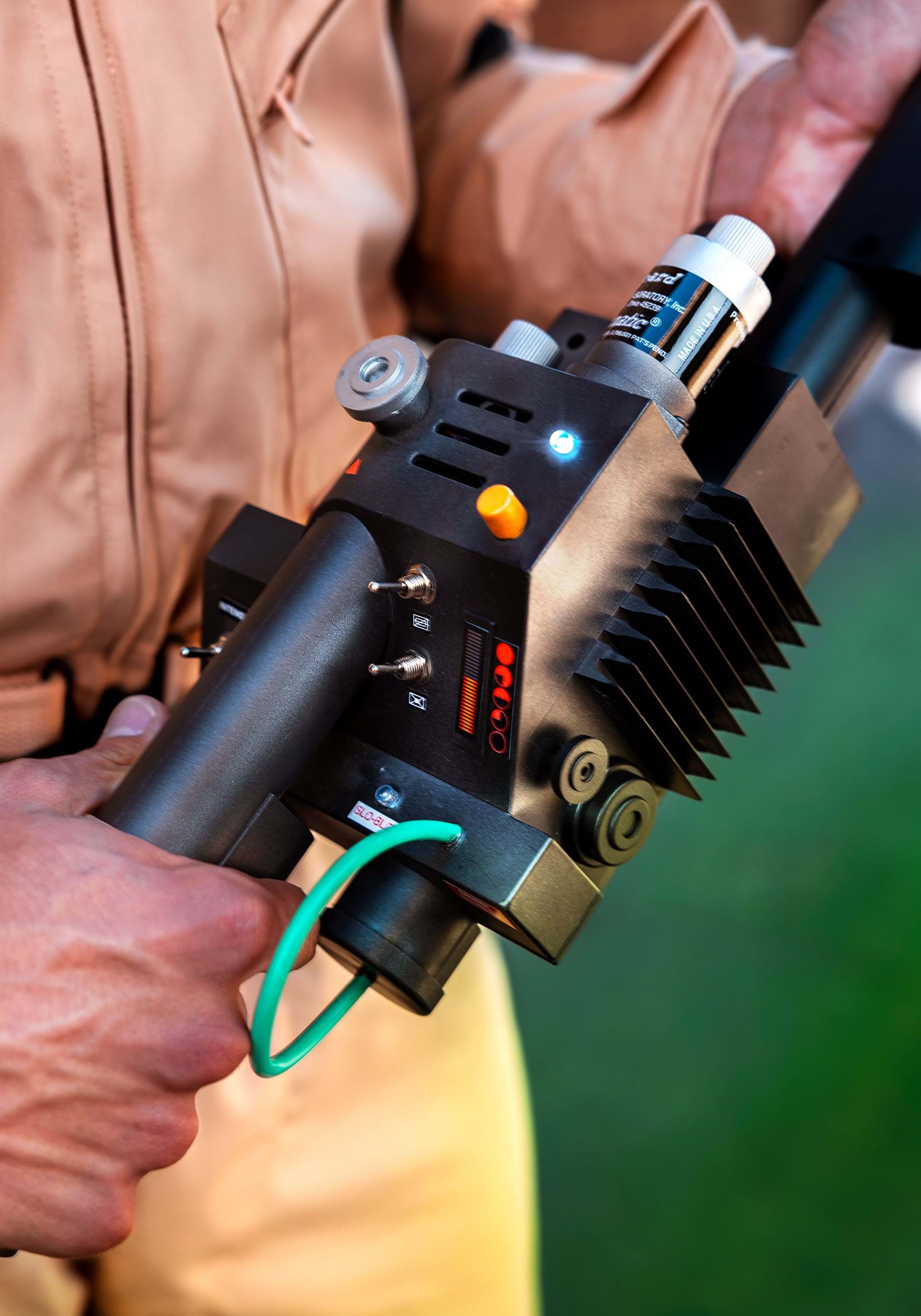 - When activated by push button on wand grip, pack lights up and makes movie realistic sounds