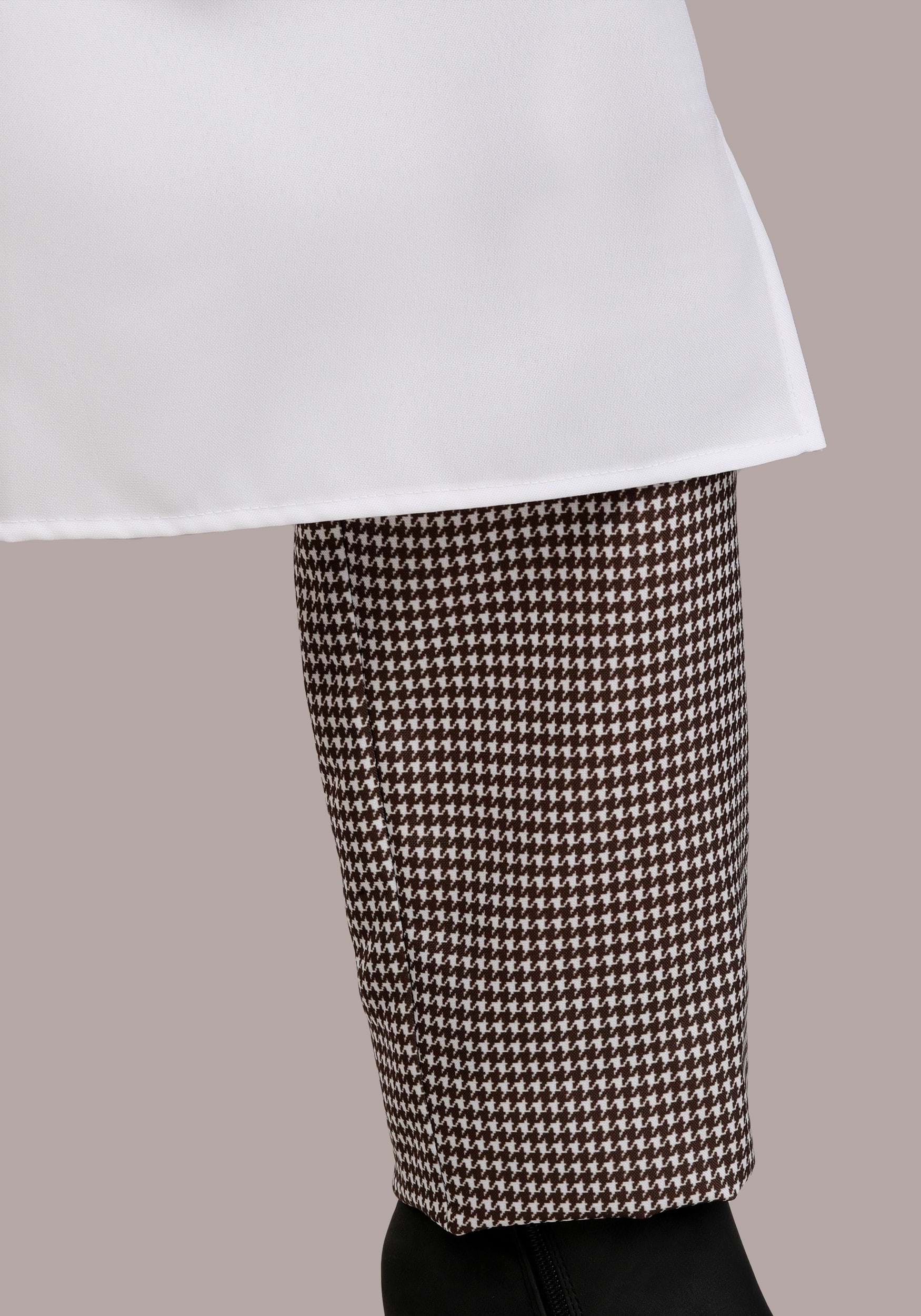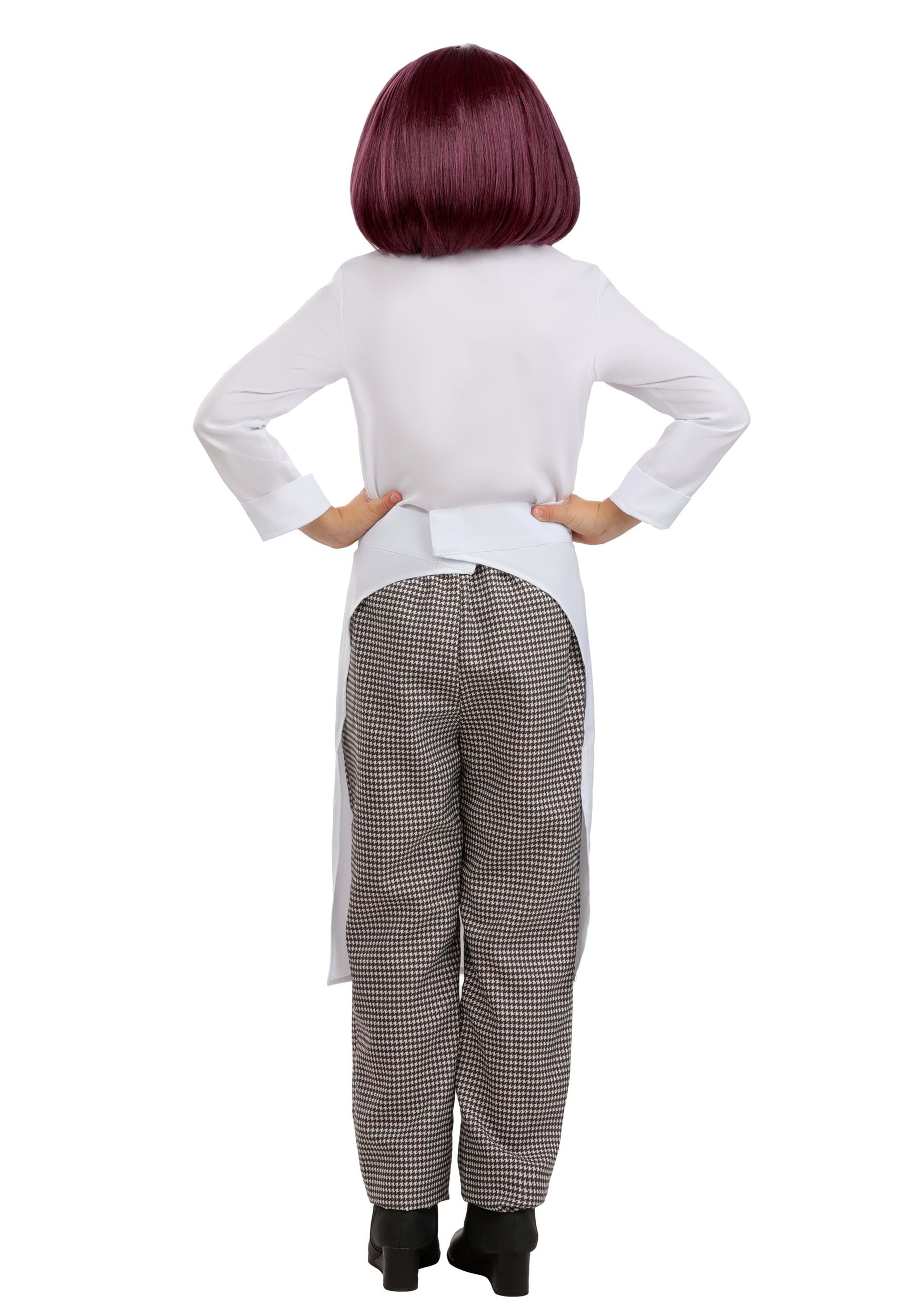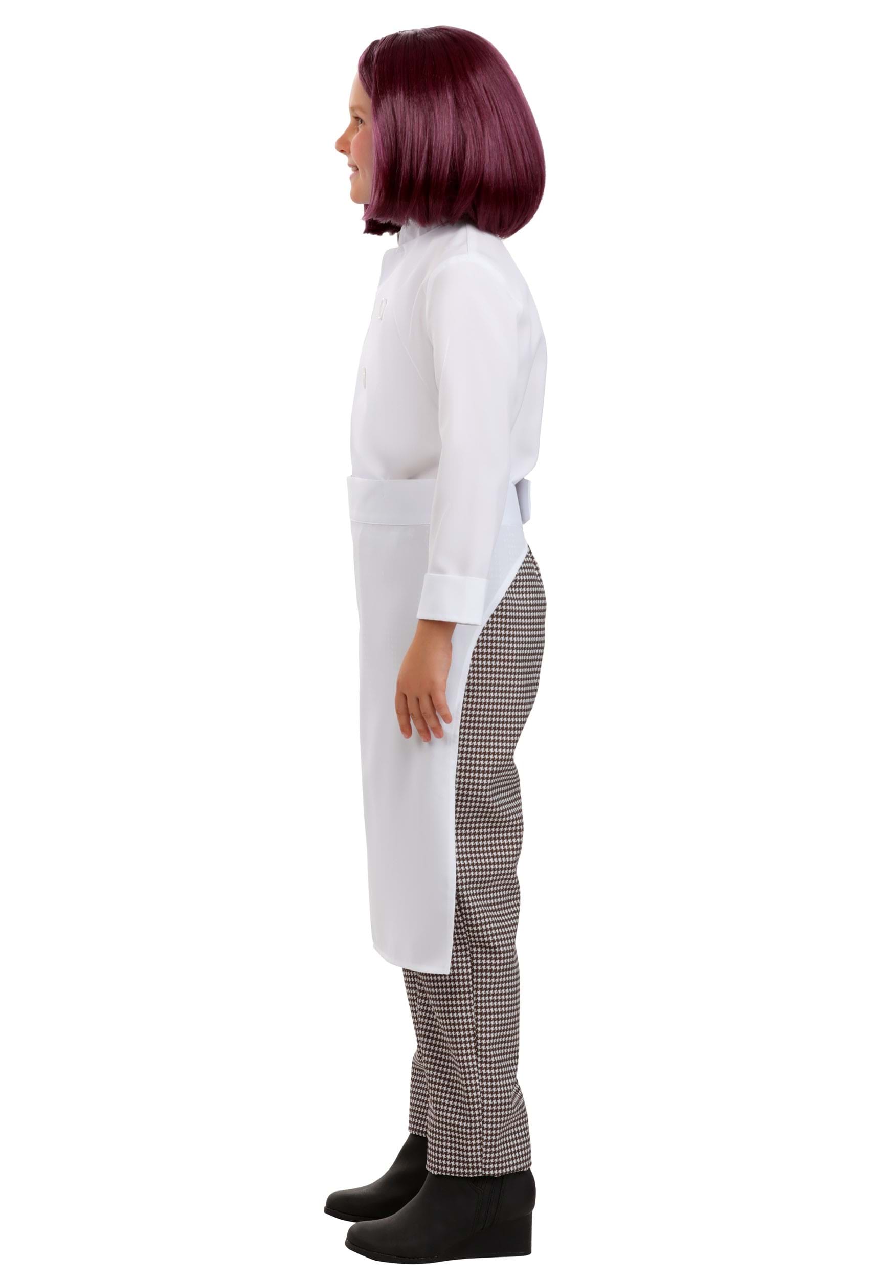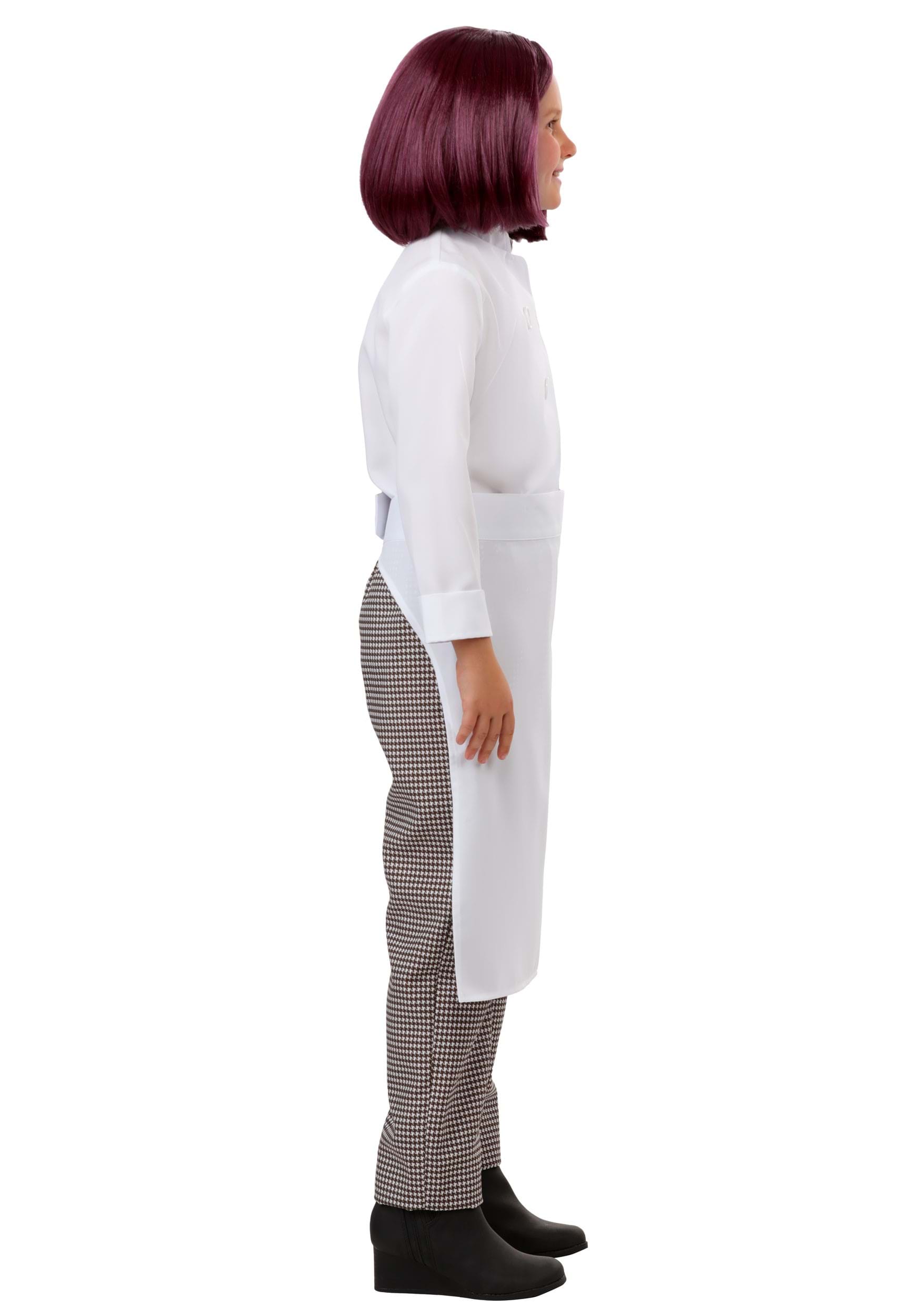 The outfit features a lightweight chef's jacket with soft woven fabric, button accents, and turned-up cuffs. Matching houndstooth pants have a stretchy waistband for ease while whisking or twirling. A coordinating apron secures quickly in the back with a hook-and-loop closure. Topping it all off is a deep plum wig styled into Colette's sleek bob, crafted with a comfy mesh cap and elastic for a stay-put fit.