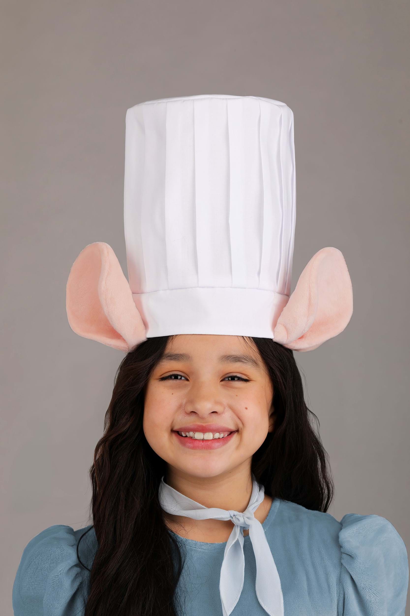 The soft Minky dress zips up the back and features a tulle underskirt for extra fluff and flair. A wire-supported tail is sewn into the back for a sculpted Remy silhouette, while a tie-on neck scarf adds a dash of Pixar polish. Matching Minky shoe covers are shaped like paws and stay in place with ankle straps and underfoot elastic. The chef's hat stands tall with foam support and plush pink ears!