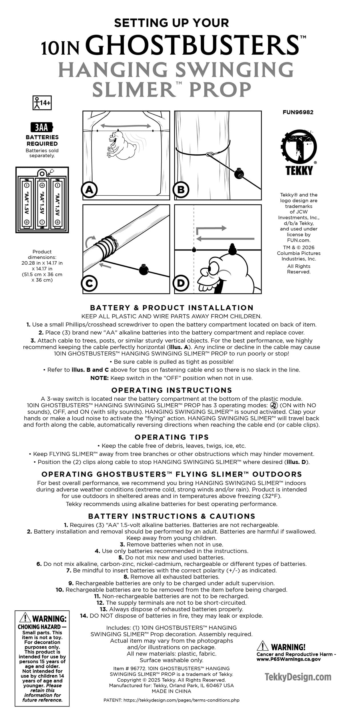 But wait—he doesn’t just glide. Slimer lights up and lets out his unmistakable ghost sounds, turning your yard into a one-ghoul light show. The on/off switch is easy to flip when it’s time to power down the mayhem. Just pop in 3 AA batteries (sold separately), and he’s ready to ride.