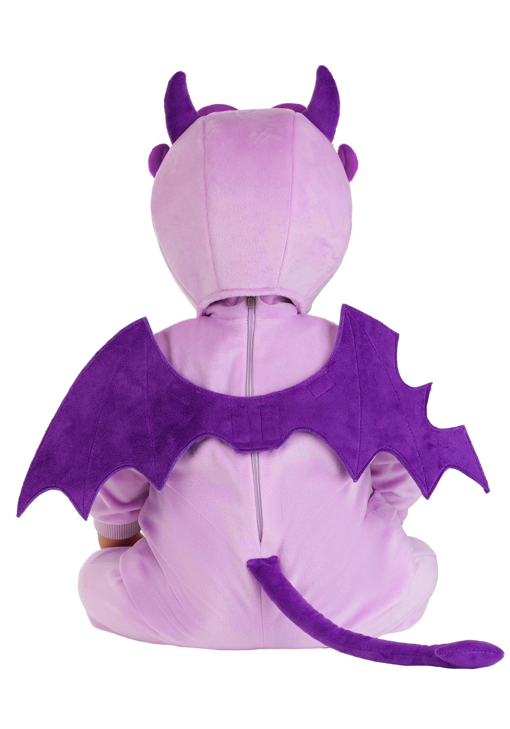 This Made By Us baby outfit is a cozy purple cuddle-plush jumpsuit with a zipper back for easy dressing. The soft polyfill tummy sports a whimsical swirly belly button design, while rib-knit cuffs at the wrists and ankles ensure a snug, comfy fit. Asymmetrical wings attach securely with hook-and-loop fasteners, and the pointy tail adds a mischievous touch. The matching headpiece with minky hair, horns, and embroidered features completes the look!