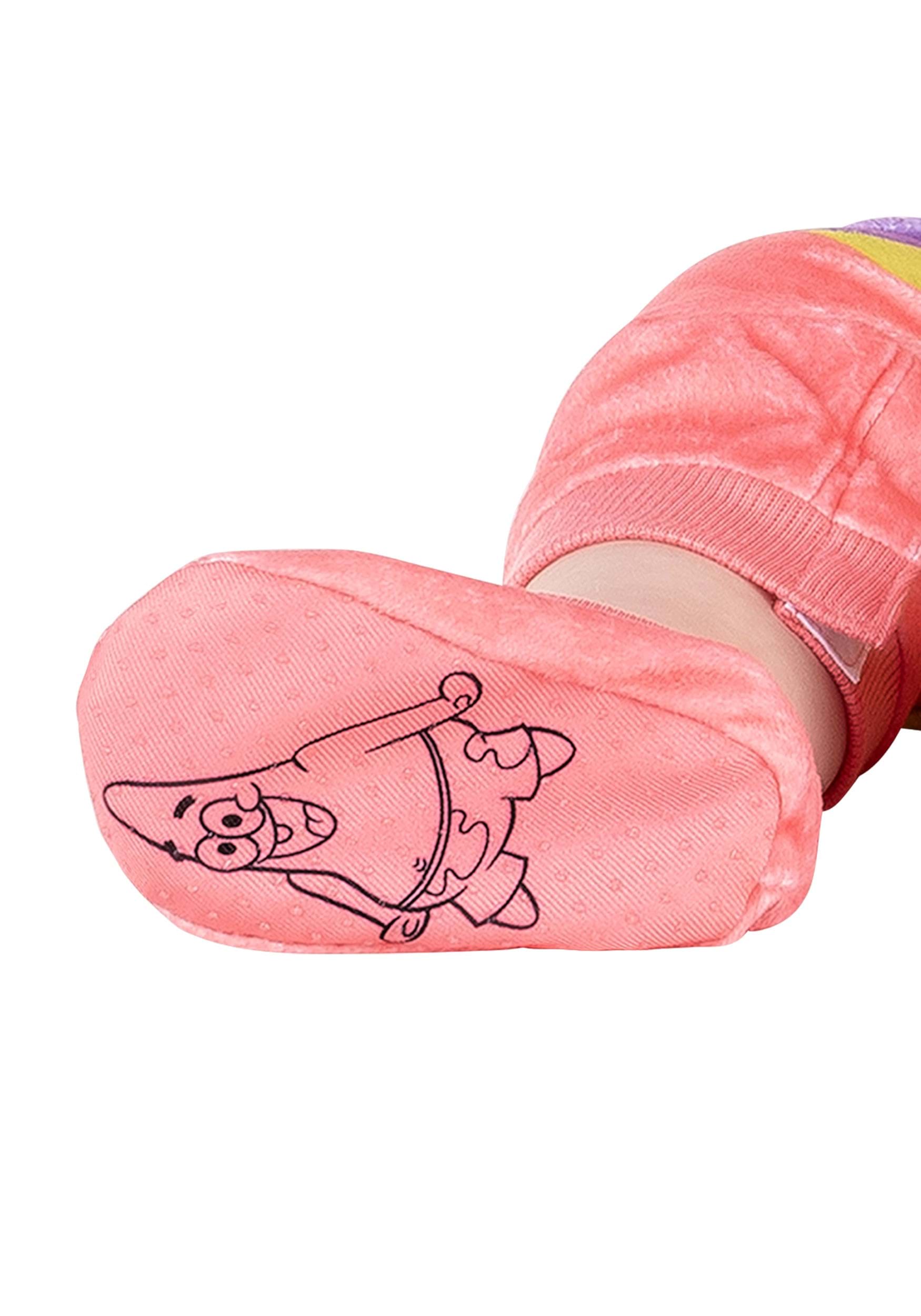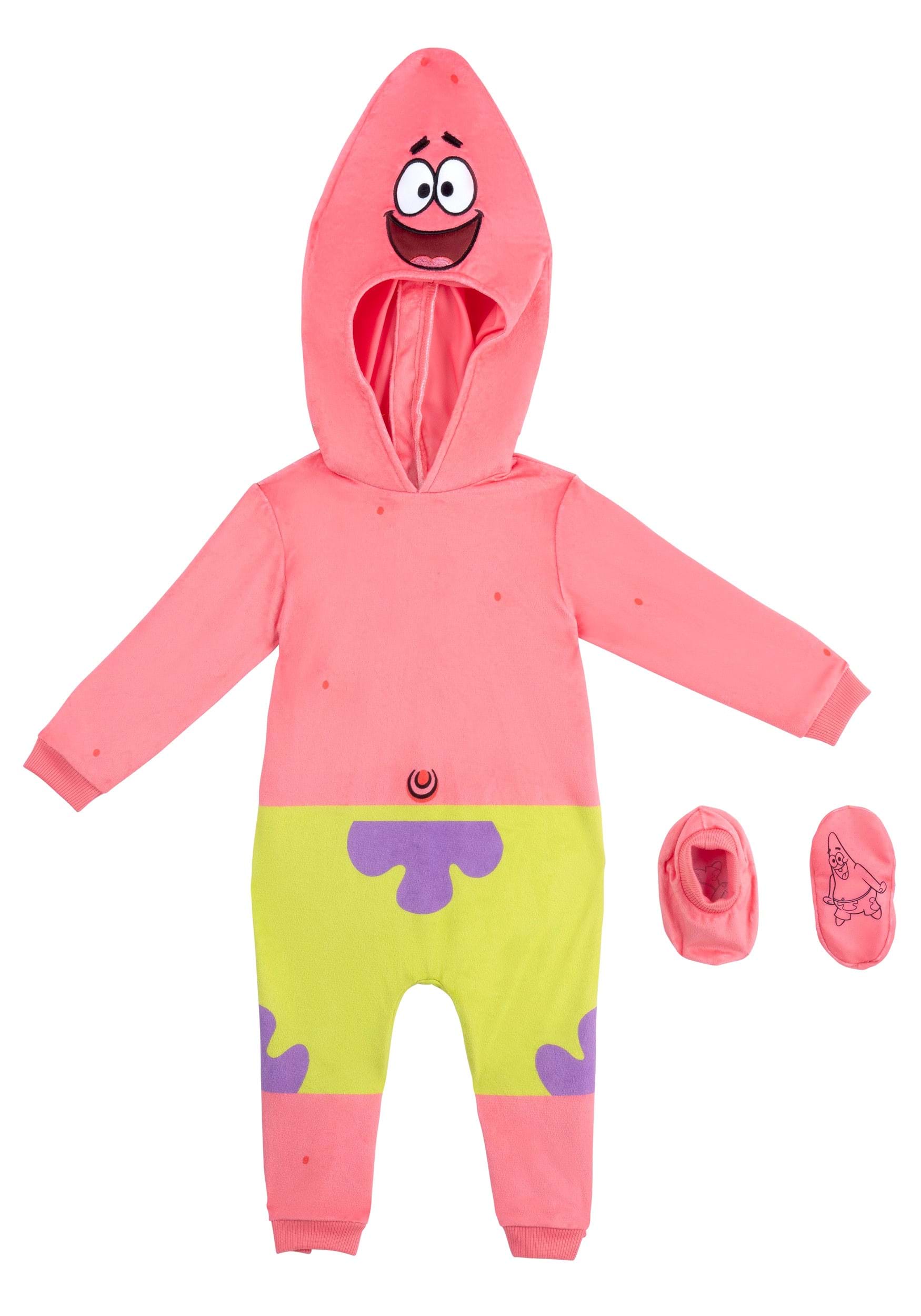 The attached hood is the true show-stealer, shaped just like Patrick’s pink noggin and featuring his wide-eyed, open-mouth smile. Matching pink footies slip on and off and come printed with little Patrick graphics, adding just the right splash of underwater chaos to your baby’s feet.