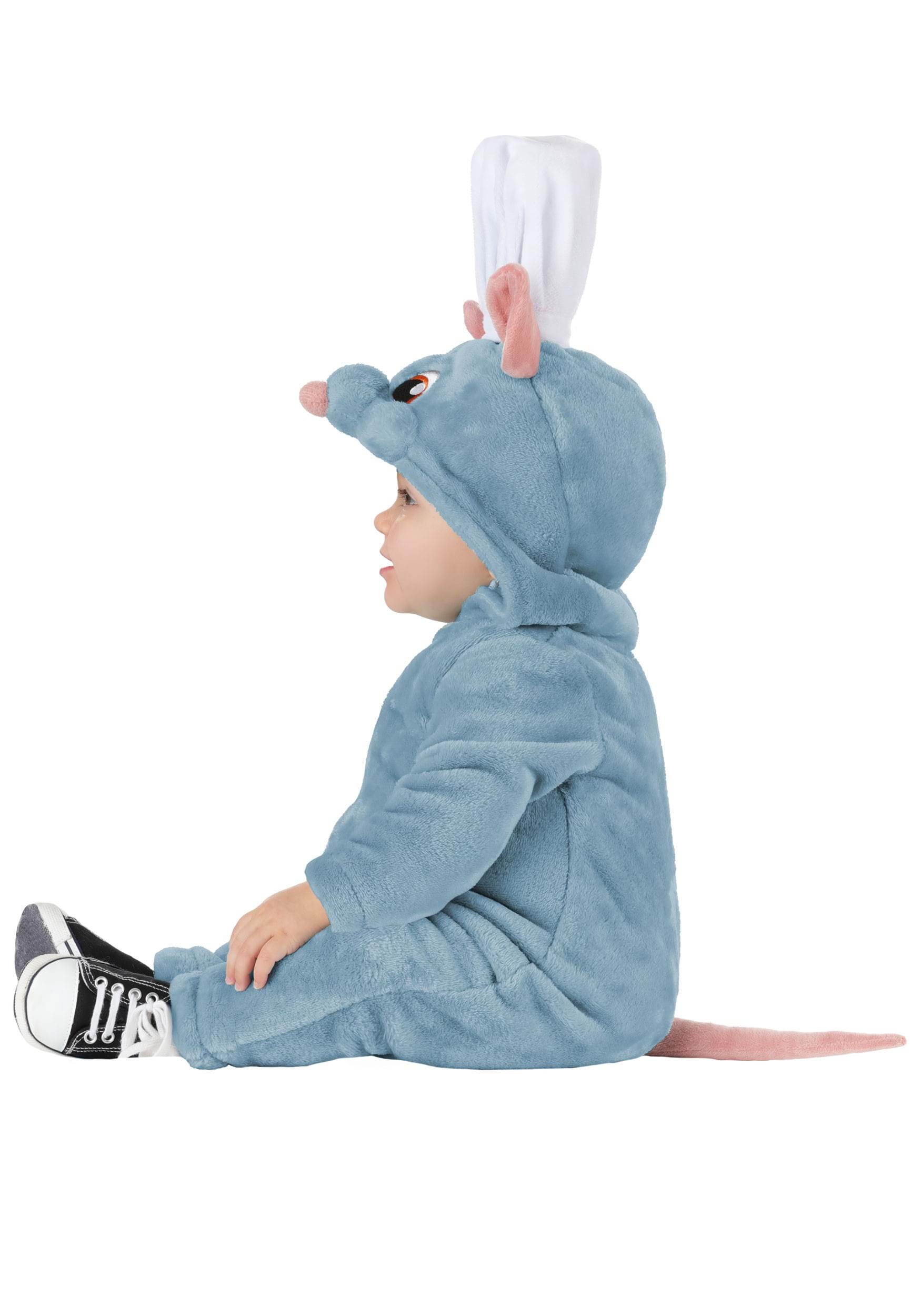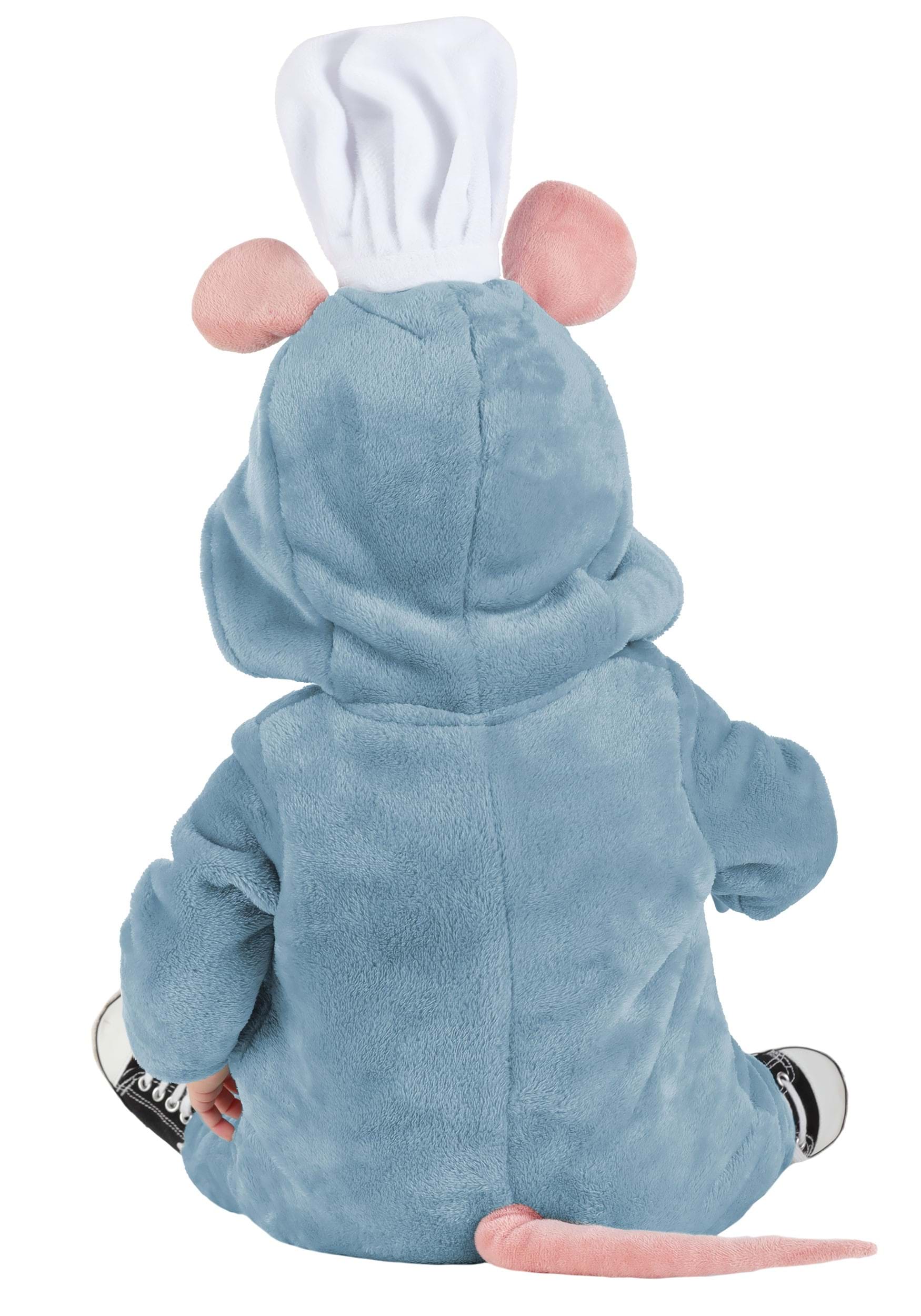 The plush blue jumpsuit features a gentle zipper at the front for easy dressing and handy snaps for quick diaper changes. A softly padded belly and securely stitched tail add sweet dimension, while the attached hood showcases Remy's embroidered eyes, plush nose, and soft Minky ears. Topped with a padded chef's hat, this all-in-one design is crafted for comfort and adorable character charm.