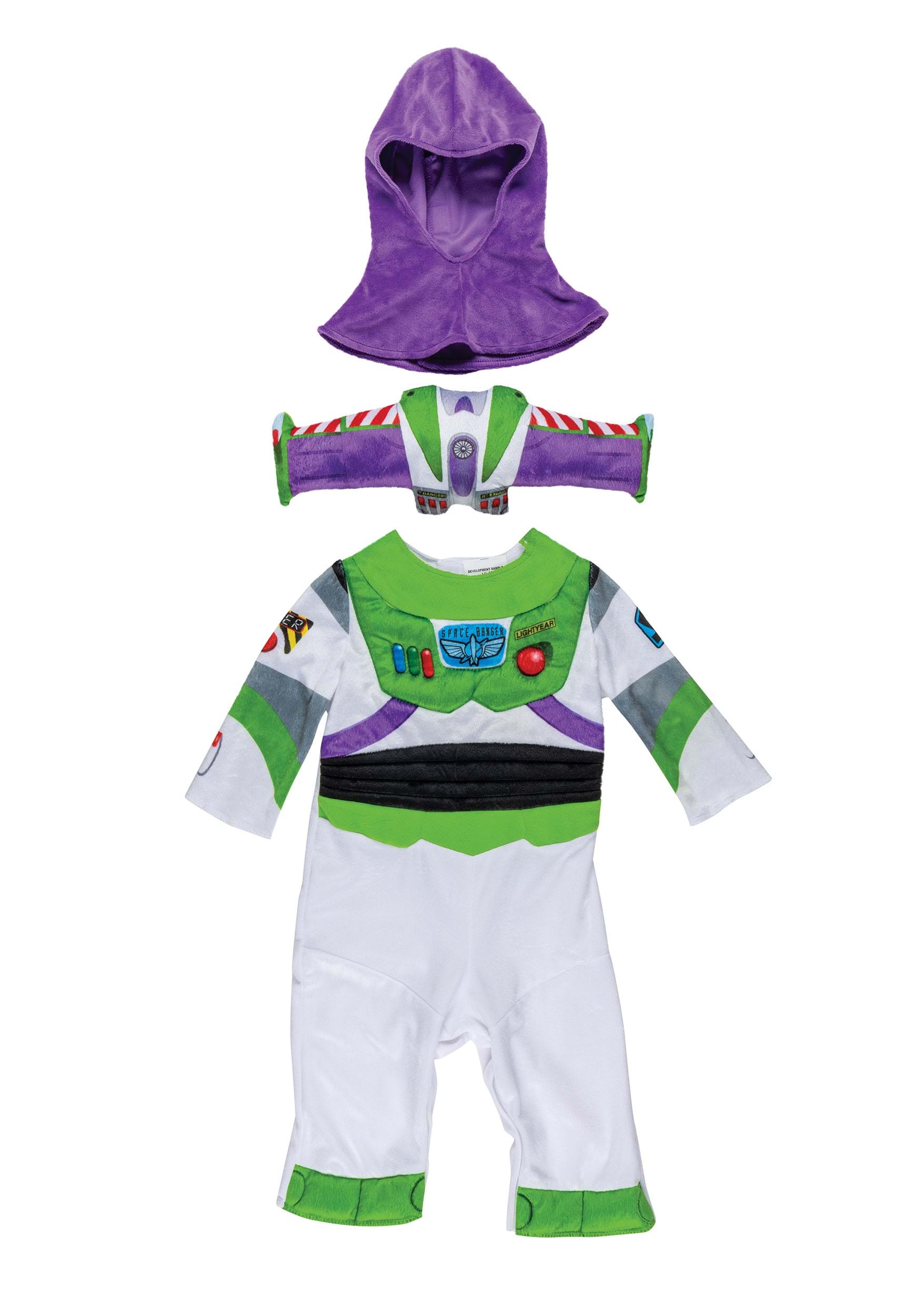 The velour jumpsuit captures the full Buzz Lightyear look: crisp white and green with printed chest details that include colorful buttons and the Space Ranger insignia. The stretchy purple headpiece slides on easily and the cowl tucks right into the neckline when needed. Hook and loop fasteners run down the center back for easy on and off, and there's an inseam opening specifically designed for diaper access, because even Space Rangers have logistics.