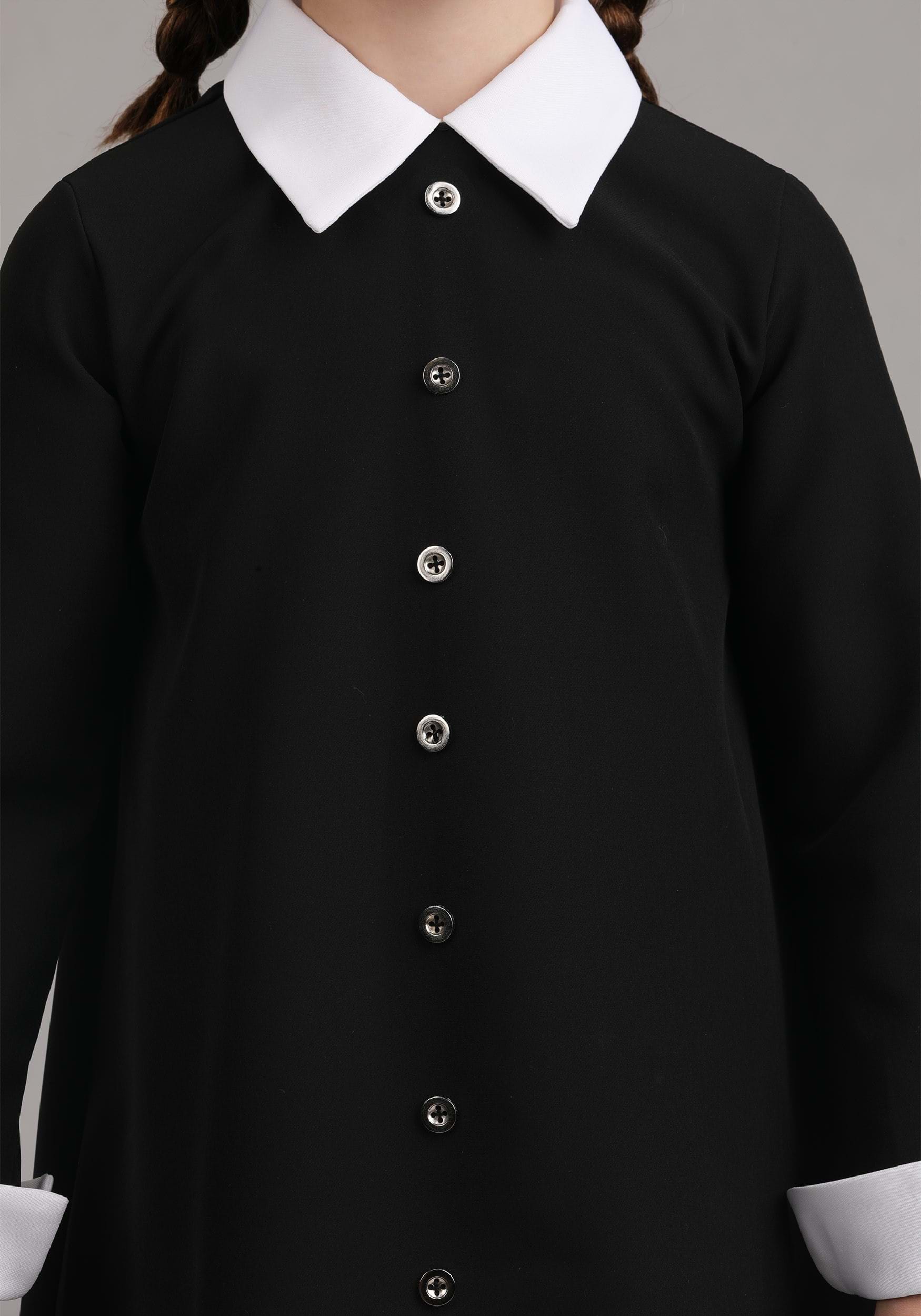 The collar and cuffs are made from poly woven fabric for that crisp, classic Wednesday contrast. The collar fastens at the back with an elastic loop and button closure, keeping it secure even during dramatic monologues or haunted hopscotch. The entire look is officially licensed, so fans of the original series will recognize the vintage Addams accuracy.