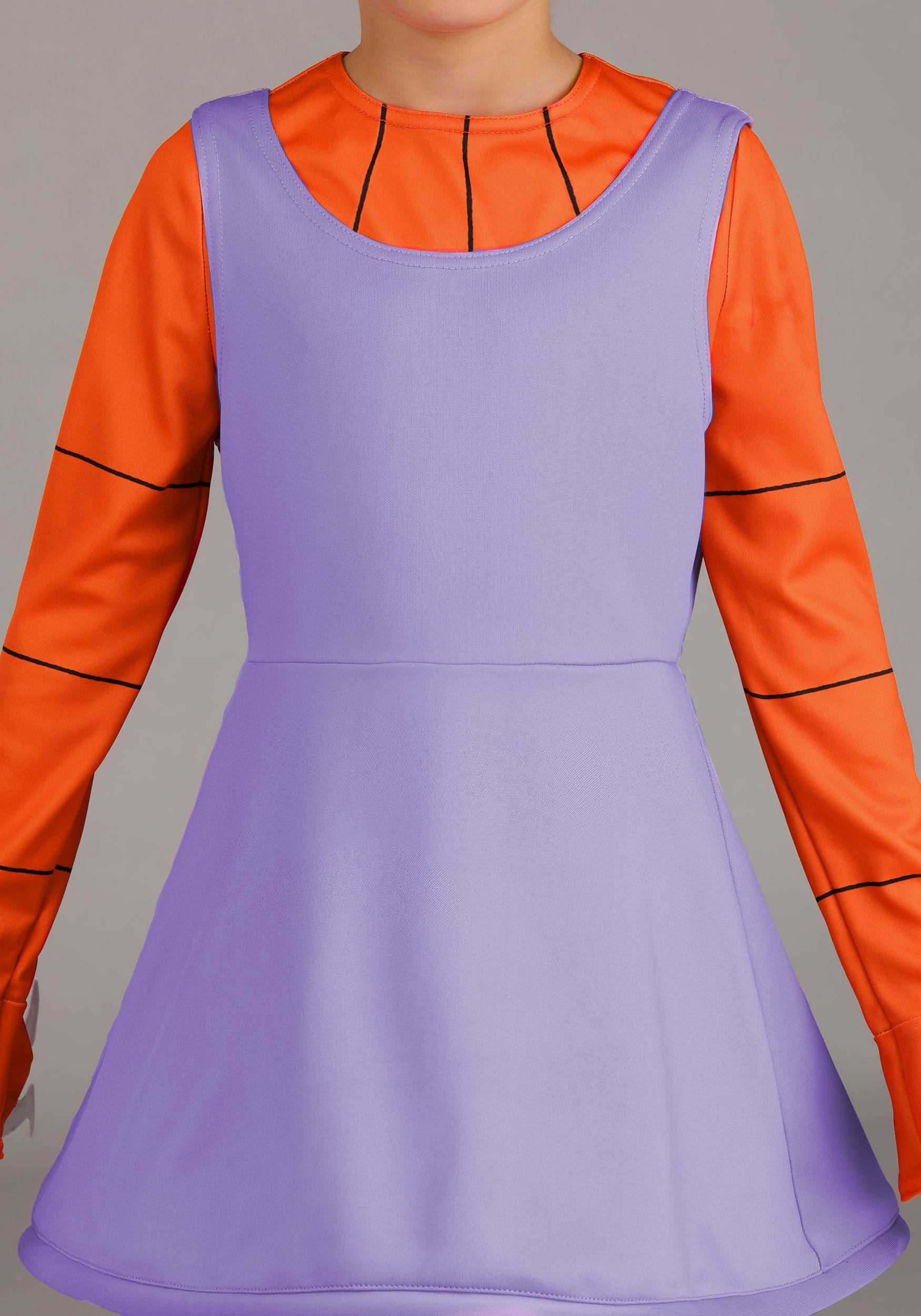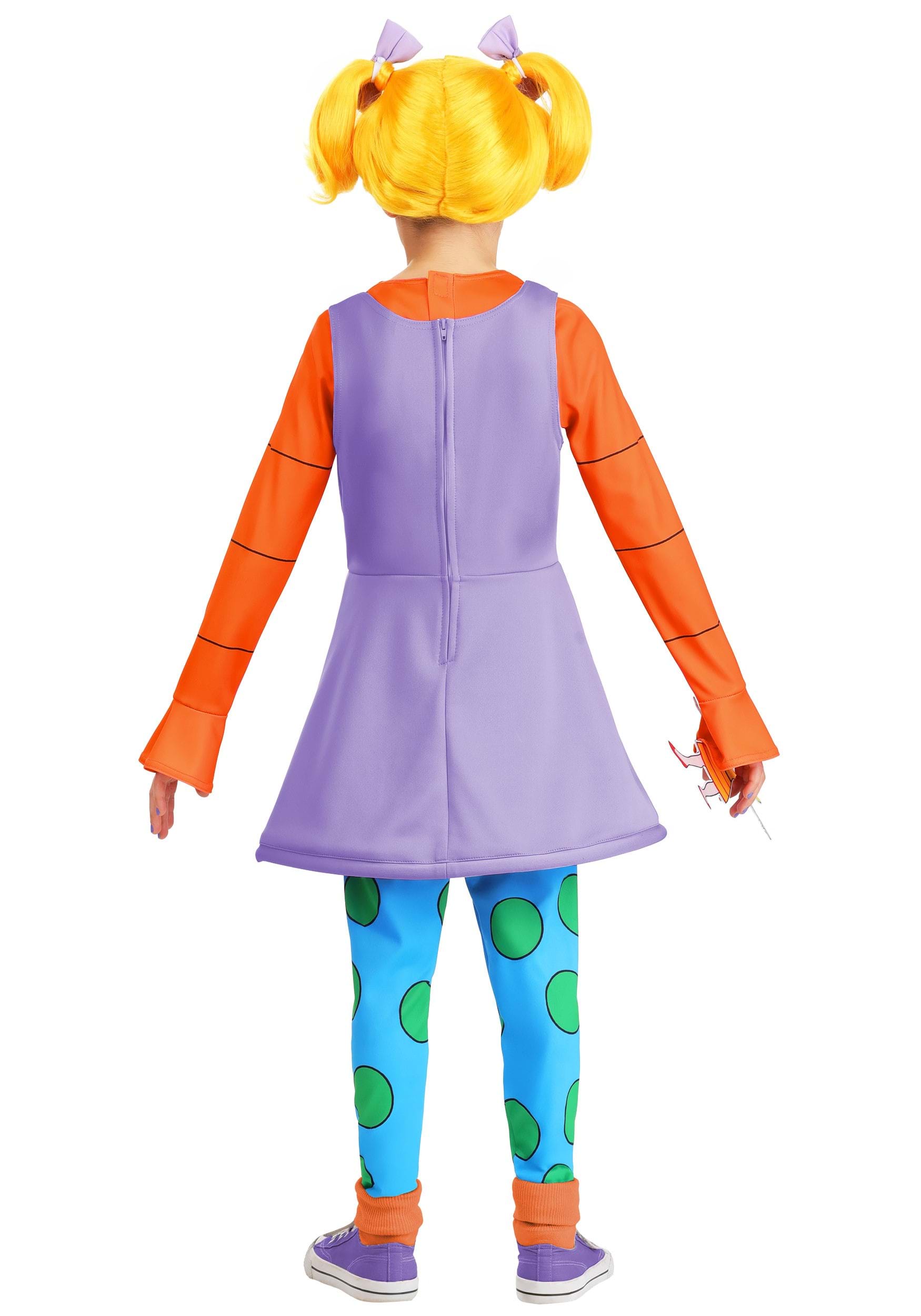 The costume includes a purple knit dress with an attached long-sleeve shirt underneath to match Angelica’s orange top from the cartoon. The blue leggings are printed with oversized green polka dots and have an elastic waistband for comfort and easy wear. Orange socks are included to keep the look on point from head to toe.