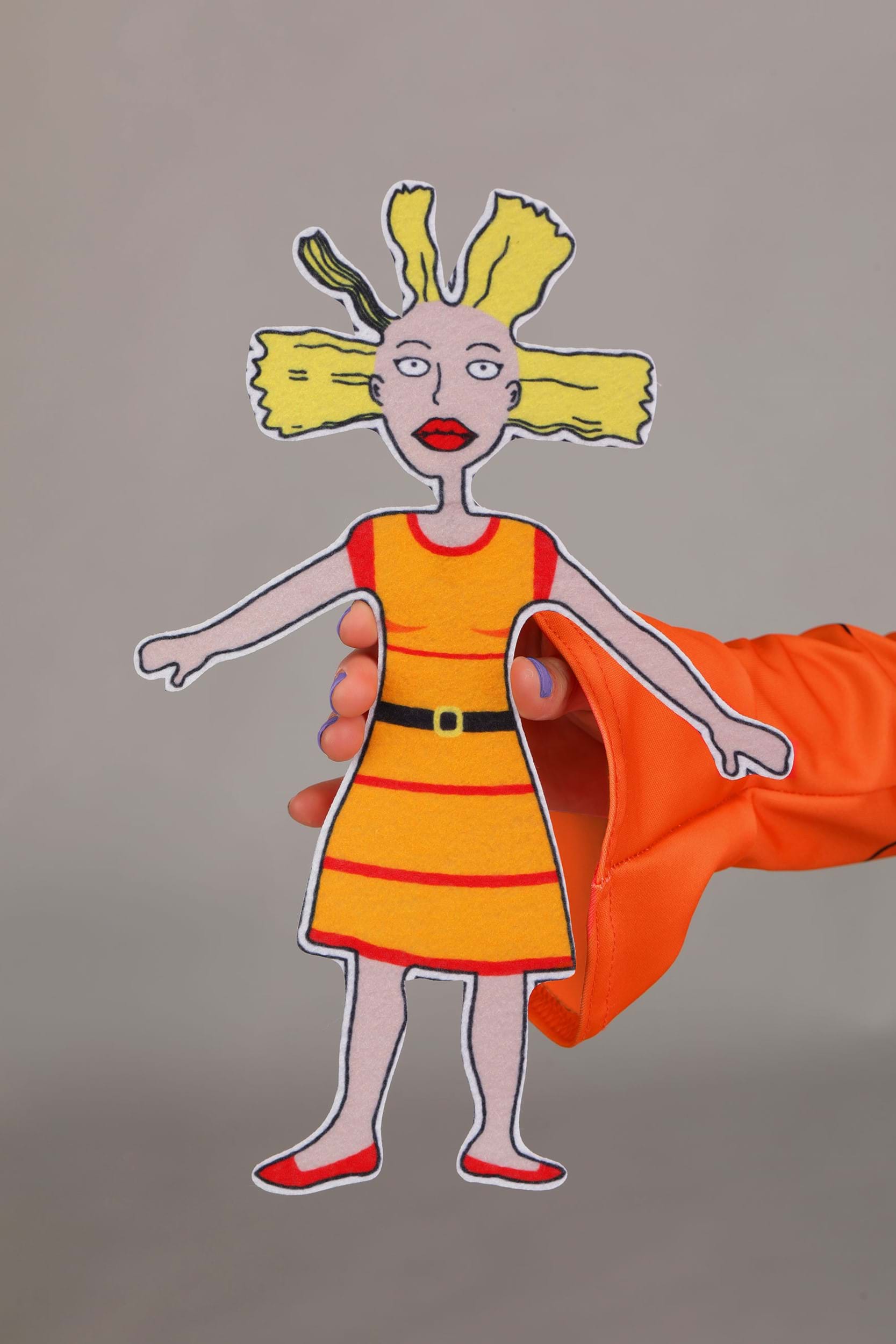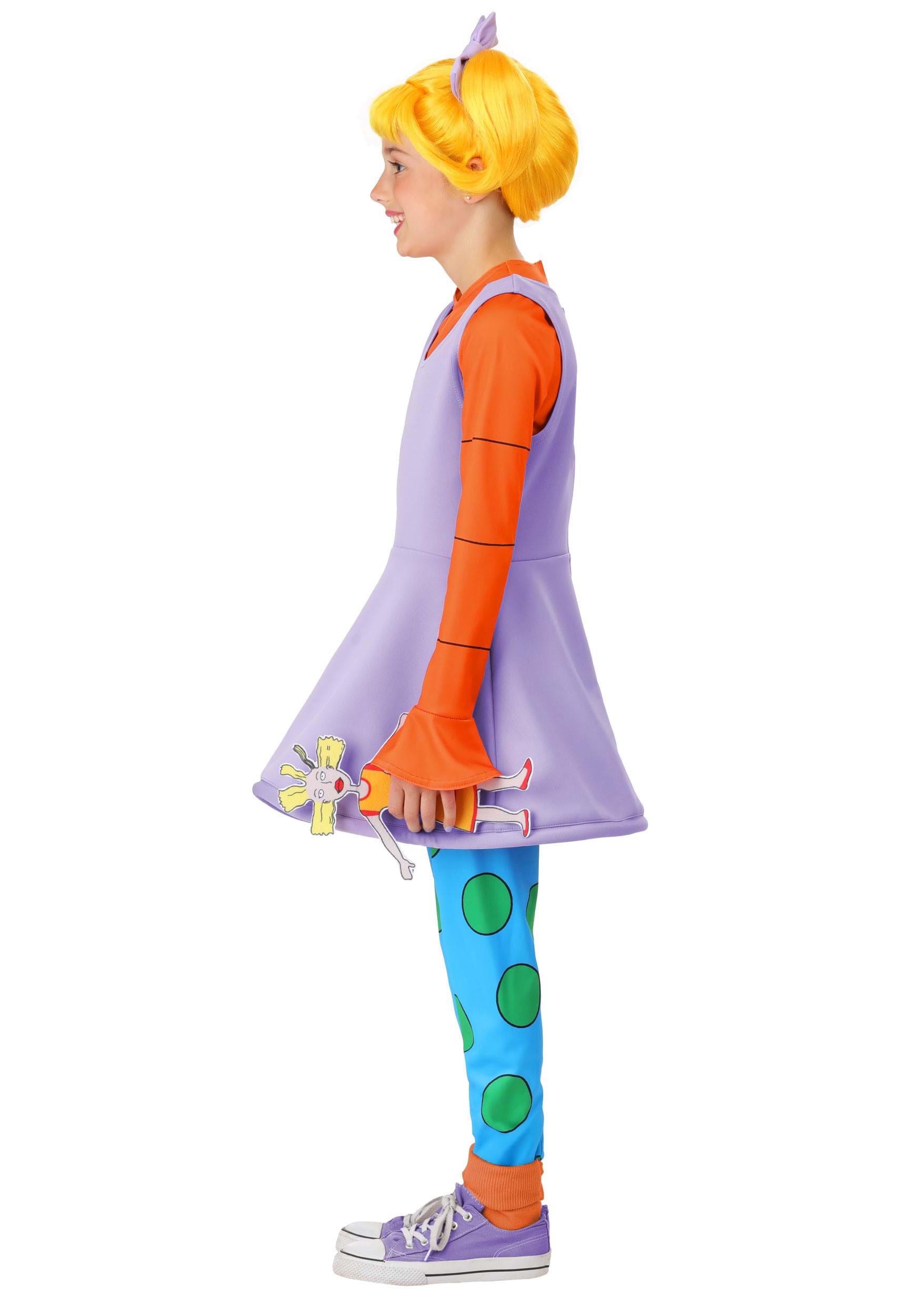 The costume also comes with a bright yellow wig styled into Angelica’s signature pigtails, complete with attached purple bows. It fits with an elastic cap that stretches for a snug but comfy fit. And no Angelica ensemble would be complete without Cynthia—her loyal, slightly distressed doll bestie. A felt version of Cynthia is included, ready to be tucked under one arm for dramatic declarations and nap-time negotiations.
