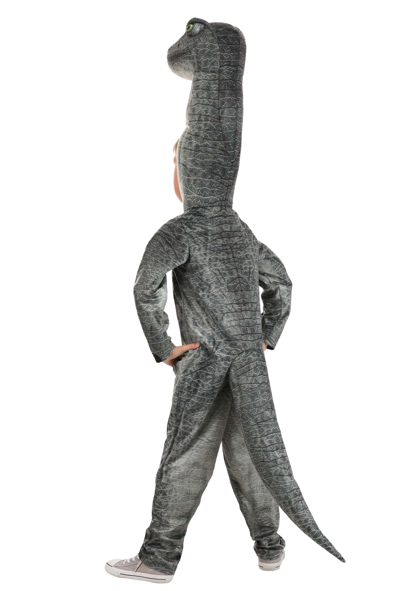 Dress as your favorite dinosaur when you wear your exclusive Brontosaurus Costume for Kids! The unisex jumpsuit zips up the front and is made of soft green velour that has printed and textured with dinosaur scales. A pointed same-material tail is stuffed with fiberfill and sewn to the back of the jumpsuit. The hood features a long stuffed neck with a hole cut into its base for your face to poke through. It's topped with a stuffed brontosaurus head complete with printed and soft-sculpted facial features.