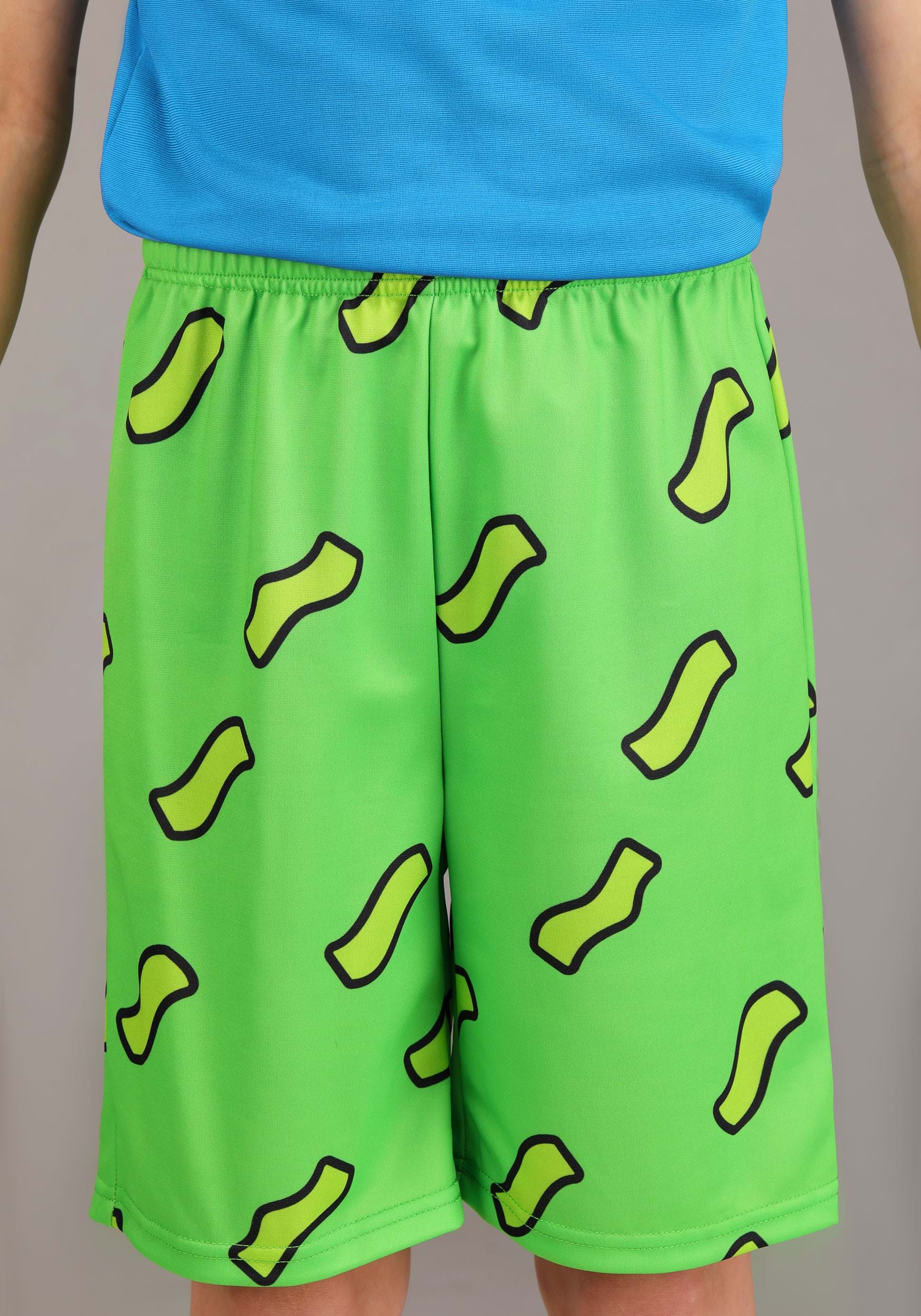 This four-piece costume is designed to mirror Chuckie’s look from the classic Nickelodeon series. The short-sleeved blue shirt features red trim at the collar and cuffs, and a big yellow-and-red planet printed across the front—because intergalactic fashion never goes out of style. The neon green shorts have an elastic waistband and a printed pattern that perfectly matches Chuckie’s on-screen ensemble.