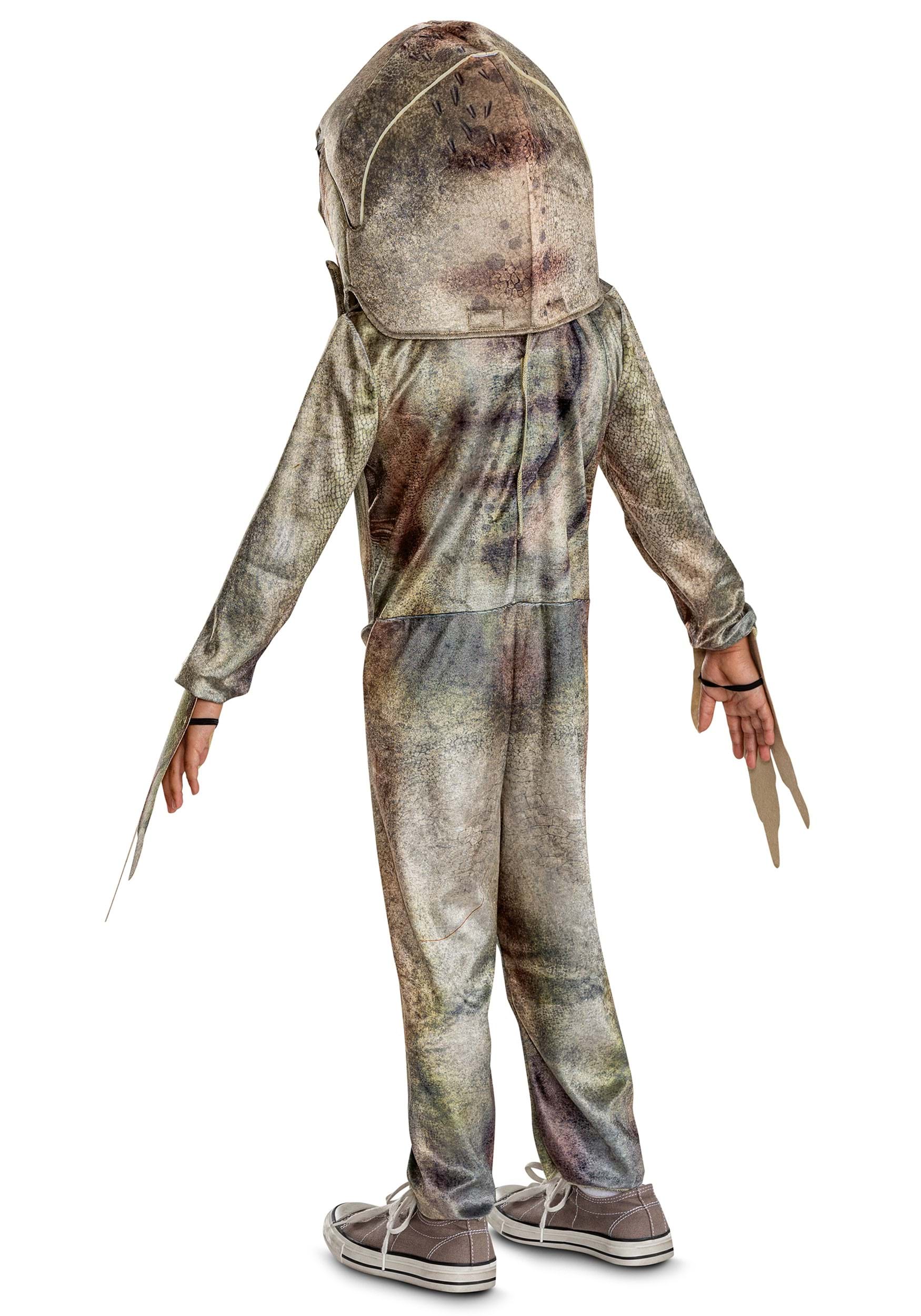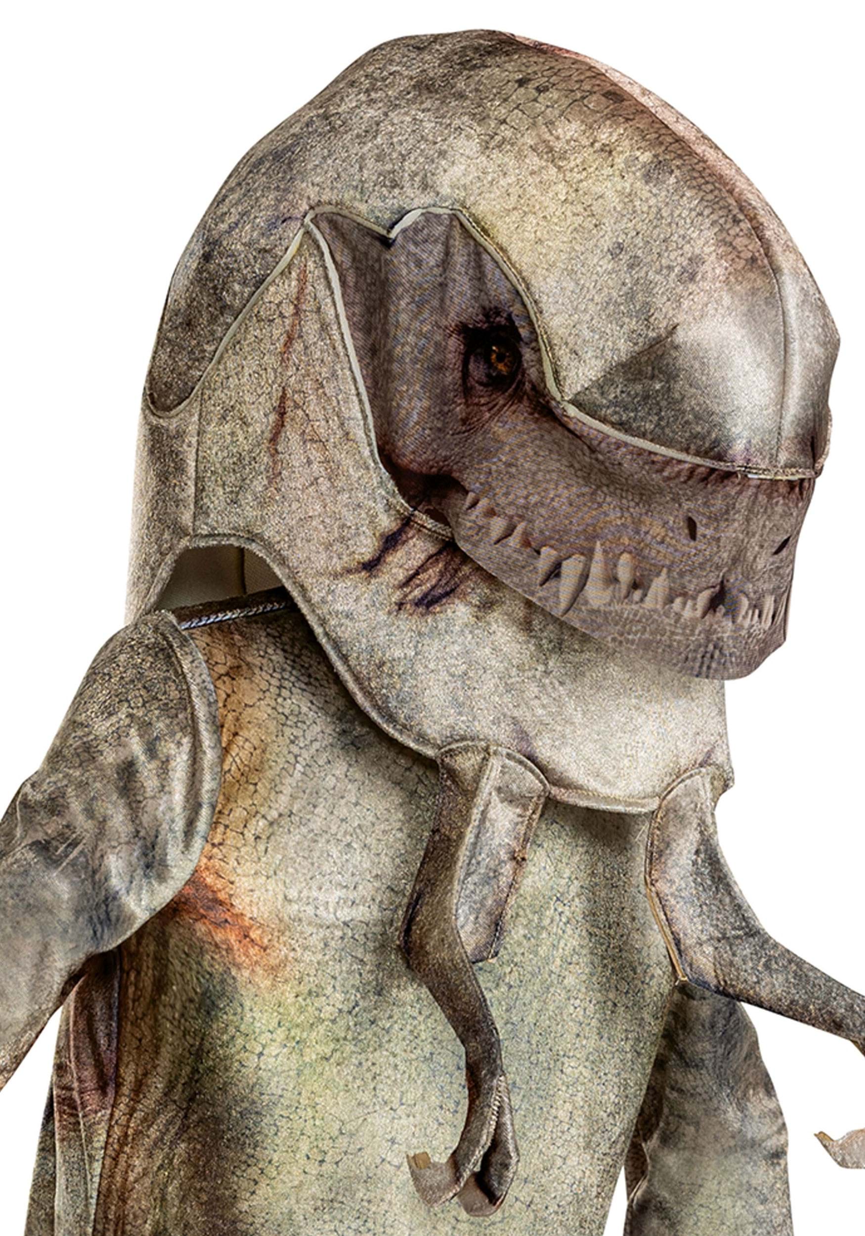 This officially licensed costume comes in two pieces: a printed jumpsuit with attached clawed hand covers, and a detachable oversized headpiece. The full-body suit features realistic scale textures in earthy tones, with shading and detail that make this dino look ready to burst out of an enclosure—or at least the living room.